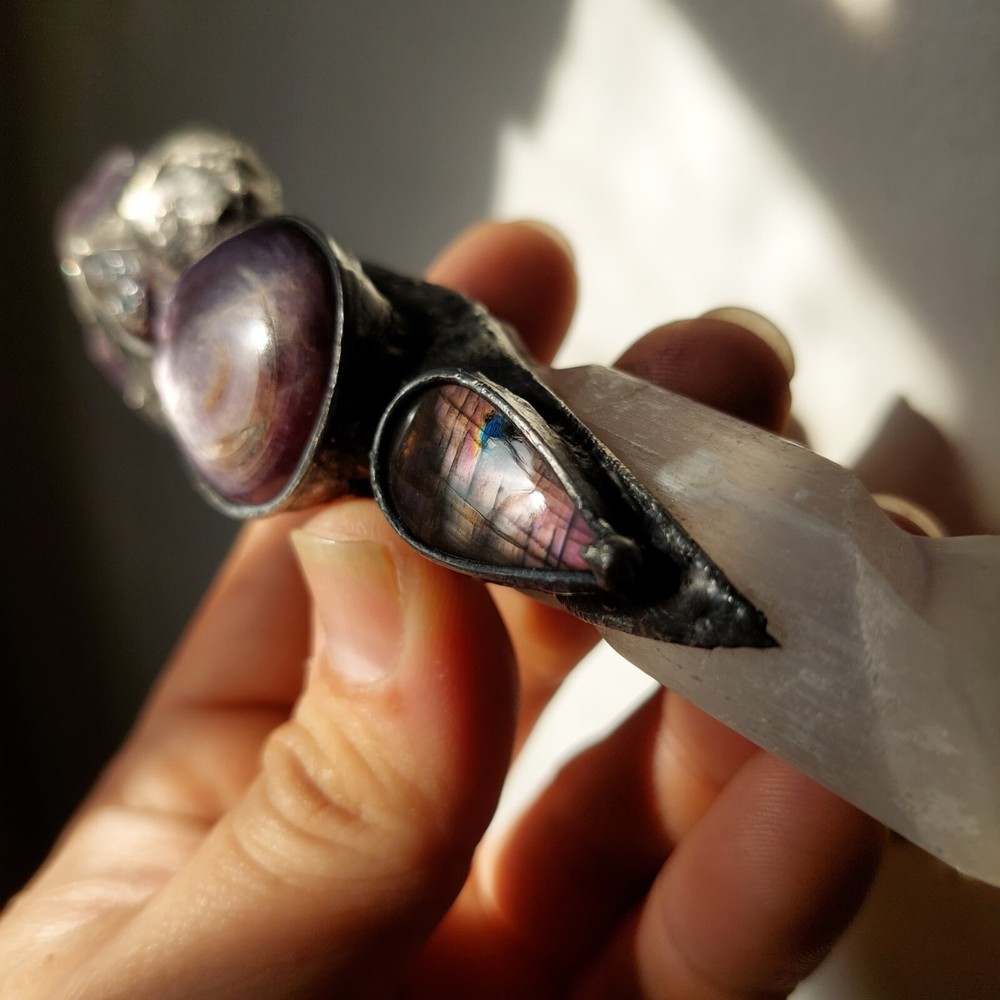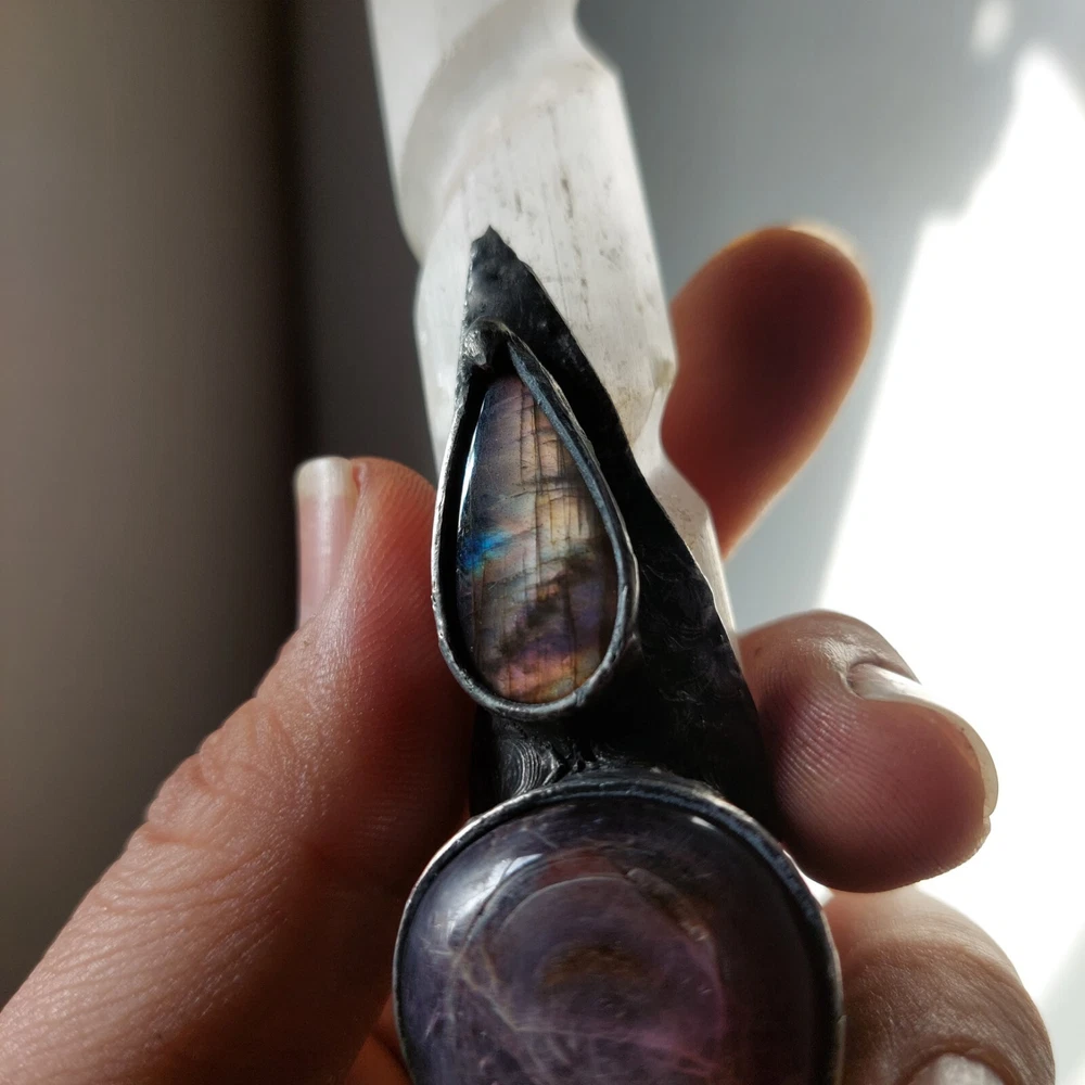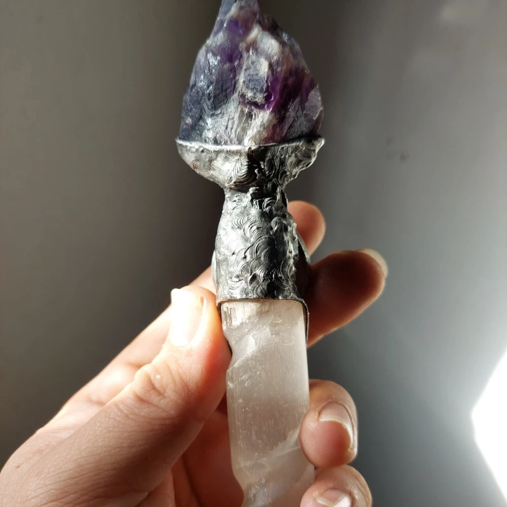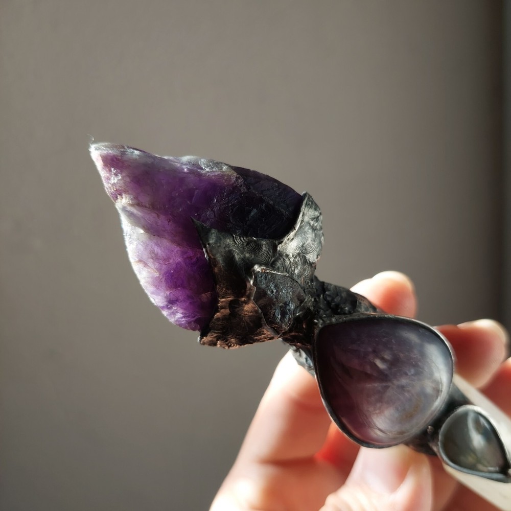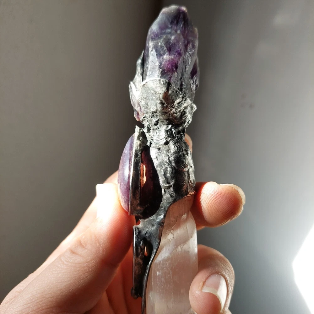 This is a gorgeous powerful healing purple wand for a high-priestess featuring, high-quality Gem Lepidolite, Purple Labradorite, dream amethyst on its crown on a satin spar(selenite) unicorn spiral horn, measures approximately 9-10". Jewelry is handcrafted with led free silver solder with a method called tiffany technique, using black patinas and a final polish to create an antique ancient magical feel to it. Wands are effective when working on the energetic and etheric levels of the body. The simplest way to work with wands on this level is to activate and balance the 7 chakra system. There is no physical contact with the body in this method so it is a great introduction for someone who is not used to energy work. Starting at the base chakra, spiral the wand in a clockwise motion to activate and balance this centre. Continue until you feel this chakra is balanced and move on to the next one until you have balanced all 7 chakras. This is a very simple yet effective way to use crystal wands to balance the body. Wands are also used to cast spells, create psychic shields, enhance or enchant jewelry and other objects. They may also be helpful in removing and destroying astral parasites, demons, and archons. You can deflect dark magic, curses or hexes and protect yourself from evil eye and evil witchcraft or evil entities, amongst many other useful magical deeds. Amethyst is a powerful and protective stone. It guards against psychic attack, transmuting the energy into love and protecting the wearer from all types of harm, including geopathic or electromagnetic stress and ill wishes from others. Amethyst is a natural tranquiliser, it relieves stress and strain, soothes irritability, balances mood swings, dispels anger, rage, fear and anxiety. Alleviates sadness and grief, and dissolves negativity. Amethyst activates spiritual awareness, opens intuition and enhances psychic abilities. Sometimes known as the lucky stone, satin spar brings good fortune to the bearer. It is a powerful calming stone that helps to clear confusion and brings clarity to the mind. It is extremely cleansing and never needs to be cleansed. A stone of transformation, Labradorite is a useful companion through change, imparting strength and perseverance. It balances and protects the aura, raises consciousness and grounds spiritual energies. Excellent for strengthening intuition - promoting psychic abilities. Powerful in revealing the truth behind illusions, Labradorite banishes fears and insecurities, and strengthens faith in the self and trust in the universe. It stimulates the imagination and calms an overactive mind, developing enthusiasm and new ideas. A “stone of transition”, Lepidolite assists in the release and reorganisation of old behavioural and psychological patterns, gently inducing change. It brings deep emotional healing, soothing and reducing stress and depression. Lepidolite dissipates negativity and insists on being used for the highest good. It activates the throat, heart, third eye chakras and the intellect. It opens the crown chakra, clearing blockages and bringing cosmic awareness. Lepidolite facilitates astral travel and accesses the Akashic Record. It helps to take you forward into the future, tuning you in to thoughts and feelings from other lives that are creating a blockage in your life now.