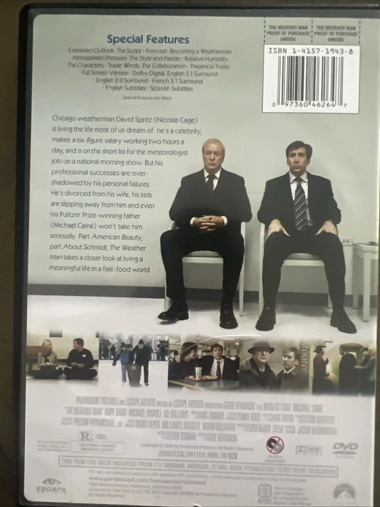 Get ready to experience the ultimate weather forecasting adventure with "The Weather Man" on DVD. Starring Nicolas Cage, Hope Davis, and the legendary Michael Caine, this 2006 drama directed by Gore Verbinski is a must-watch. Join the journey of a weatherman who can predict the weather with shocking accuracy but struggles with his own personal life. With gripping performances and a captivating storyline, this DVD is perfect for anyone who loves to watch movies that make you think. Don't miss out on the chance to own "The Weather Man" and add it to your movie collection today.