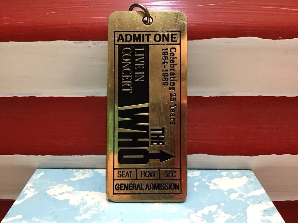 The product is a brass keychain featuring a novelty concert ticket design for "The Who 25 Years On Tour." This item is an original piece of music memorabilia related to the iconic rock band The Who. The keychain is a collectible item made in the United States, perfect for fans of rock and pop music looking to show their support for the band.