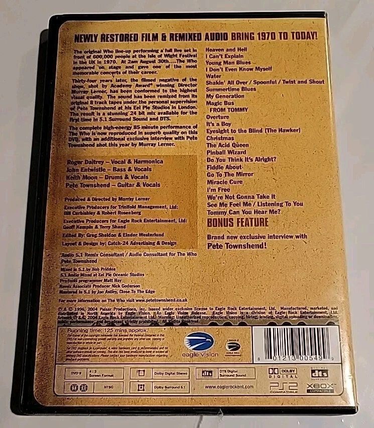 gtin13:0801213005499Genre:RockUPC:0801213005499Producer:Murray LernerRun Time:115 min.Director:Murray LernerSub-Genre:Music Video (Concert/Performance)Language:EnglishStudio:Eagle Rock EntMovie/TV Title:The Who: Live at the Isle of Wight Festival 1970Format:DVD