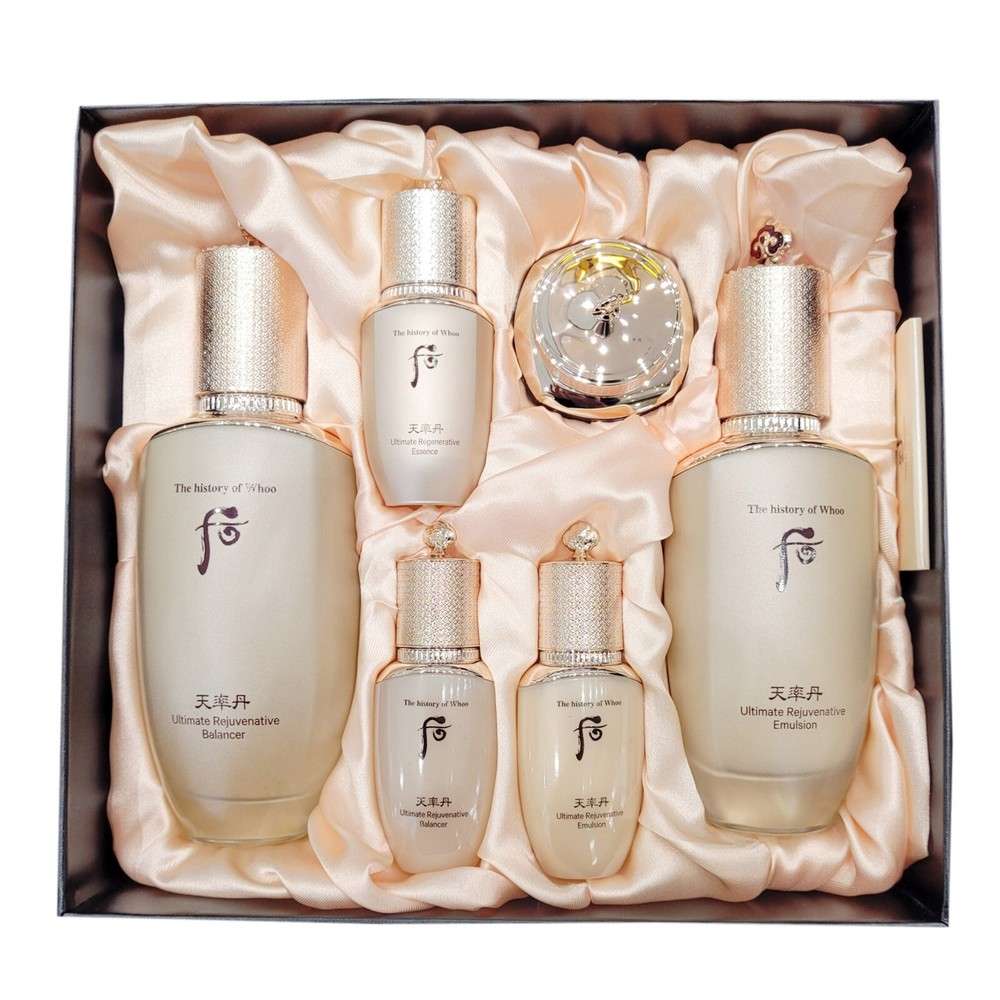 The History of Whoo Cheonyuldan Hwayul Ultimate Rejuvenating Skin care Duo Set Skin Type : All Skin Types #Elasticity # Anti-aging # anti-wrinkle # lifting # firming Set Contains Cheonyuldan Ultimate Rejuvenative Balancer 5.0 fl.oz / 150ml Cheonyuldan Ultimate Rejuvenative Emulsion 3.7 fl.oz / 110ml Cheonyuldan Ultimate Rejuvenative Balancer 25ml Cheonyuldan Ultimate Rejuvenative Emulsion 25ml Cheonyuldan Ultimate Regenerative Essence 8ml Cheonyuldan Ultimate Regenerative Cream 10ml Cheonyuldan Ultimate Rejuvenative Series contains HwaYul SeokGok Complex™ and Royal CheonChoHwa, has a significant increase in the synthesis of collagen and hyaluronic acid, improve skin moisture and elasticity, and achieve a more lifted look. It also adds about 24 kinds of CheonGiBiDan ingredients to keep skin moisturized and shiny. Meanwhile, Youth Connect™ technology is adopted to strengthen the anti-oxidant effect, which can revitalizes the skins while adding moisture and radiance. ---------------------------------------------------------- * Shipping Your order will be dispatched within 2-3 working days of receiving payment (Monday-Friday).In the very unlikely event that your item is lost or damaged during post, then WE are responsible and will issue either a full refund or replacement.All products made in Korea will be shipped by Korea Post.Your address will not be changed after shipment and should be pay attention of correct address before placing order. Shipping period Standard int'l Shipping ( Tracking No. available ) Delivery time 5-15 days : Asian countries 7-25 days : U.S.A North America 10-30 days : European and other countries The duration does not include weekends and can be changed depending on other potential delays such as custom clearance. * Customs and Duties Import duties, Taxes, and hidden charges are not included in the item price or shipping cost.These charges are the buyer's responsibility.We are not responsibility of any tax to clear customs but will try to help ship U.S.A and European countries. * Return You can return your purchase for a refund or an exchange for any reason within 15 days after receipt of your shipment.Please note that the item must be returned in its original condition, not worn or not used. All return shipping charges must be paid for by the buyer.If the item you received was wrong or defective we will pay for shipping charges.Please contact us prior to shipping the item back. * Contact us If you have any questions or any special comments, please contact us via eBay messaging. We will do our best until you are satisfied. We truly appreciate your cooperation.