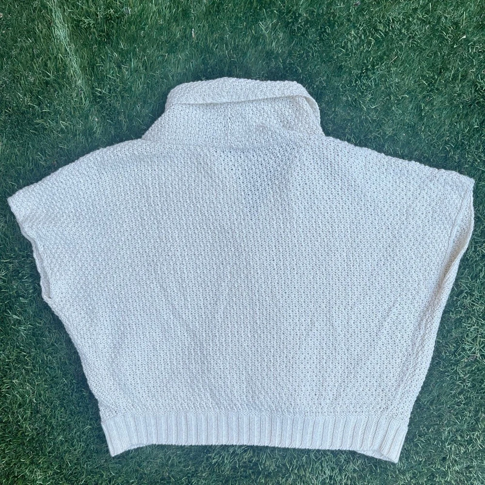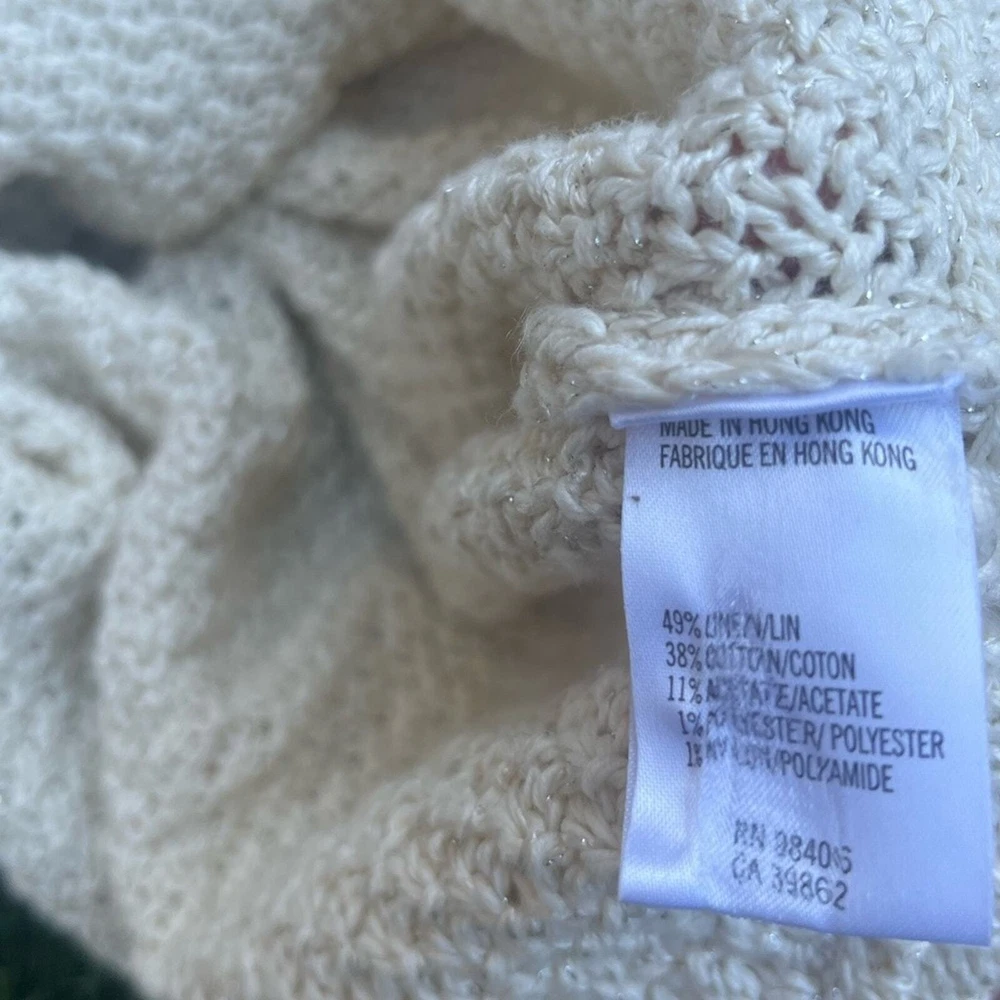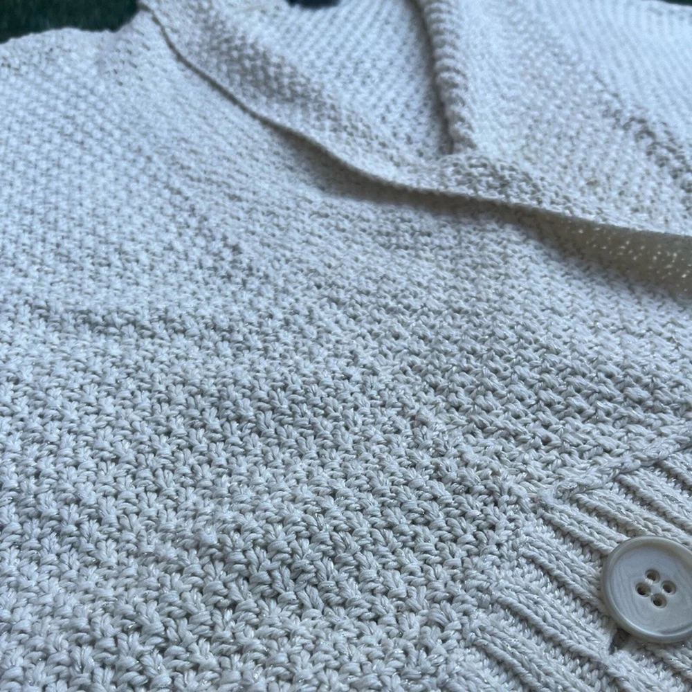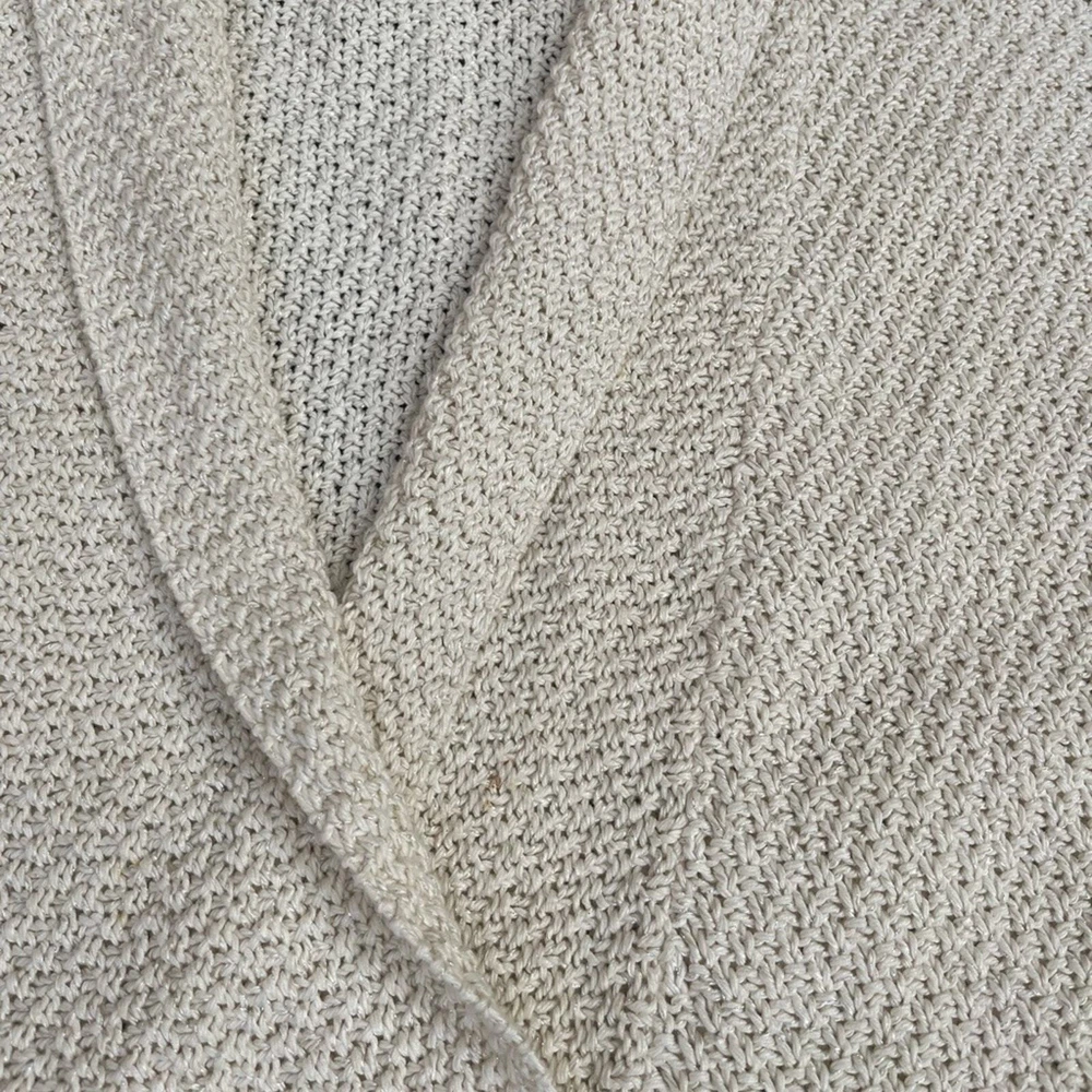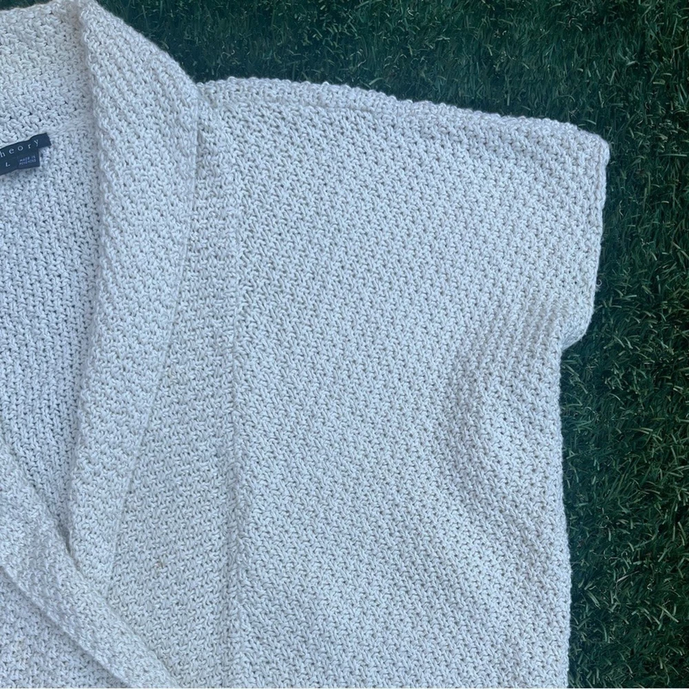 Pre-owned Shawl Sweater Top by Theory. Creme off white in color, with a silver detail weaved within the knit. Size L in women. Measurements: Pit 2 Pit: 30 inches Width at waist ( sweater bottom) 22 inches Length from shoulder to bottom hem: 22 inches Good pre-worn condition. Overall Clean, with no major stains or marks on the sweater. Cable knit weave is in good condition, no holes or snags. all of the seams are in good condition, no fraying thread. buttons are attached and functional. Review all photos for more details on tops condition. Beautiful detail in the collar, blazer like neckline, and three chunky y2k 90's buttons for a bottom closure, batwing sweater style. Shoulder drop sleeves for an oversized boxy crop look that is great for business casual, holiday and new years outfits, or a lovely layer over a dress. Made of a Linen Cotton Blend, however there is a very heavy weight to the garment. Much like a wool sweater. See tag for fabric content details. Retailed $268