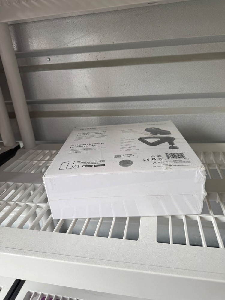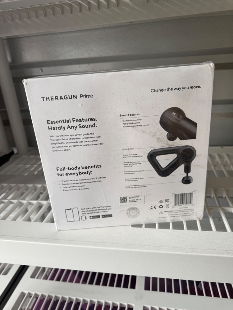 Therabody Theragun Prime Smart Percussive Therapy Device. Pre-owned. Box shows visible wear, dirt marks, and corner damage as shown in photos. Please review pictures closely for cosmetic condition. Device appears complete in original packaging. Features: • 16mm deep muscle treatment • 5 speed settings • Bluetooth app connectivity • Ergonomic triangle handle • QuietForce Technology • Up to 120 minutes battery life Great for muscle recovery, soreness relief, and daily tension. Includes original retail box. See photos for exact condition and contents.