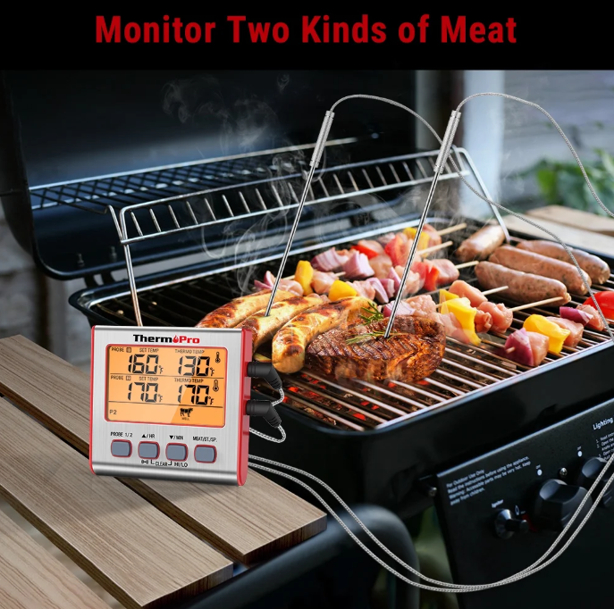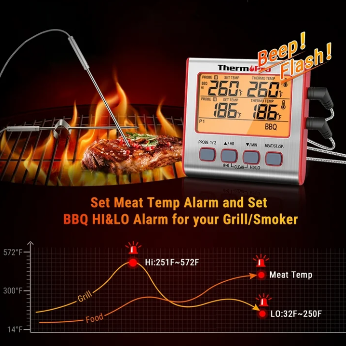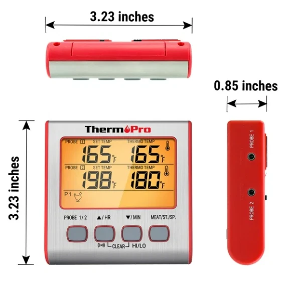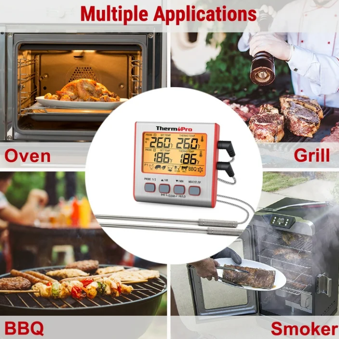 Dual Probe Dual stainless-steel probes with steel mesh cable to measure and monitor temperatures of two pieces of meat or two sections of the same large piece of meat simultaneously. Preset Temps Programmable alert with preset temperatures recommended by USDA for specific foods. Alarm BBQ/Oven Hi/Low Temperature monitor and alert to ensure your BBQ/OVEN temperature is always within your set range. Timer 99-hour and 59-minute countdown timer and count up timer. Backlight Function Makes the screen easy to read in low light when activated, and automatically turns off after 10 seconds. Large Screen with Large Numbers 3" large LCD display with large numbers makes it really easy to read Magnetic Backing & Tabletop Design Magnet on the back can be attached to the refrigerator or any metal surface;the meat thermometer features a kickstand and sets the device upright at an easy-to-read angle. Long probe cable 40" durable food grade stainless steel probe with step-down tip design to get temperature more precisely and quickly; Probe wires are rated for 716°F. Product Description The ThermePro-TP17 grill thermometer equipped with dual-probe technology and comes with 2 stainless steel probes that can be used to read TWO types of food at the same time, making this device extremely convenient when rushing around cooking family dinner on Christmas or Thanksgiving. With the STEP-DOWN probe tip design and backlit LCD display, receiving and reading an accurate temperature is simple even in the darkest of conditions. Either place on your counter with the flip out stand or magnetize to a metal surface, be it a BBQ or oven. Don't worry about losing track of time on those vegetables as this cooking thermometer also contains a timer. Lastly, if you aren't a pro in the kitchen or need a little assistance, we include preset temperatures . ThermoPro Digital Meat Cooking Thermometer sepecifications: Temperature Range: 14˚F to 572˚F (-10˚C to 300˚C) Temperature Accuracy: ±1.8°F (±1°C) from 32 to 212°F (0 to 100°C) Resolution: 1° Temperature Unit Display: °F / °C Switchable Probe Length: 8.5" food grade stainless probe Cable Length: 40" stainless steel mesh cable Battery: 1 x AAA battery Screen Size: 2.5" × 1.5" Dimension: 3.2 x 0.8 x 3.2 inches Uses: BBQ, Oven, Smoker, Candy, Meat, Food Package Contents: - 1 x Digital Meat Thermometer - 2 x stainless steel probe - 1 x Manual - 1 x AAA battery Important Notes/Warning: 1, This product is not for use in microwave ovens. Keep out of reach of children. 2, Do not touch hot probe or wire with bare hands or just after cooking. 3, Always wear a heat-resistant glove. Do not expose probe directly to flame. Doing so will cause wire to deteriorate. 4, When not in use, slide the mode selector switch to the OFF position to conserve the battery. 5, Do not let probe or cable come into direct contact with the oven elements, as this will result in faulty readings and/or damage. Payment 1. We only accept PayPal payment. 2. Please make sure your eBay address is correct. 3. Payment is required within 7 days at the end of the auction. Delivery details 1. Orders are shipped out within one business day (Sat.& Sun. excluded.) after your payment has been cleared. 2. Local pick up is not available. 3. The shipment usually takes 2-5 business days (Saturday and Sunday excluded). If you need the item urgently, please contact us for detail before purchase. 4. We are not responsible for an undeliverable address. We reserve the right to charge the shipping fee again for returned items due to wrong address. 5. Customers in Porto Rico, Alaska and Hawaii are recommended to contact us for shipping details (shipping cost & time) before placing an order. Return * This product comes with a 30-Day Money Back Guarantee, no restocking fee. * Please make sure the return item includes the original packaging, all accessories and user manual, etc. * If you receive an item and it doesn't work properly, please contact us first, our Customer Service Representative will follow up and solve it for you! * If you don't like the item, buyers pay return shipping fees on their own cost to return products for exchange or refund. * When we're at fault, we pay the shipping on returning items. Refund will be made upon receipt of the returned item. Shipping and handling fees are non-refundable. * You must contact us to request a RMA written on the outside shipping box or on the return label before returning the item. Warranty * This product has a 1 year manufacturer warranty. * Our warranty does not extend to any products that are physically damaged or that are not under normal operating conditions as a result of misuse or improper installation on the buyer/user's part. Contact us * Customer satisfaction is very important to us, we are always about providing quick and efficient service. * If you have any questions or concerns, please reach us via eBay message.