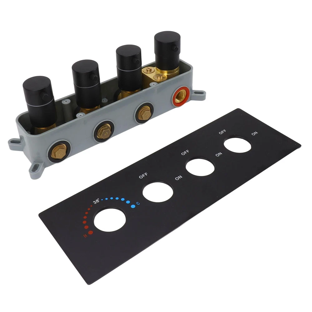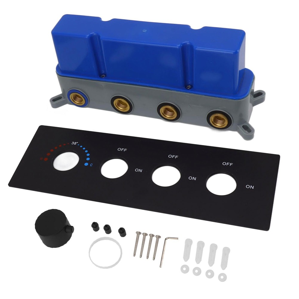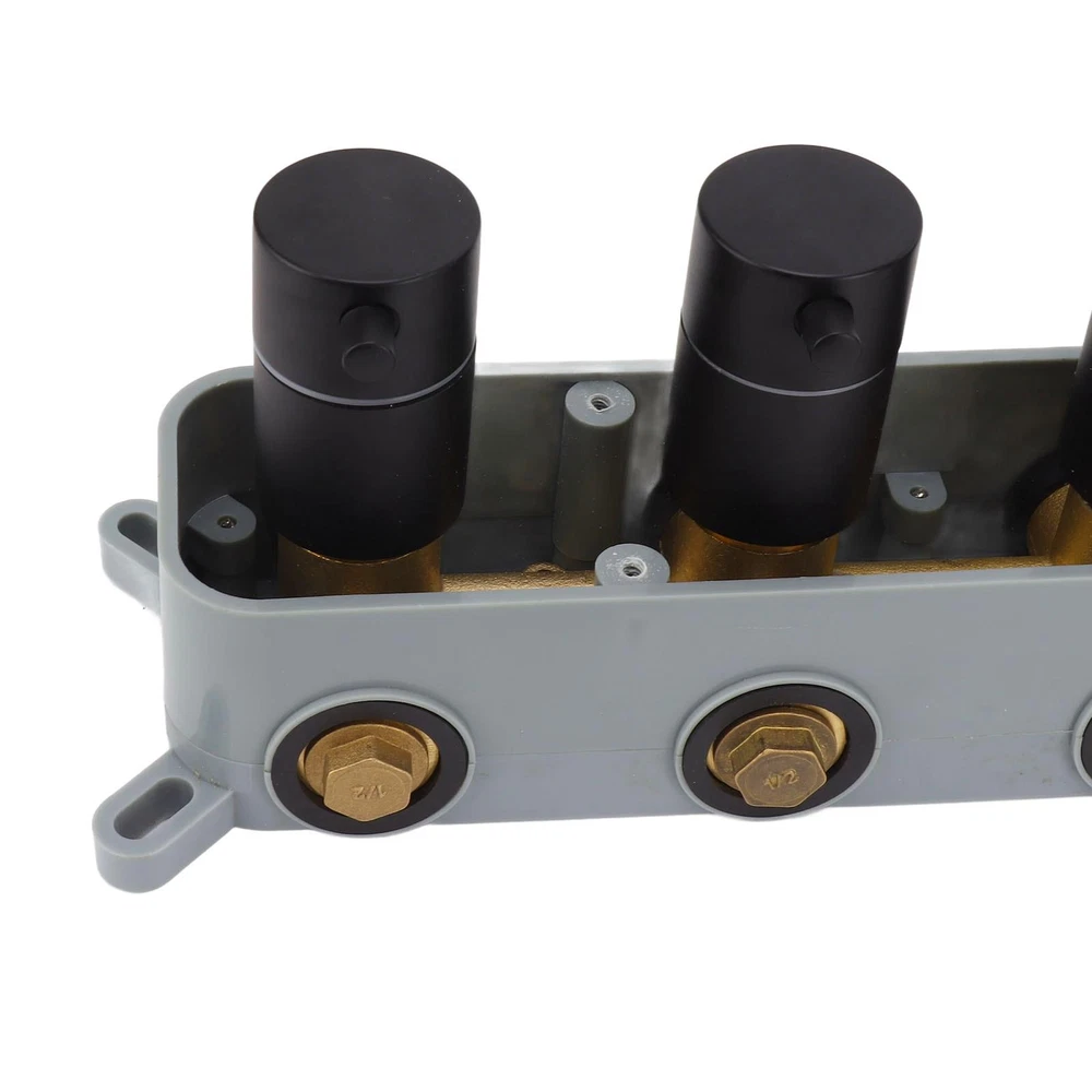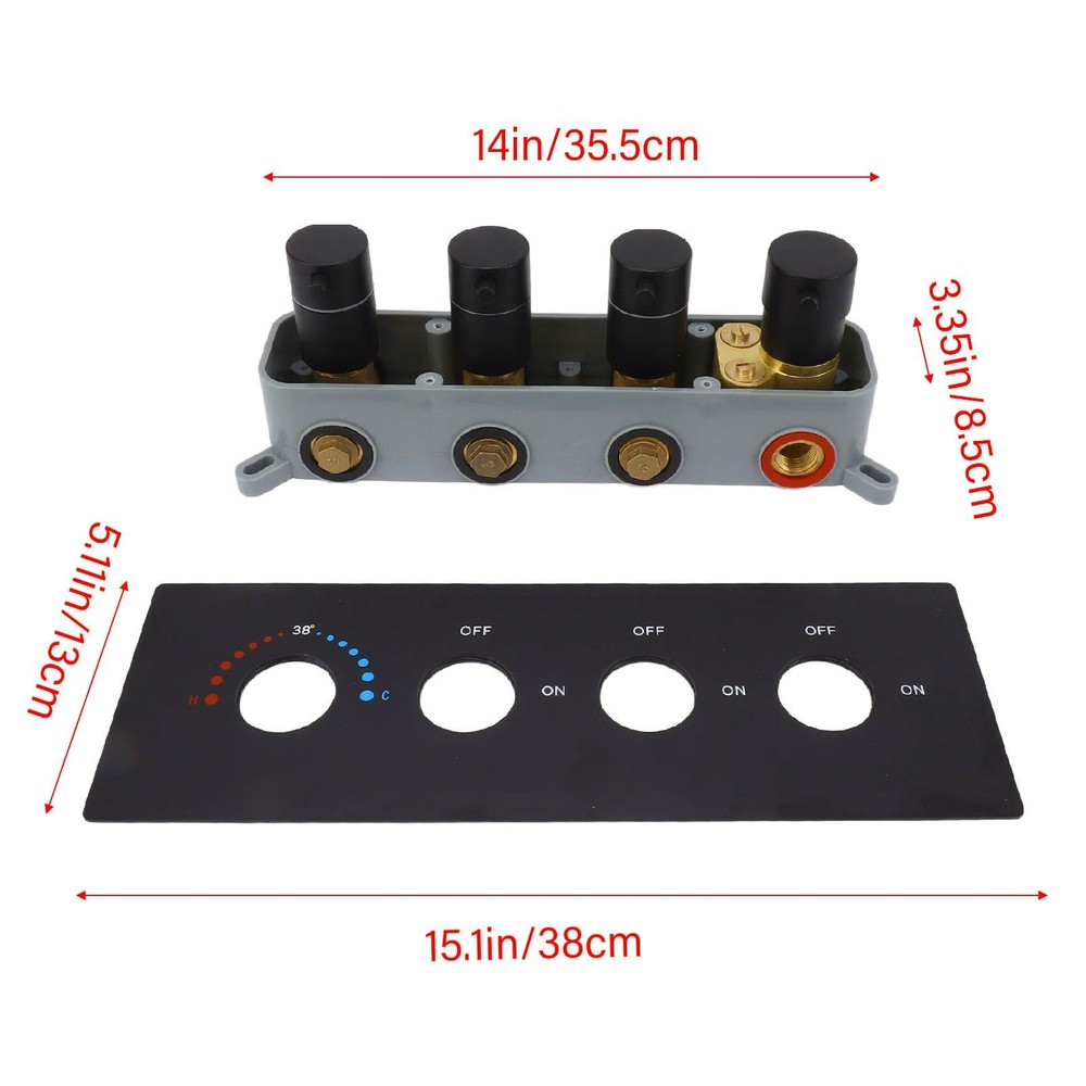 Featrues: 1、Accurate Temperature Control: This shower diverter has accurate temperature control, which can prevent you from scalding when you son ah shower. 2、3 Outlet Design: This rain diverter features a 3 outlet design with a 3/4 inch hot and cold water inlet and three 1/2 inch outlets. 3、Knob Switches: This shower diverter features a knob switch that works independently. You can choose to use one or more items at a to enjoy a full body shower from all angles and enjoy an energizing bath. 4、Excellent Brass Material: This rain diverter is made of excellent brass material, which is sturdy and wear resistant, not easy to erode, and has a service life. 5、Black Matte Finish: This shower diverter features a black matte finish for a simple and elegant appearance that will look great installed in your bathroom. Specification: Item Type: Shower Diverter Material: Brass Inlet Connection Size: Approx. 0.75in/1.9cm Inlet Connection Type: 3/4 Inch NPT Female Thread Outlet Connection Type: NPT Thread Ports Number: 3 Outlet Connection Size: Approx. 0.5 inch/1.27cm Package_list: 1 x Diverter 1 x Panel 1 x Adjustment 1 x Seal 3 x Accessory 1 Bag x Fittings 1 x Hex Wrench