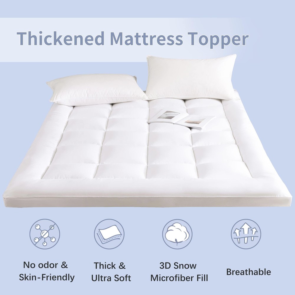 ☁ Sleeping on The Clouds:This Cal King size mattress topper with 3D ultra-soft down alternative filled has unparalleled comfort and supreme softness.This hotel quality mattress pad is super soft,fluffy and plush,providing great support for our body,relieving the pressure points.It offers a plush and cozy feel that will help you relax and drift off to sleep. ⬆ Extra Thick&FLuffy:72"x84"x18".Our cal king mattress cover with thickened down alternative filling offers super elasticity and support.More soft and comfortable than ordinary bed topper.Adopting the deep pocket design which will easily stretch up to 18 INCHES with elastic fabric.Easy to put on and won't move around. 🛡 Hypoallergenic&Durable:The completely clean production process ensures the cleanliness of this mattress topper.Hypoallergenic and available to sensitive skin.The square jacquard of mattress pad prevents the padding from running around and distributes it evenly.Our mattress pad cover is super durable. 💠 Machine Washable&Easy Care: This mattress topper will protect your expensive mattress.The mattress cover can be cleaned in the washing machine at low temperature.Tumble dry on low.Economical and sustainable.No fading,shrinking,tearing,or lumping.after opening the vacuum package,please spread it for a Few hours Before using the mattress pad.