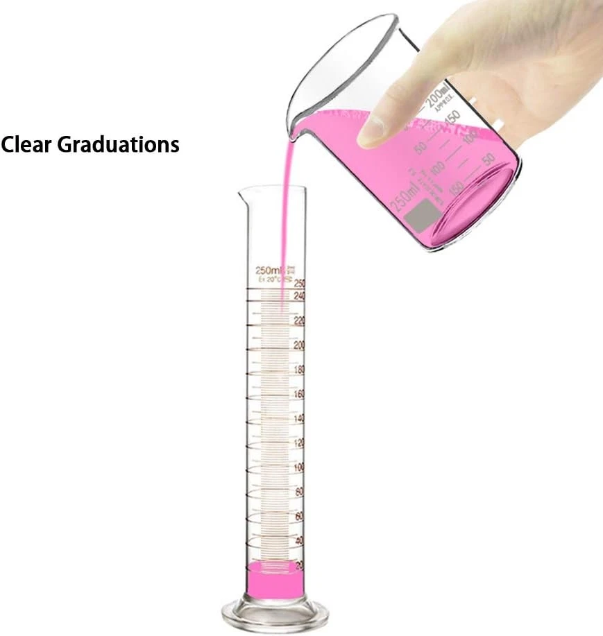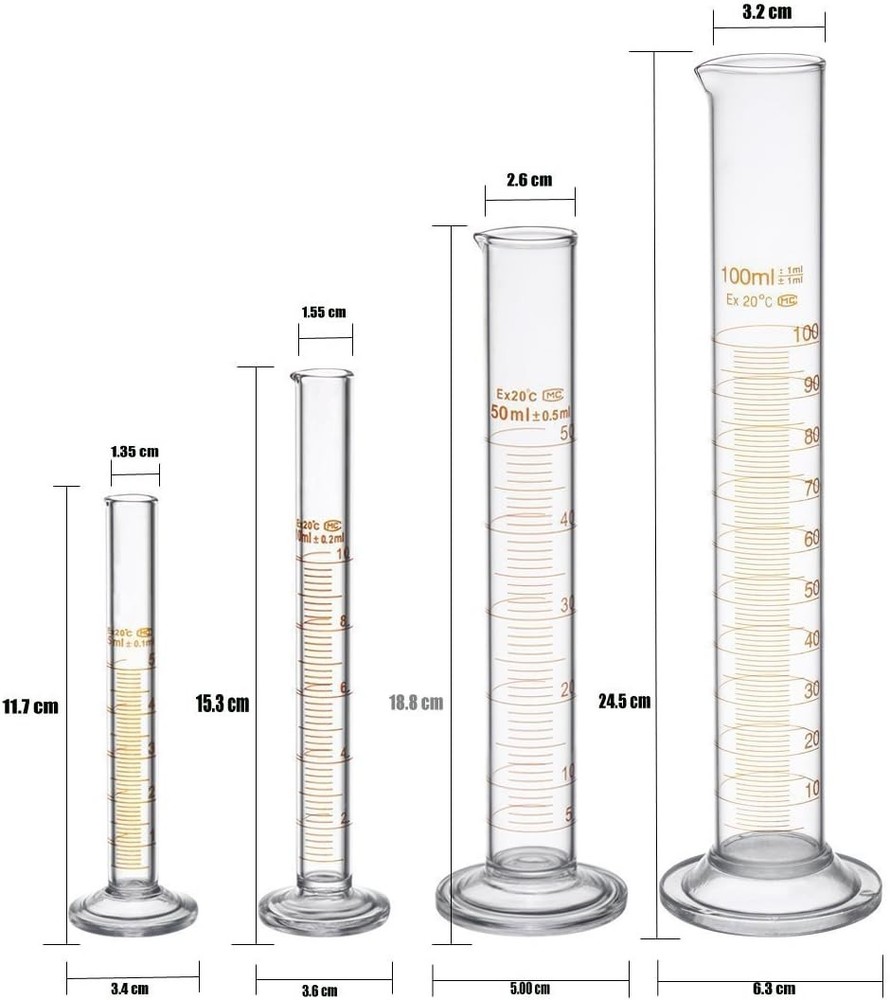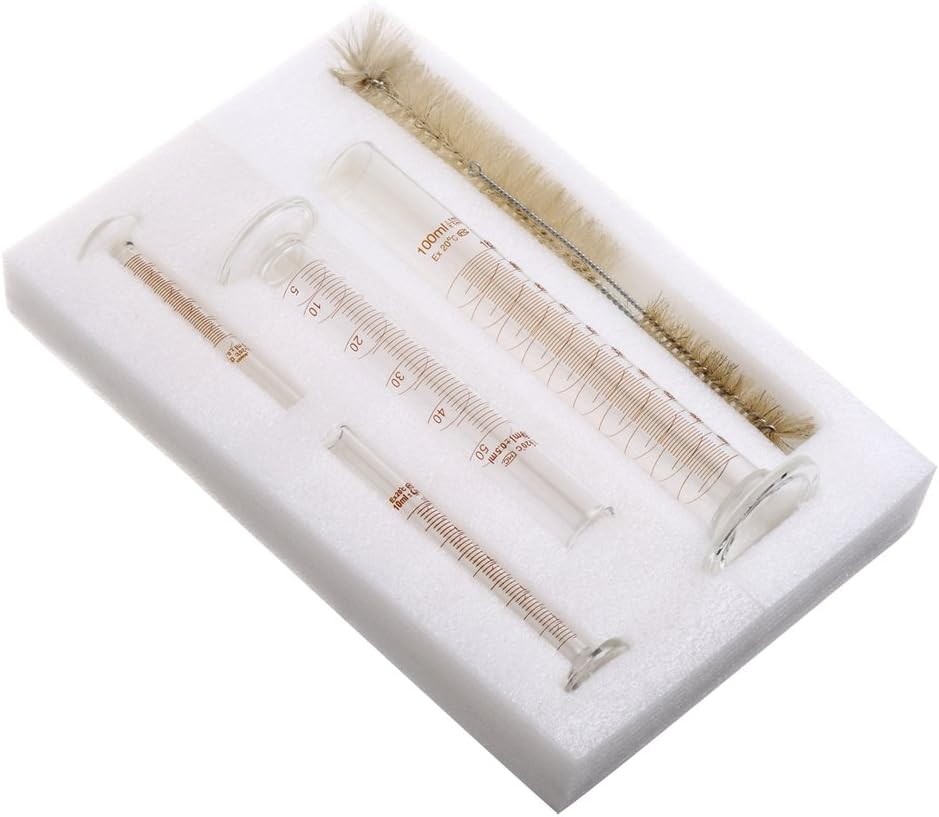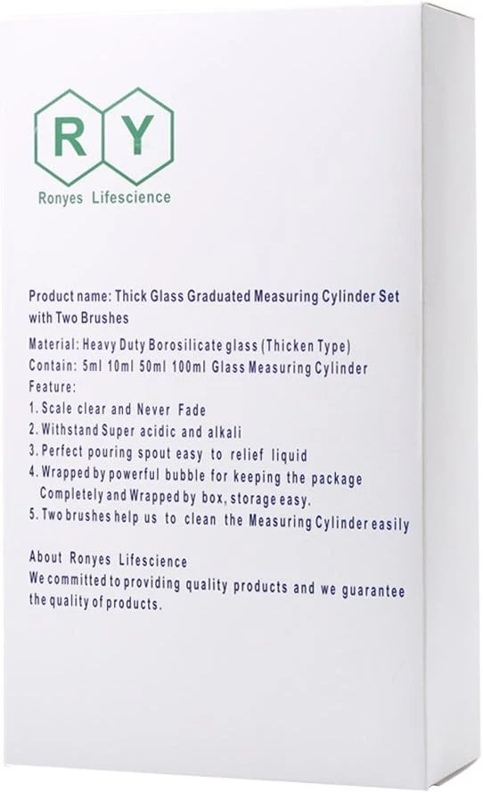 Thick Glass Graduated Measuring Cylinder Set 5ml 10ml 50ml 100ml Glass with Two Brushes Product Details Package Dimensions: 12.5 x 7.31 x 3.4 inches Item Weight: 14.4 ounces Item model number: BLLTTZ Is Discontinued By Manufacturer: No Manufacturer: Ronyes Lifescience Brand: Ronyes Lifescience Has Self-Timer: No Made of heat resistant borosilicate glass. Heavy duty reusable single metric high quality Wide rim and tapered pouring spout. 3.3 borosilicate glass Wrapped by powerful bubble for keeping the package completely Measure and mix ingredients cylinder set include 2 different size brushes, 3 glass droppers. Small one is for 5ml 10ml 50ml,longer brush is used for cleaning 50ml&100ml cylinders,smaller brush is used for cleaning 5ml&10ml cylinders,right brush is more easier to clean the different cylinders