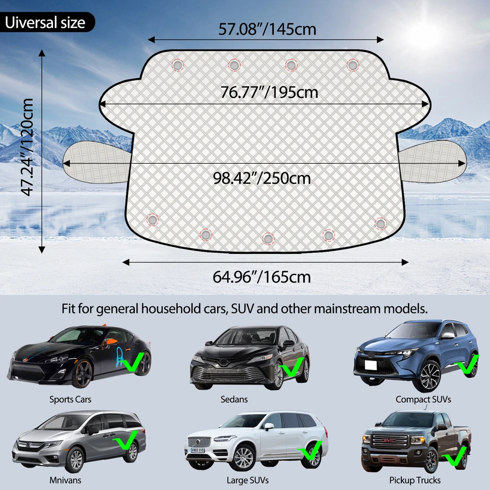 Thick Winter Car Windshield Cover Protector Snow Ice Rain Frost Guard Sun Shade; Features: 【Premium Protection】 : Windshield snow cover can protect your car windshield and 2 side mirrors from snow, ice, frost, freezing rain, debris from tree,sunshade etc, Saving your time by no more scraping ice and snow in harsh winter mornings. This windshield visor prevents the dashboard from fading and cracking in the sun and keeps the interior of the car cooler in hot weather. 【Thickened Material】 : The windshield snow cover is made of 5 layers of thickened, high quality material. In addition, the magnet and elastic edge design make it fit tightly to your car and the car cover does not blow away easily. The magnet is covered with a soft non-woven fabric that effectively protects the windshield wiper. 【Easy to Install】 : Clip the wings of the windshield cover to the door and secure the elastic band, which not only prevents it from being blown away by the wind, but also prevents theft. When you don't need to use the snow cover, it can be easily folded into a compact pouch for easy storage. 【Fits Most Cars】: The universal size is suitable for almost all vehicles such as SUVs, trucks and vans, etc. Our windshield snow cover completely covers the windshield and wiper to prevent it from freezing and clogging. Specification: High quality,100%Brand New! Material : PEVA Aluminium Foil, Composite Cotton, Non-woven Lining Color : Silver Closure Type : Magnetic Product Size: about 165*120CM Package: 1 x Windshield Cover We accept Paypal and majoy credit cards payment When you place an order, please choose a shipping method and pay for the order including the shipping fee within 48 hours. And please make sure your current address correct after your payment within 1-2 days! About Shipping 1. Receiving time = Processing time + Shipping time 2. Processing Time: Around 1-3 Days 3. Shipping Time: 15-26 Days By Air Mail 3-10 Working Days By Express We do not guarantee delivery time on all international shipments due to differences in customs clearing times in individual countries, which may affect how quickly your product is inspected! Important Notice >Transit Time Is Best Estimated But NOT Guaranteed As Transit Time Varies >Orders may be subject to import taxes, customs duties and fees levied by the destination country.Additional charges for customs clearance must be fulfilled by the recipient; We no control over these charges, nor can we predict what they may be. 100% Customer Satisfaction Is Our Top Priority For Any Reasons You Are Not Satisfied With The Products Within 30 Days Of Purchase, Return Or Exchange Can Be Issued, Customers Are Responsible For The Return Shipping Cost And Subsequent Replacement Shipping Cost For An Exchange Item. Replacement Item Will Be Processed And Shipped Upon Return And Inspection Of The Original Item. Return Items Must Be In Their Original Packaging And Unused Condition, Or They Will Be Rejected And Sent Back To You. Due To The Nature Of The Products We Sell, We Carefully Inspect All Packages Prior To Shipping. All Of Our Products Are Sold As Brand New, All Damaged Products Are Considered Damaged During Transit. If You Received A Damaged Or Broken Item, Please Save All Packaging Material And Paperwork And Contact Us Immediately So We Can Help You With The Damage Claim With The Shipping Carrier. No Claims Will Be Honored After 14 Days Upon Item Receive. Digital Photos Will Be Required For All Cases. All Products Come With A 60 Days Limited Warranty Against Manufacturer’s Defects. No Exchange Will Be Issued On Products That Have Been Damaged In Any Way. Warranty Does Not Applied To Improper Installation, Water / Fire Damage, Modification, Or Any Acts Of Nature . If you have any question or concern, please feel free to contact us via eBay massage directly, we will get back to you as soon as we are available ATTENTION : We do not answer any emails over the weekend Please send message to us.We will reply your message in 24 hours, Our working time: 9:00 AM-22:30 PM (GMT+ 08:00 Beijing) 1:00 AM -14:30 PM (GMT+ 00:00 London) 19:00 PM-08:30 AM (GMT- 06:00 USA/Canada) Why Choose us? 1. A tremendous variety of products-- With over 200,000 items in stock, we are one of the world's largest online stores in automotive aftermarket product sector. You'll have more choices than what you can ever imagine. What's more, we're updating with over 100 new arrivals per month! 2. Affordable prices -- we are offering the latest car parts and accessories for almost 20 years, we're always keeping up with the newest trends, while most importantly, making the prices as low as we can. 3. Free worldwide shipping -- Yep, you won't believe that you'll enjoy free worldwide shipping with us (unless stated otherwise),it's not a joke,but an absolute truth. 4. No-question refund and return-- Anything wrong issuing quality and breakage can be returned or refundable. Features: 【Premium Protection】 : Windshield snow cover can protect your car windshield and 2 side mirrors from snow, ice, frost, freezing rain, debris from tree,sunshade etc, Saving your time by no more scraping ice and snow in harsh winter mornings. This windshield visor prevents the dashboard from fading and cracking in the sun and keeps the interior of the car cooler in hot weather. 【Thickened Material】 : The windshield snow cover is made of 5 layers of thickened, high quality material. In addition, the magnet and elastic edge design make it fit tightly to your car and the car cover does not blow away easily. The magnet is covered with a soft non-woven fabric that effectively protects the windshield wiper. 【Easy to Install】 : Clip the wings of the windshield cover to the door and secure the elastic band, which not only prevents it from being blown away by the wind, but also prevents theft. When you don't need to use the snow cover, it can be easily folded into a compact pouch for easy storage. 【Fits Most Cars】: The univers