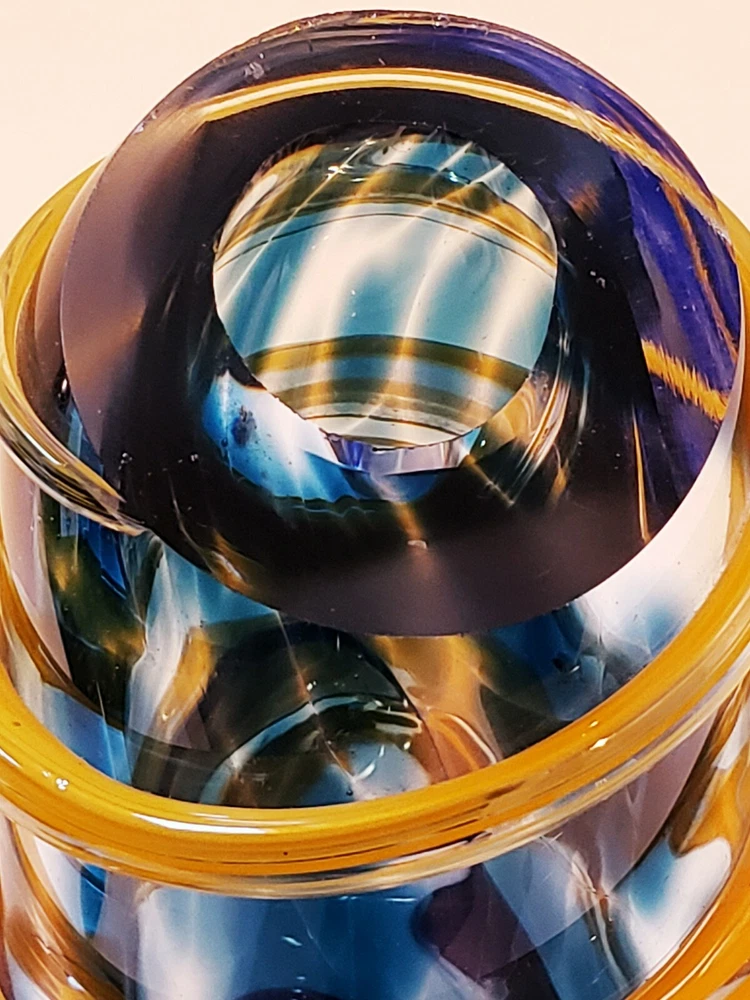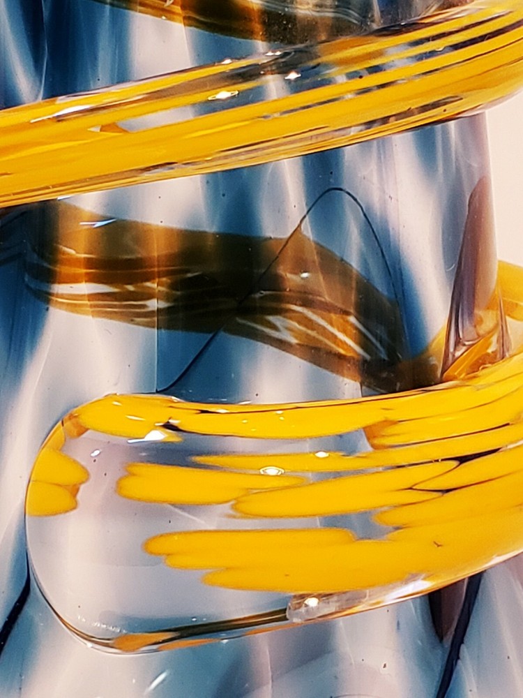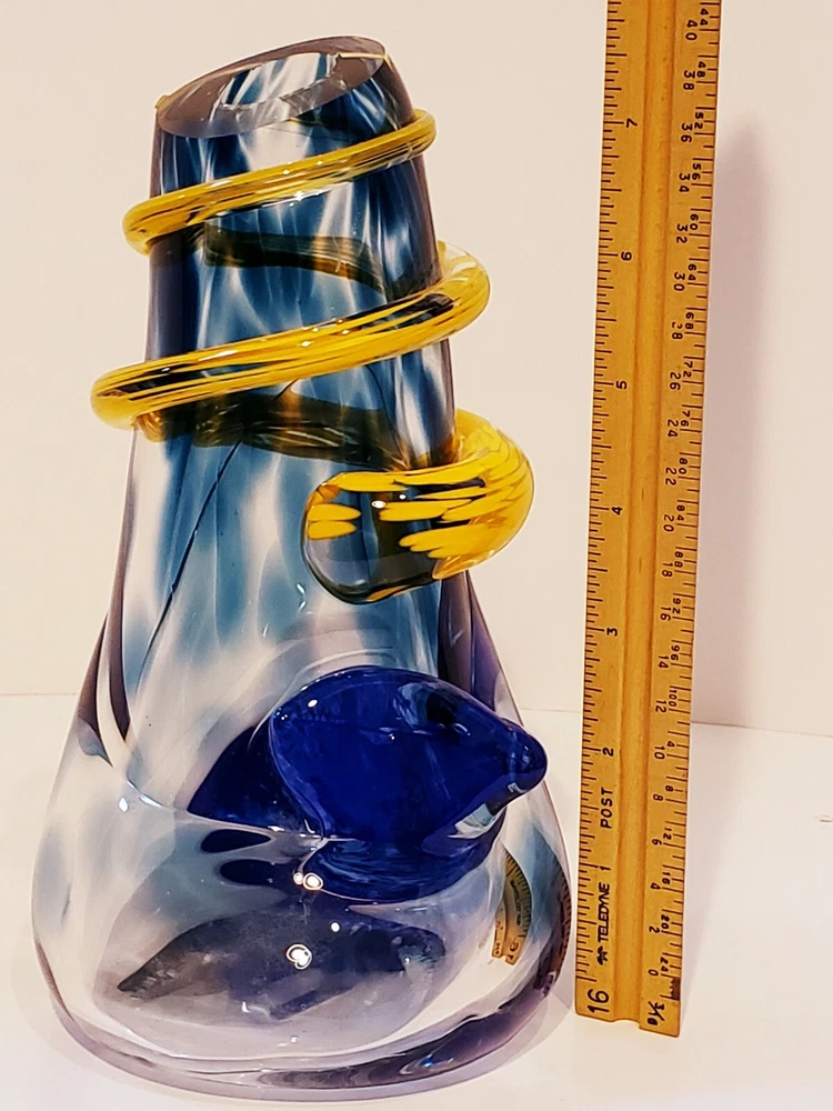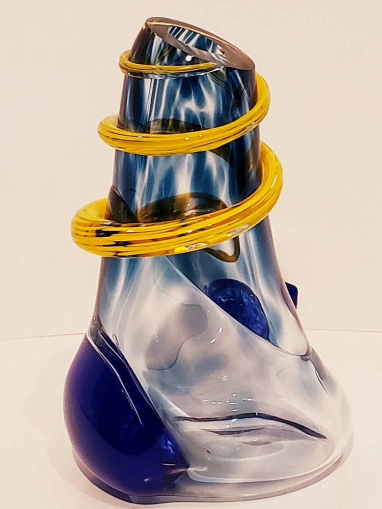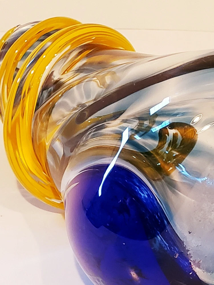 Art Glass Heavy Thick Vase Funky Yellow Blue wrapped . Wild looking yellow wrapped stretched top 8" x 5" half inch thick very funky cool look . Very tiny flea bite on the top upper edge besides that very good condition no chips or cracks just a great design.