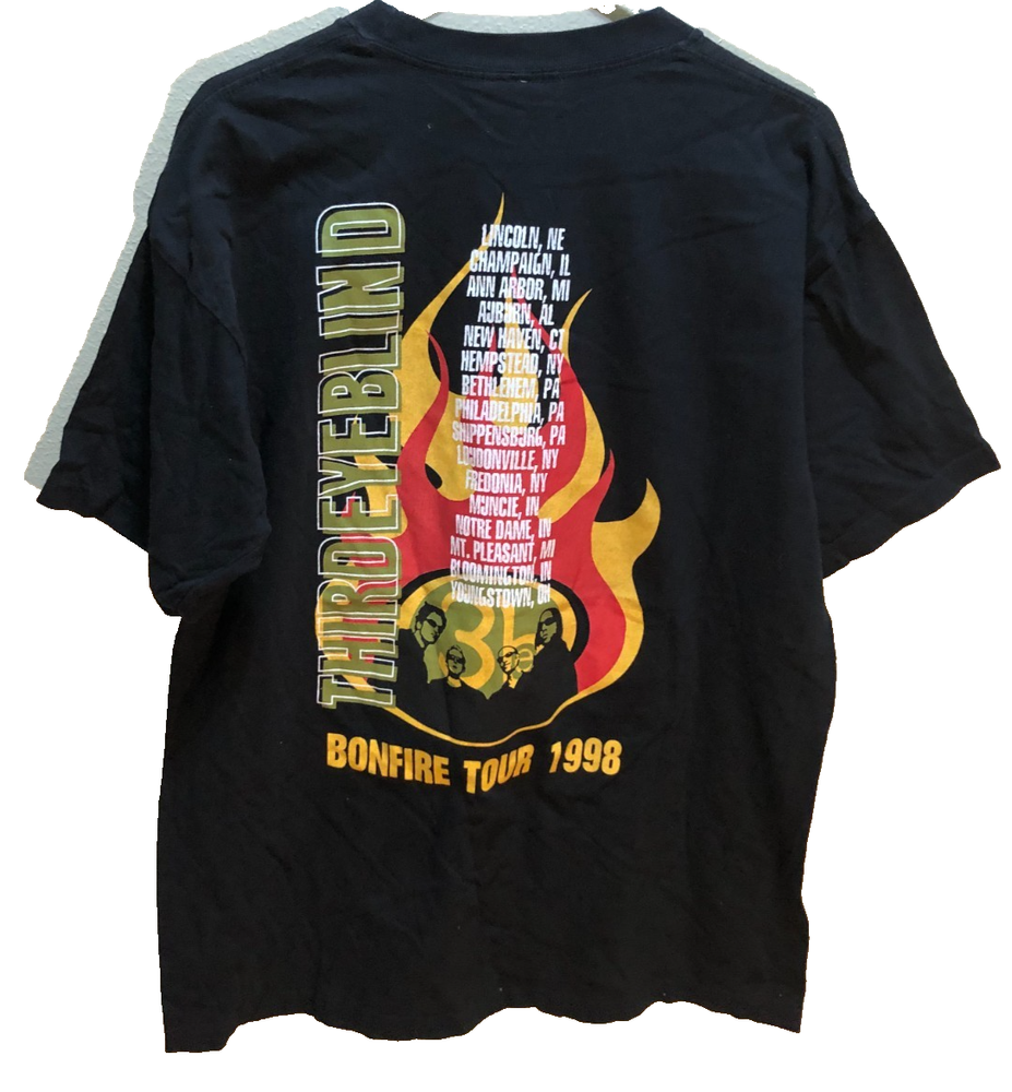 This vintage Third Eye Blind Bonfire Tour 1998 black t-shirt features a graphic print with the band's iconic logo on both sides. Made of comfortable cotton knit fabric, this short sleeve shirt is machine washable and has a crew neckline for a classic fit. The regular size L shirt is perfect for fans of the band and 90s music, making it a stylish addition to any wardrobe for the summer, fall, or spring seasons. Vintage 90s Giant 1998 Third Eye Blind Bonfire Tour Double-Sided T-Shirt *100% Cotton *Screen-pinted *Color: Black Size: Adult L Measurements: *Armpit to Armpit 21" *Shoulder to Hemline 29" *Shoulder to Shoulder 21" Condition: Pre-owned.