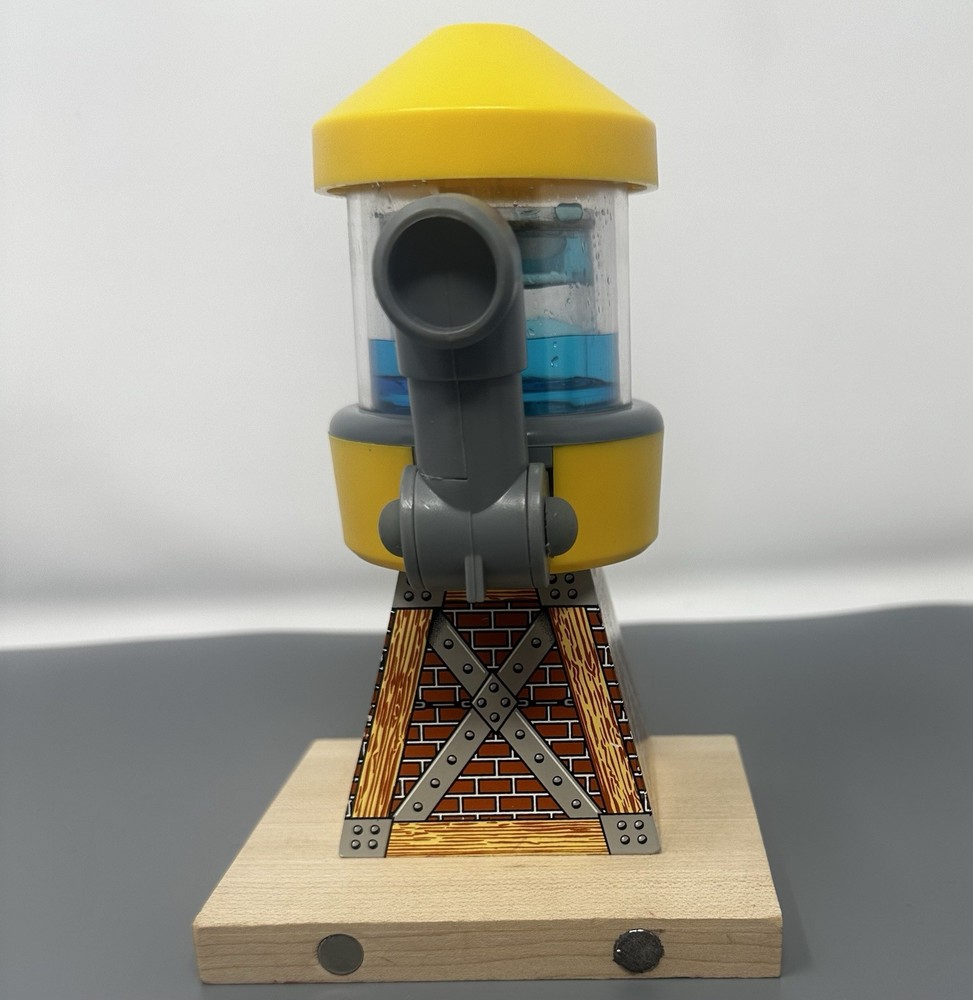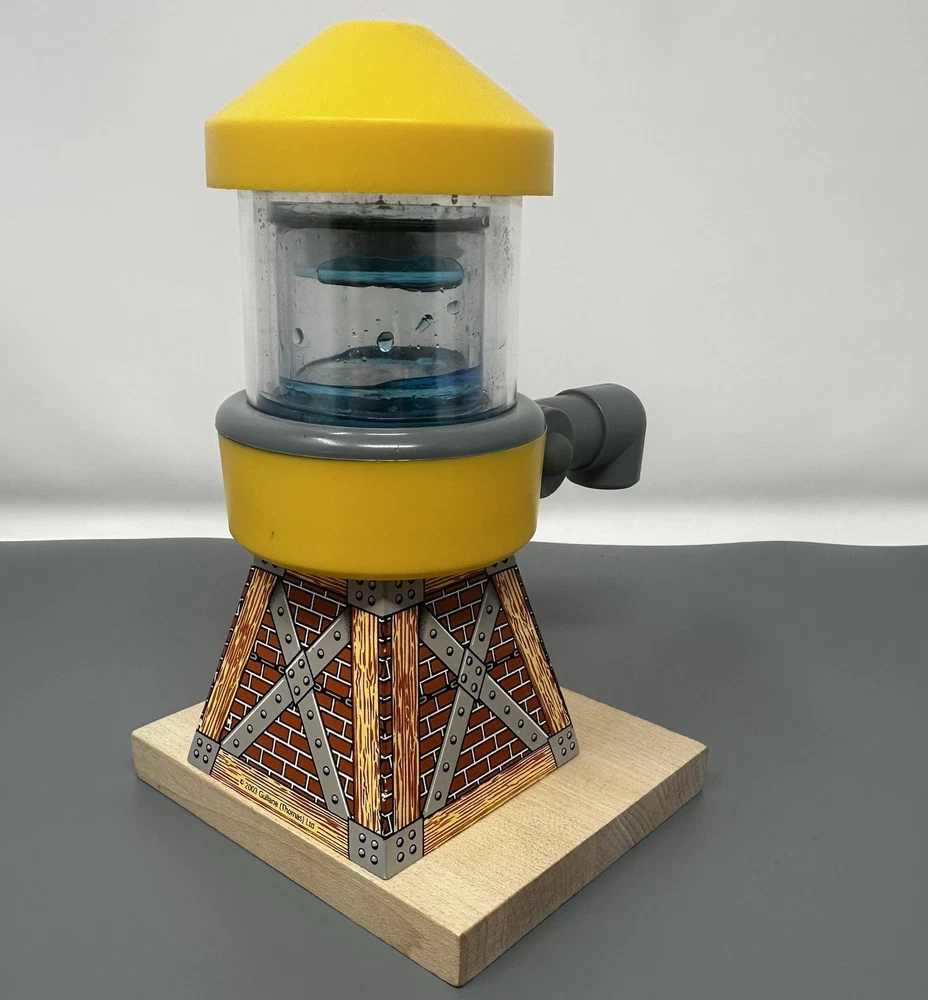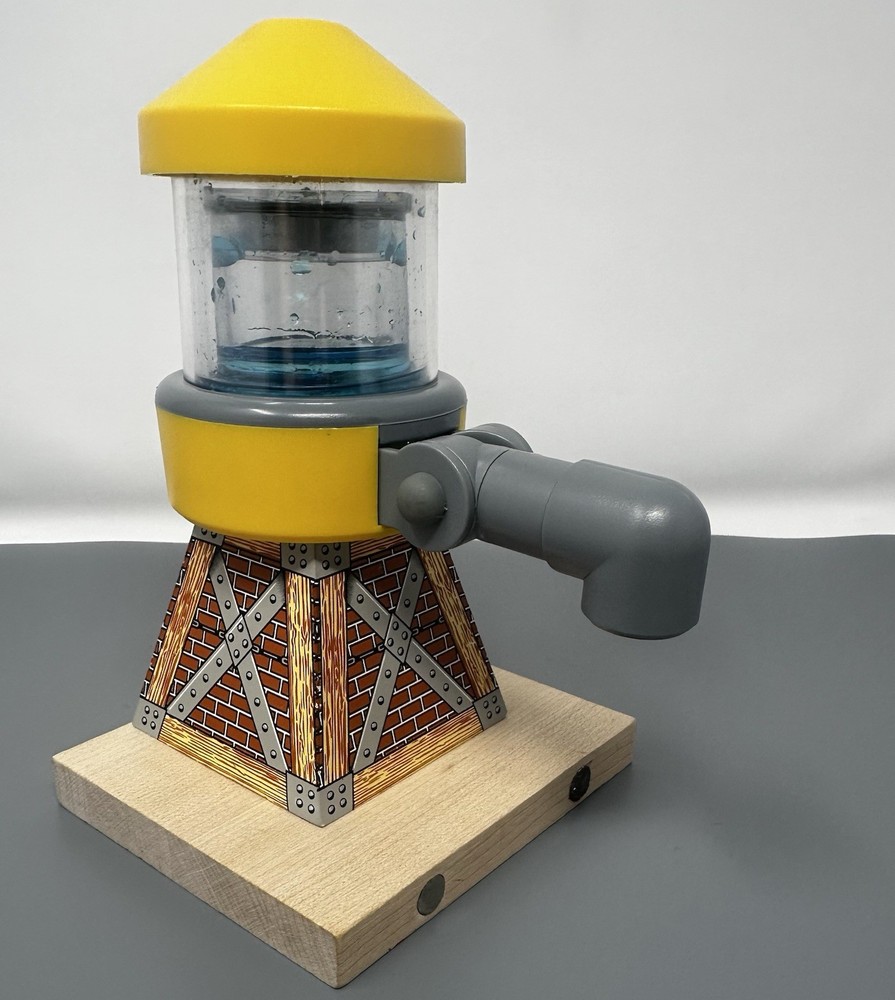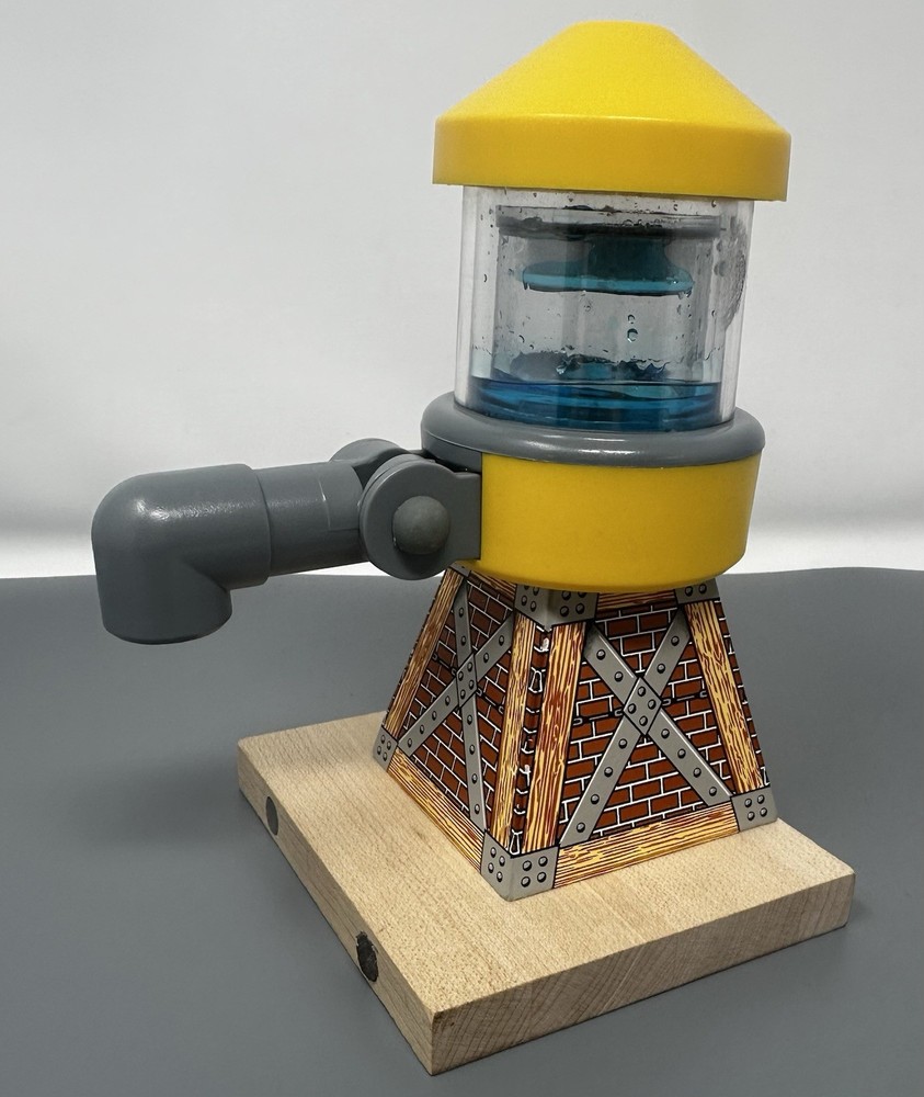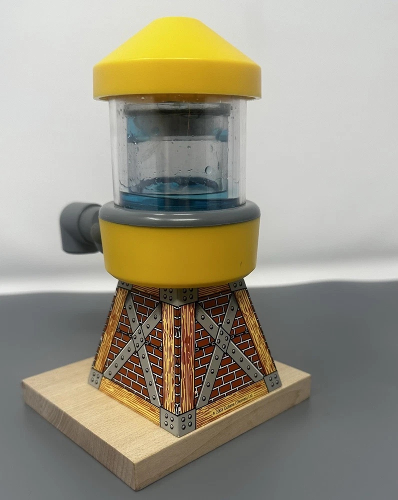 The Thomas & Friends Wooden Railway moving Water Tower Accessory is a vintage playset perfect for fans of the beloved TV show. Made of wood, plastic, and liquid in tower, this water tank accessory is designed to fit seamlessly into your Thomas & Friends wooden railway set. With a height of 6 inches and a length of 4 inches, this charming addition captures the essence of the show's iconic characters and themes. In excellent condition with no signs of wear. The liquid raises and lowers when moving the spigot.
