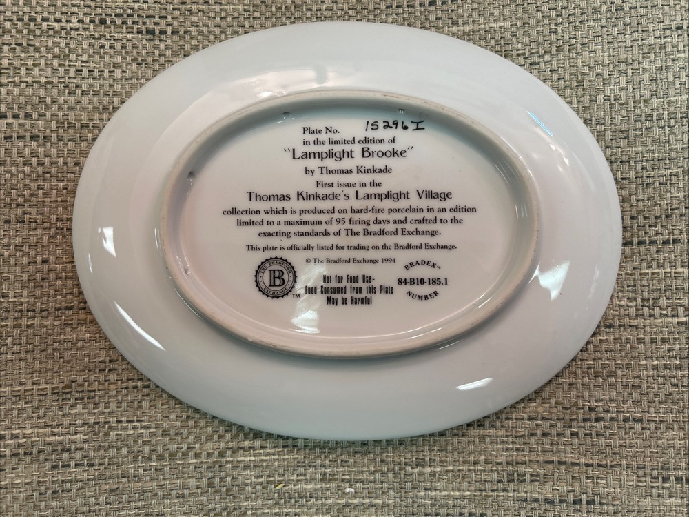 This beautiful oval collector plate by Thomas Kinkade features the charming scene of Lamplight Brook. The plate is a perfect addition to any collection of decorative collectibles. With its intricate design and exquisite craftsmanship, it is sure to impress any admirer. The plate is a great gift for any Thomas Kinkade fan or collector, and would make a perfect display piece in any home or office.
