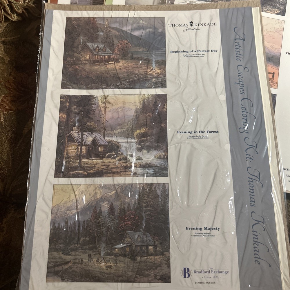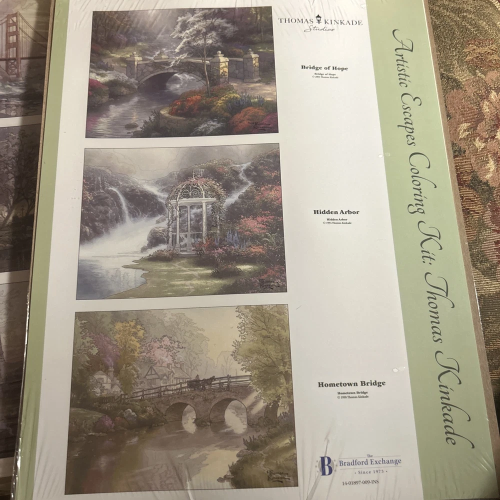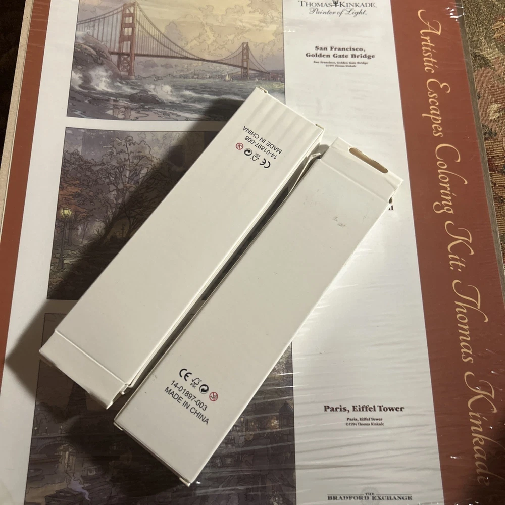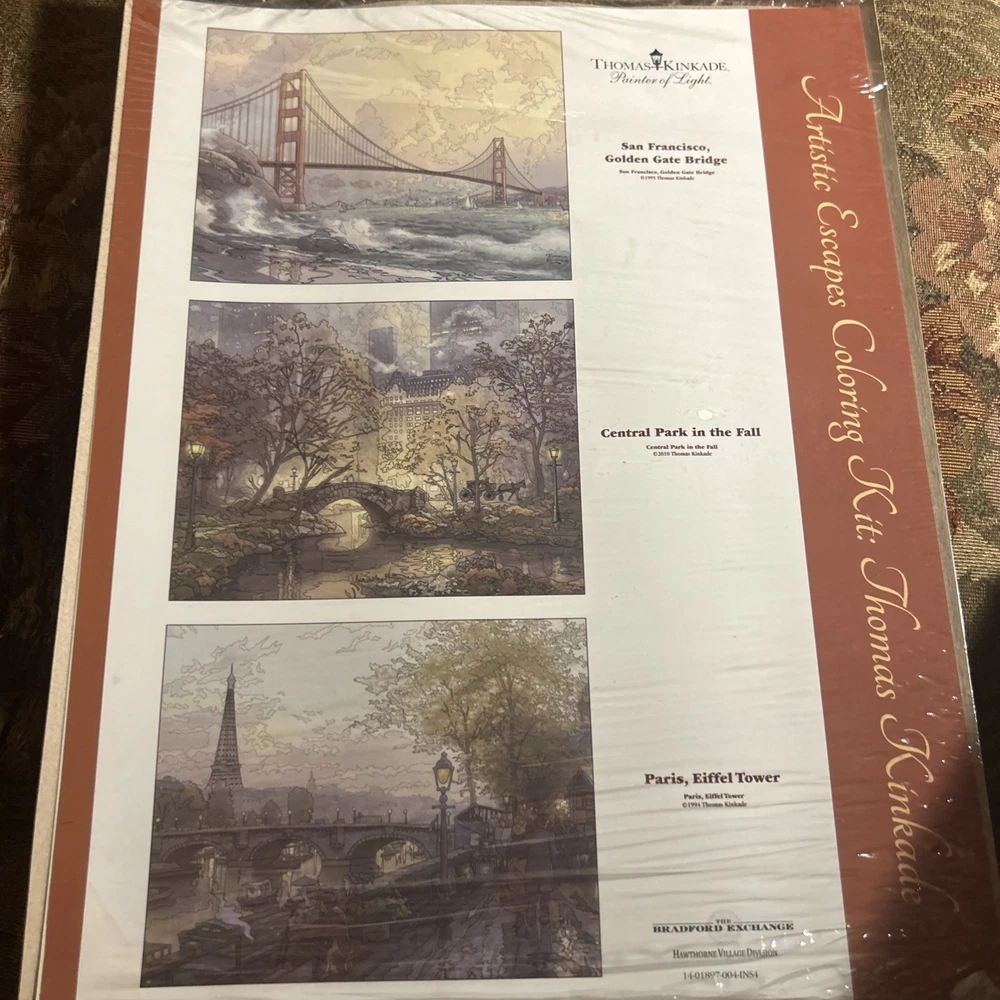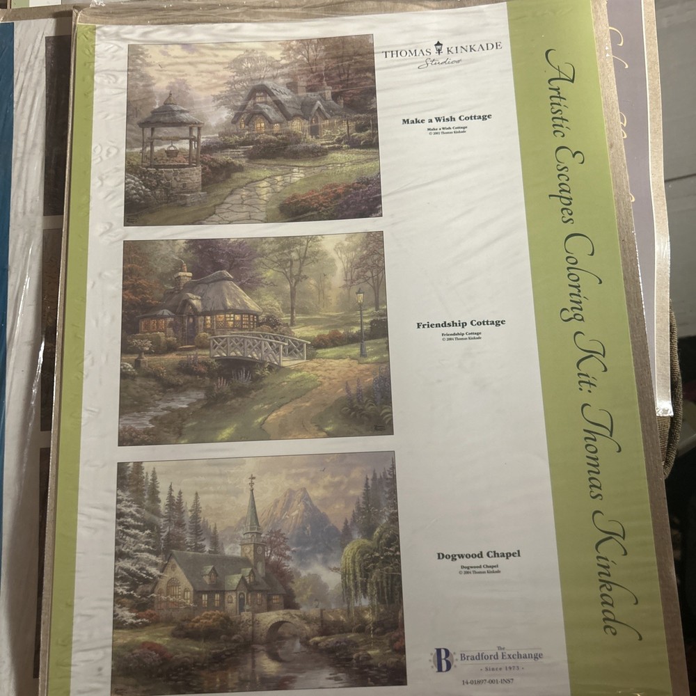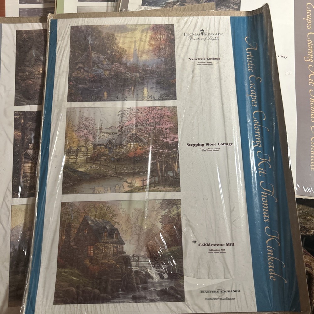 Explore the Art of coloring with this lot of 6 Thomas Kinkade Artistic Escapes Coloring sheets from the Bradford Exchange. Measuring 11x14 new in original packaging (one has a tear in front). Two sets of pencils are included. Scenes are San Francisco Golden Gate Bridge, central park in the fall, Paris, Eiffel Tower, Bridge of Hope, hidden arbor, hometown bridge, the light of peace, the end of a perfect day, courage, beginning of a perfect day, evening in the forest, evening majesty, Nanette’s cottage, stepping stone cottage, cobblestone mill, make a wish cottage, friendship cottage and dogwood chapel