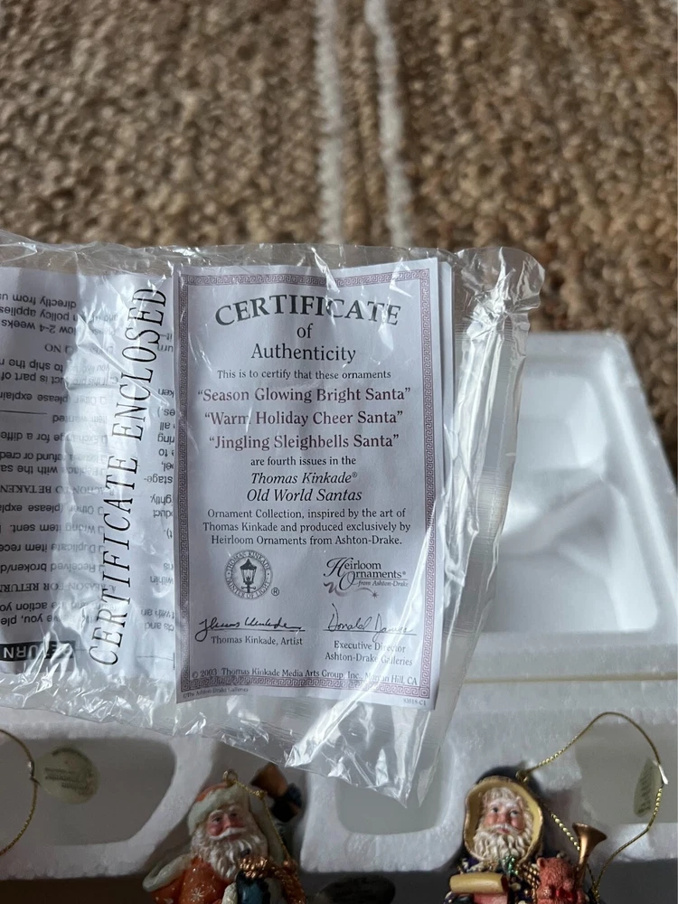 Set of three Thomas Kinkade Old World Santa Christmas ornaments from Ashton Drake. From set #4. Includes COA and original packing.