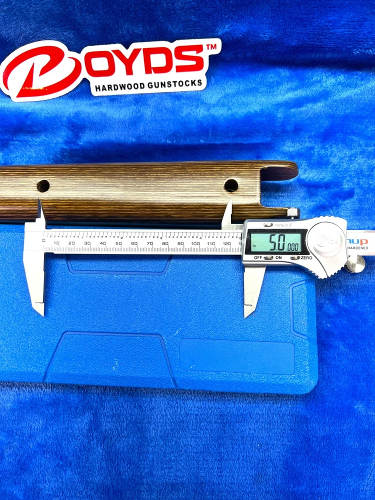 Boyds Nutmeg Encore Rifle Forend with fasteners Enhance your Thompson Center Encore Rifle with this Nutmeg colored Hardwood forend grip. This durable grip is made from laminated hardwood materials and measures 10 inches in length. It comes with a sling attachment stud, ensuring a more comfortable and hassle-free hunting experience. This forend grip is suitable for Encore rifles and is available in Nutmeg color. It is "brand new" and comes with black oxide fasteners. The grip is made in the United States, and it is a part of the hunting and sporting goods categories. Get your hands on this high-quality forend grip for your Thompson Center Encore rifle today! Calipers and their case are not included.