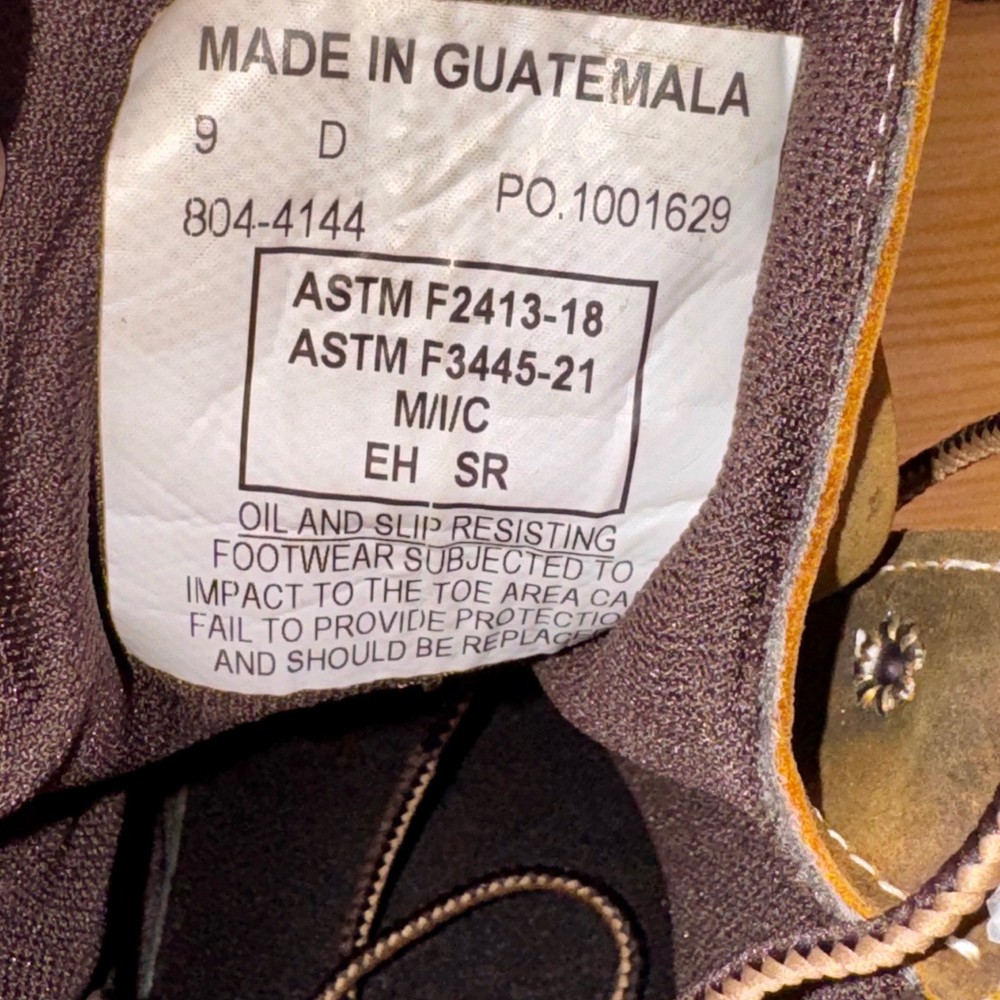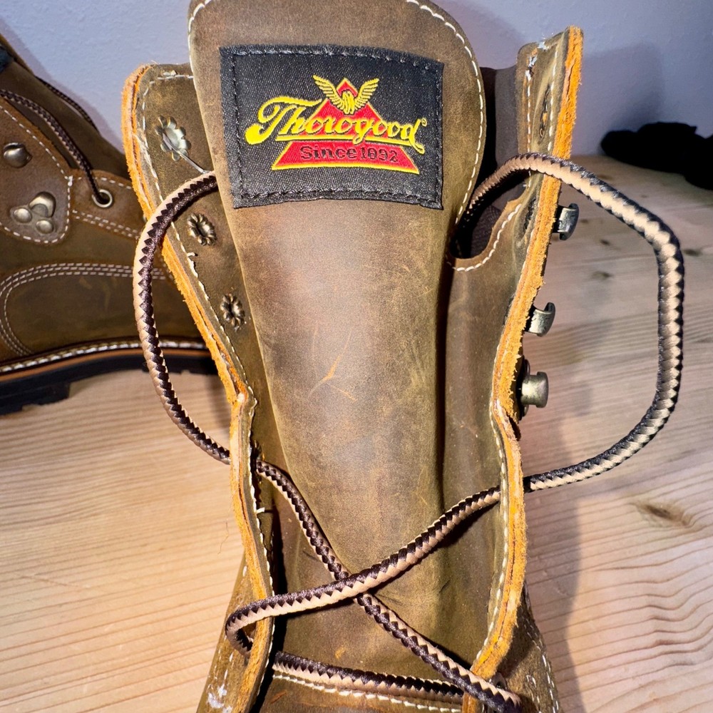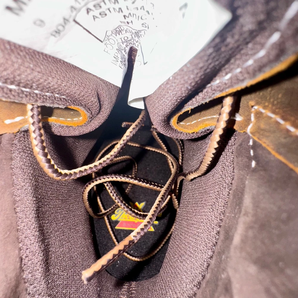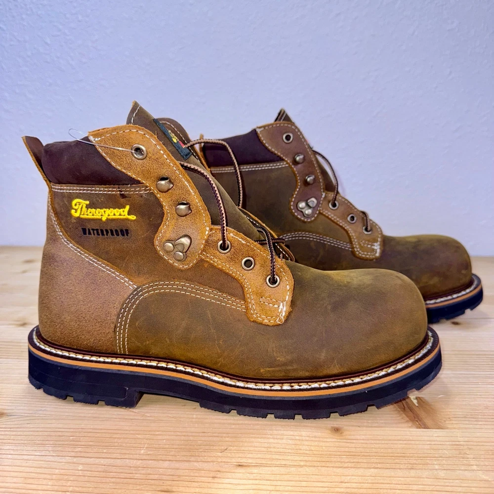 Brand new without tags, never worn. These Thorogood 804-4144 work boots are built for maximum safety and durability. Made with oil-tanned brown leather, steel toe protection, and waterproof construction, they're ASTM F2413-18 & F3445-21 rated for EH and slip resistance. Goodyear storm welt design ensures long-lasting performance. Men's size 9D, made in Guatemala, weighing approx. 4.1 lbs. Ideal for construction, industrial, and outdoor environments. • Brand: Thorogood • Style: 804-4144 Waterproof Steel Toe Work Boots • Color: Brown / Oil-Tanned Leather • Size: 9D (Men's) • Material: Leather Upper, Rubber Outsole • Made in: Guatemala • Weight: 4.1 lbs Condition: Brand New Without Tags – Never Worn Keywords: thorogood boots, steel toe work boots, waterproof work boots, EH SR ASTM boots, mens size 9D