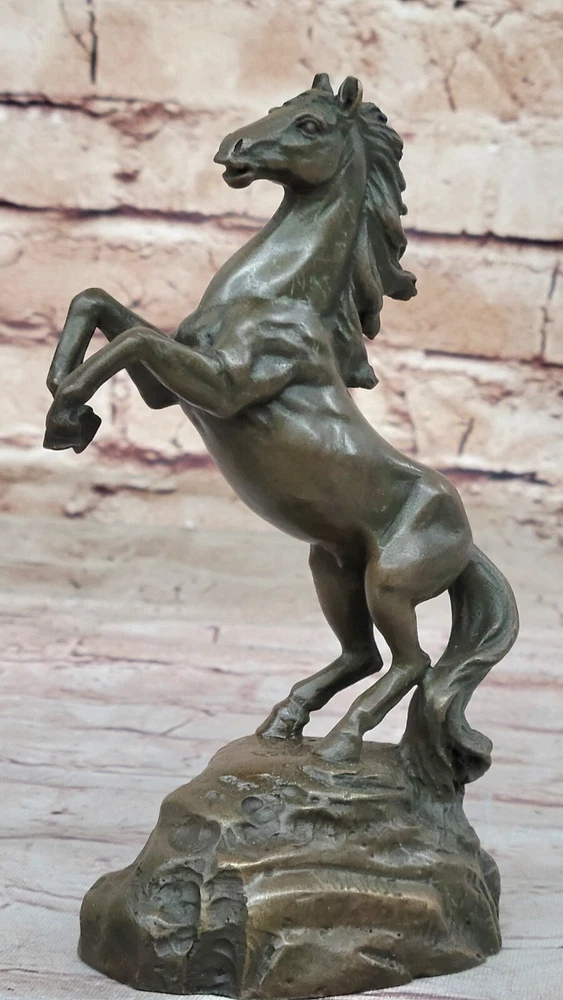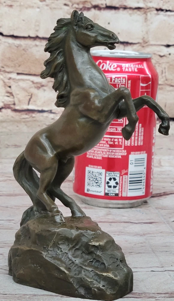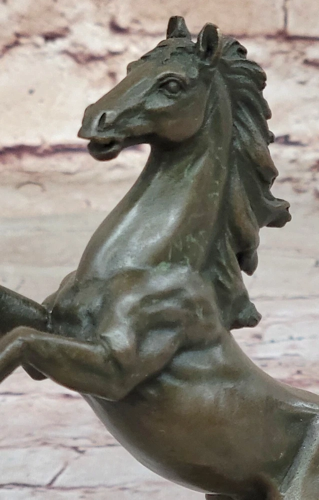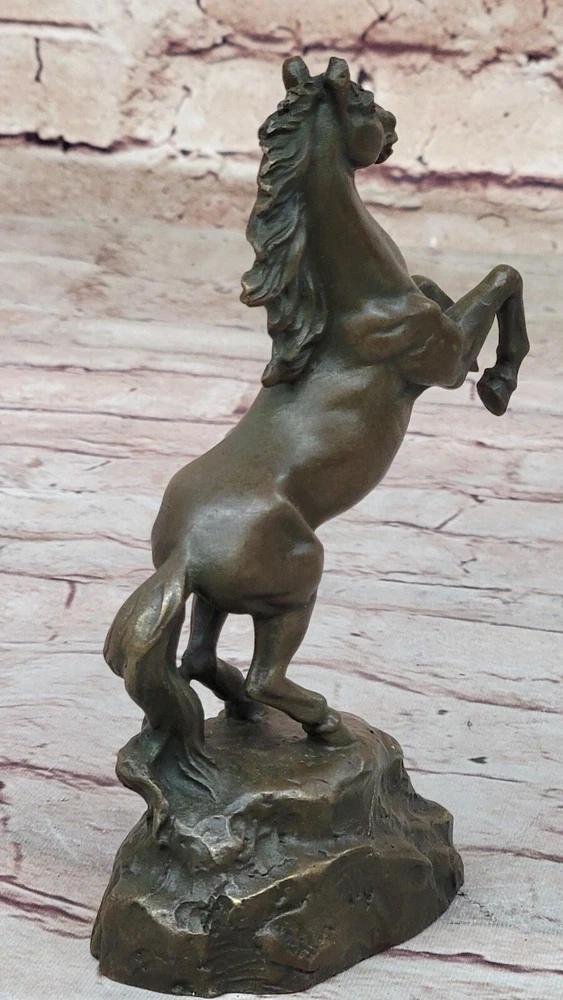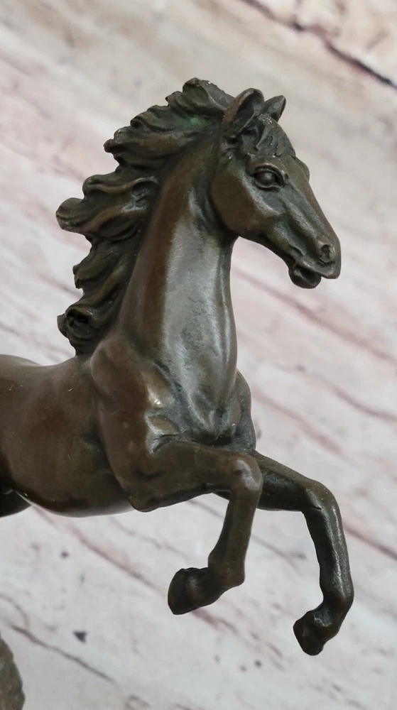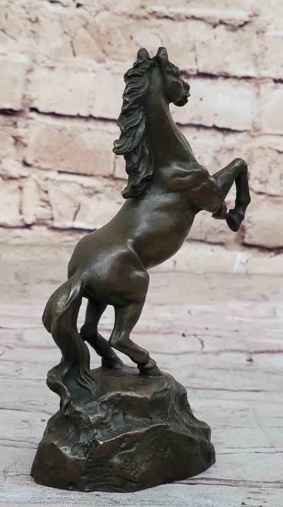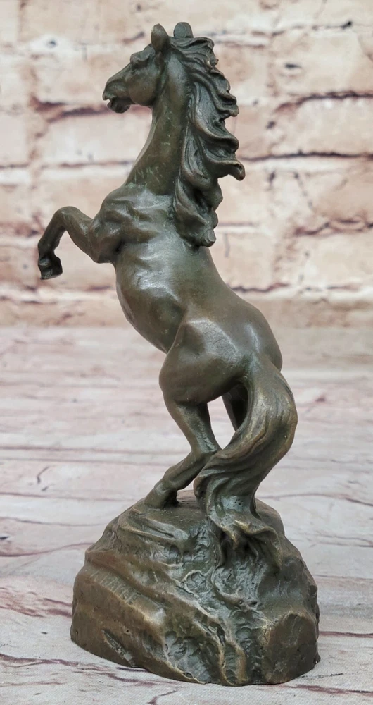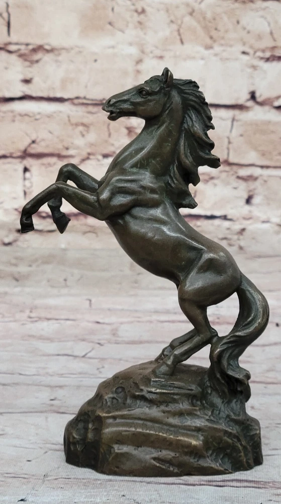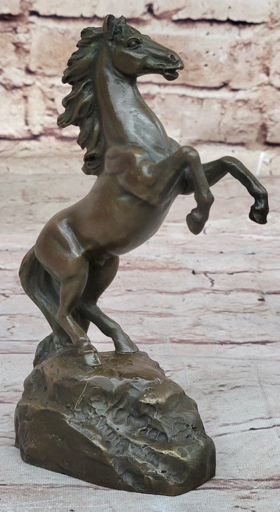 Condition : This sculpture is in perfect condition. Bronze Dimensions: Height 6.5" X Width 3" Weight:1 LBS Inventory:63AL5303636 This striking bronze sculpture captures the intense and dynamic moment of a horse rearing on its hind legs. The horse's expression reveals a mix of fear and excitement, with its mouth wide open, emitting a powerful neigh that serves as a warning to those in its vicinity. The rearing position, while magnificent, also conveys a sense of danger, highlighting the innate strength and energy of this iconic animal. Crafted with meticulous attention to detail, the sculpture is made using the lost wax method, a traditional technique that allows for the preservation of intricate features and lifelike qualities. The bronze sculpture stands as a testament to the artist Mario Nick's skill in capturing the natural and emotional responses of horses. Whether displayed as a standalone piece or integrated into a broader collection, this bronze sculpture serves as a powerful representation of the wild and spirited nature of horses. The signature of the artist adds a personal touch, acknowledging the craftsmanship and artistry that went into creating this compelling equine sculpture. Original Barge Rearing Arabian Horse Wild Bronze Sculpture Figurine Artwork www.bronzhaus.com Video will open in a new window Using the eBay App? Paste link into a browser window: [isdntekvideo]
