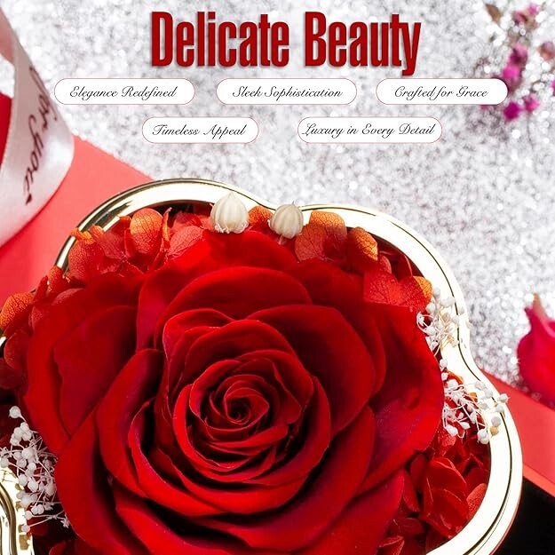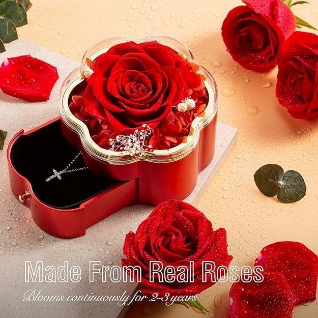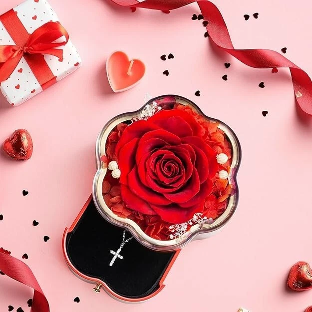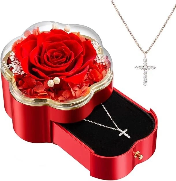 Gifts for Wife Women Wife Gifts for Her Christmas Girlfriend Gifts Birthday Gift Description 925 Sterling Silver Necklace & Pendant: Made from high-quality 925 sterling silver with a 18K rose gold-plated surface, this 17-inch necklace ensures durability and shine. The cross pendant measures 0.4 x 0.6 inches (2/5 x 3/5 inches) and is adorned with 12 synthetic diamonds. This piece is not just an accessory—it expresses deep emotions and celebrates special moments. Premium Quality and Comfort: Say goodbye to the irritation caused by stainless steel or copper necklaces. Our premium quality necklace, crafted from pure silver and delicately plated with 18K gold, offers a luxurious and gentle alternative for sensitive skin. Designed with your comfort in mind, it's nickel-free and ensures a lasting shine without fading. Embrace elegance without compromising on skin health. Elegant Presentation: Our necklace comes in a beautifully designed, high-quality gift box adorned with a red eternal rose. This exquisite packaging not only protects your jewelry but also adds a touch of sophistication, making it a perfect gift that delights and impresses from the moment it is received. A precious gift suitable for various remarkablewomen in your life, be it your mother, grandmother, wife, fiancée, girlfriend,or any cherished individual. Whether celebrating a birthday, Mother's Day, orany moment to express deep affection, a preserved roses and an exquisite necklace conveys profound emotions. It's not merely a gift; it's a beautiful sentimentexpressing genuine feelings, creating a timeless token of love for anyonespecial in your life. TRANSFORM an exquisite necklace gift box adorned with an everlasting rose into a magically enchanting present for various special occasions throughout the year, including Mother's Day, Valentine's Day, Birthday, Anniversary, Thanksgiving, and Christmas. Bring warmth and surprise to the women in your life with this unique combination of preserved flowers and a Cross necklace.