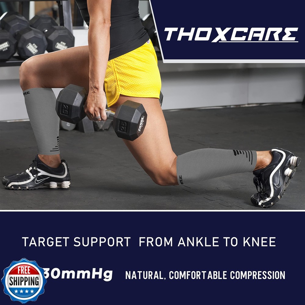 Thoxcare Calf Compression Sleeve for Men Women (1 Pair), Leg Support Footless Compression Socks for Running - Shin Splint Varicose Veins Swelling and Pain Relief, Gray/Black, Small Features ☑️【GREAT FOR RECOVERY】 The THOXCARE calf compression sleeve is designed to provide relief from swelling, shin splints, varicose veins, and pain. The 20-30 mmHg leg compression sleeve improves blood circulation and reduces the risk of blood clots. Wear these footless compression socks and you'll be able to run with ease again. ☑️【ALL DAY COMFORT】 The leg support sleeve is made of soft, breathable and comfortable fabric and fits snugly around the calf. It can be worn every day for long periods of time without discomfort. The compression sleeves for legs can be worn while running, working, or sleeping. They work great and you don't even notice you are wearing them. ☑️【TARGETED SUPPORT ON YOUR CALVES】 The compression calf sleeve for men & women works specifically for providing the right amount of compression without feeling too tight or too loose. Perfect support for your legs, from ankle to knee, which will give you more energy and reduce fatigue. You will find that the sleeve will be more comfortable than wearing supportive stockings. ☑️【CHOOSING THE RIGHT SIZE FOR BEST FIT】 Getting the right size is the most important. Please do not guess your size or assume a certain size will fit you for the compression calf sleeve, check the size chart (image#5) before ordering. Make sure you measure your calf properly so you get the fit that will work for you. ☑️【MULTIPLE OCCASIONS】 Women’s & Men’s calf compression sleeve are suitable for variety of activities, such as running, football, soccer, basketball, tennis and anything active. They are perfect for walks, treks, jogs, and cycling, and are also very useful when traveling. Additionally, they are easy to put on and take off. Shipping Free & Fast Shipping: We offer free shipping to most of the USA with a normal delivery time of 3-7 days. However, due to the current situation, additional delivery time (up to 3 weeks) may be required for some items. Alternative Carriers: We may use alternative carriers (e.g., USPS, FedEx, UPS) to ensure your package arrives safely and on time. Due to the use of multiple carriers, we are unable to provide a tracking number automatically. Handling Time: Orders are processed and shipped within 1-2 business days of receiving cleared payment. Shipping Restrictions: Shipping to Alaska, Hawaii, Puerto Rico, Guam, and other US territories may incur shipping charges or delivery restrictions. Please contact us before ordering, or your order can be refunded/cancelled. State Restrictions: Certain items may not be shipped to California due to state regulations. Contact for Tracking Updates: If you require tracking updates or have any concerns about the delivery of your order, please feel free to contact us, and we will be happy to assist you. Return Policy 30-Day Hassle-Free Returns: If you are not completely satisfied with your purchase, you can return the item for free within 30 days of receiving it for a full refund or exchange. Easy Return Process: Contact us, and we will provide you with a prepaid return shipping label and detailed instructions. No Restocking Fee: There are no restocking fees for returns. However, the buyer is responsible for return shipping costs if the return is not due to a seller"s error. Refund Processing: Refunds will be processed within 1 business day of receiving the returned item in its original condition. Feedback Your feedback is extremely important to us. We strive to provide the best products and customer service possible. If you are satisfied with your purchase, please take a moment to leave us a positive review. If you have any concerns or issues with your order, please contact us before leaving negative feedback. We are committed to resolving any problems and ensuring your satisfaction. Contact Us If you have any questions or concerns, please feel free to reach out to our customer support team. You can contact us through the eBay messaging system. We are available Monday to Friday, 9:00 am to 5:00 pm EST, and we will do our best to respond to your inquiry within 24 hours. Thank you for supporting our small family business!