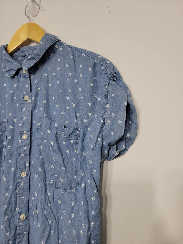 Thread & Supply Women’s Dress Size Small Button-up Fringe. Pre-owned great condition 100 percent lyocell Rolled stitched sleeve button-up t-shirt dress style with leaf detail print 34 inches long 20 inches across 2 front pockets G4F