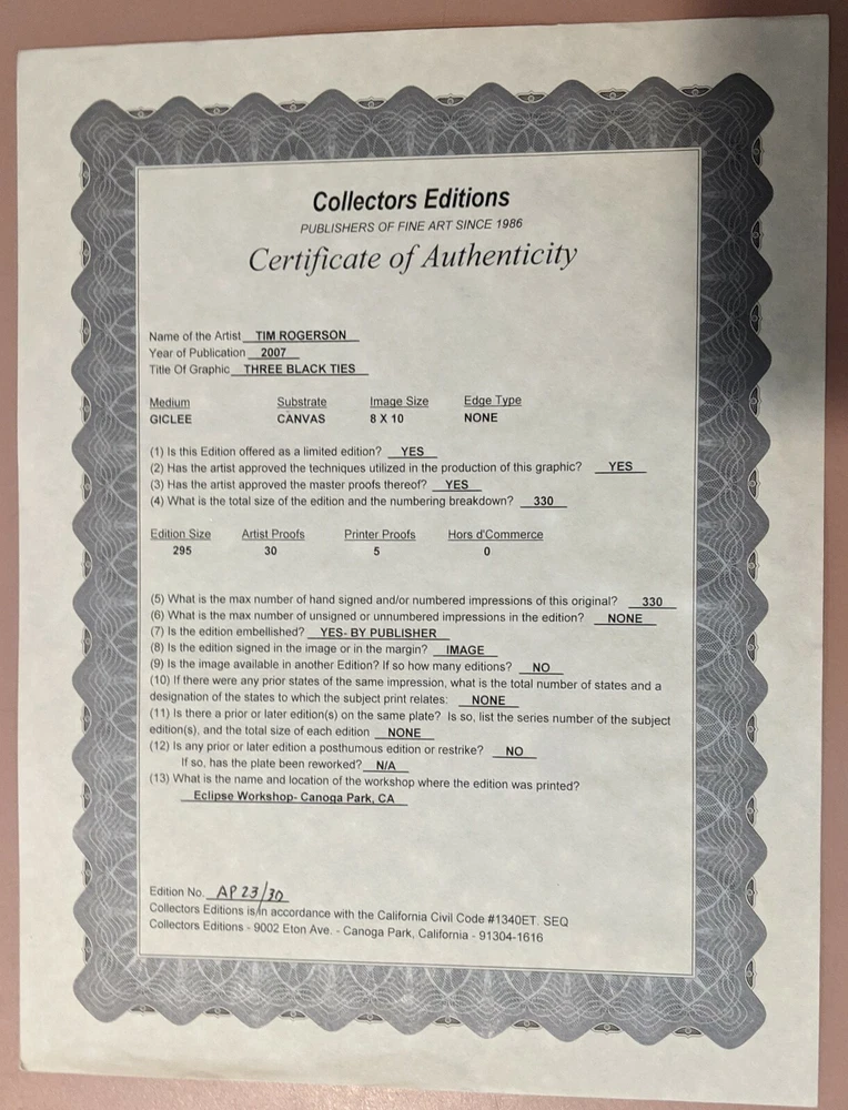 Tim Rogerson "Three Black Ties" Limited Edition Giclee AP Measuring 10” wide by 8" high, "Three Black Ties" is offered gallery-wrapped and ready to hang on your wall! Hand-numbered out of an Artist Proof edition size of only 30, the edition has since Sold Out through Rogerson's Studio. "Three Black Ties " is currently valued at a Sold Out List Price of $245.00 Gallery-Wrapped, but offered with its original Studio Certificate of Authenticity for only $200.00 Gallery-Wrapped ! Artwork featured in the smallamazon eBay store represents a special collection of offerings from Barker Animation Art Galleries. Having assisted both seasoned and novice art collectors since 1993, Barker Animation has remained one of the most trusted and preferred sources for animation and pop culture artwork in the world. Authorized and approved by more than 20 production / publication studios, all offered artwork comes directly from the studio in question (never previously owned, or from the secondary market) and arrives with the original Studio Certificate of Authenticity (if applicable). With thousands of originals, limited editions, and collectibles to choose from - it's no wonder why 13,000 collectors from 15 different countries proudly display artwork from Barker Animation in their homes and offices. Should you be looking for a piece of animation or pop culture artwork not currently offered in our eBay store, please feel free to contact us with your specific request!