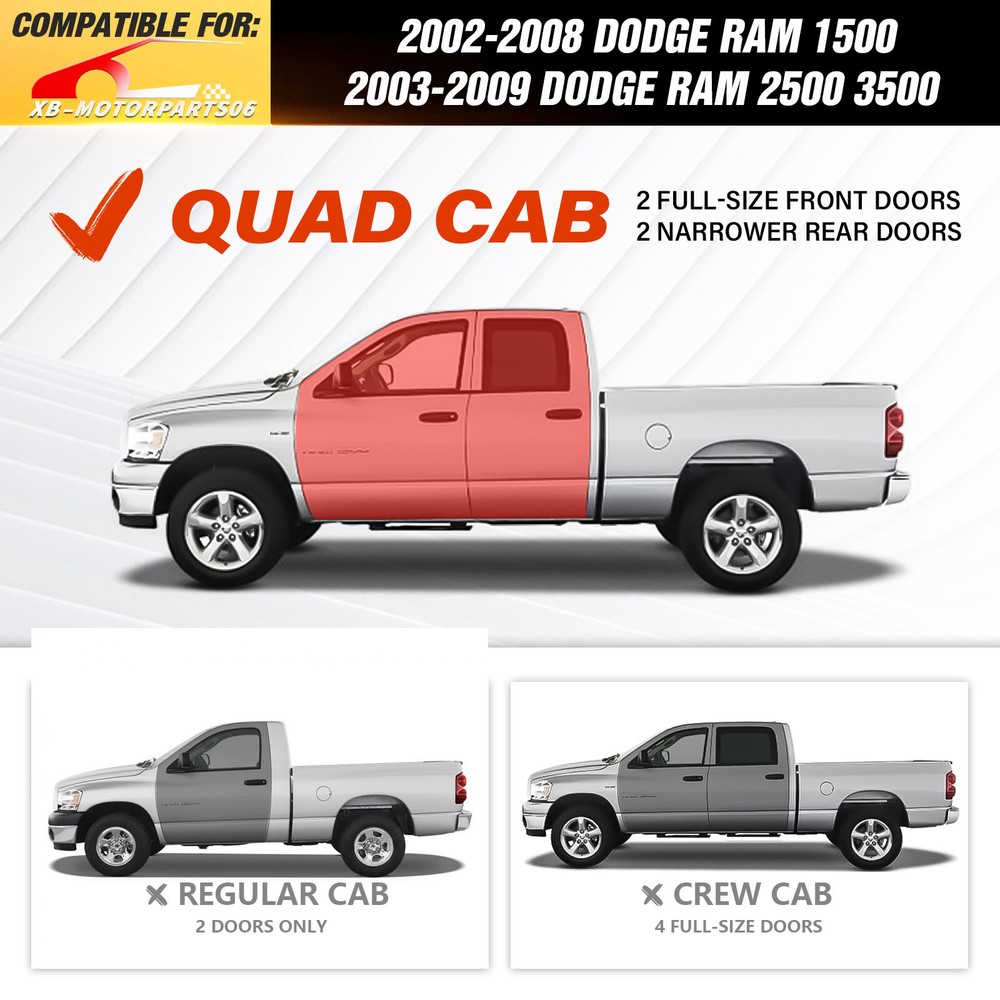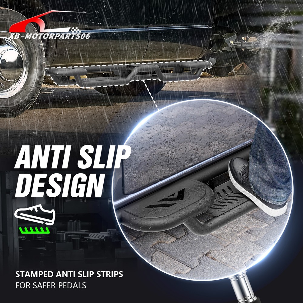 Three Raised Steps Side Running Boards For 2002-2008 Ram 1500 Double/ExtendedCab Suitable Models : Compatible with 2002-2008 Dodge Ram 1500, 2003-2009 Ram 2500 3500 Double/Extended Cab Package Includes : 2 x Running Boards Side Steps, brackets, instructions, and all necessary hardware Product Information : Product Dimensions: 76 x 7 x 5 inches Installation mode: Bolt-On Weight Limit: 550LBS Placement on Vehicle: Left and Right Item Weight: 75.90 pounds Material: Carbon Steel Color: Black (hand measurements may have an error of 2-3 mm/0.078-0.118 in) Feature: ① Three Raised Steps for easy access to the roof, allowing multiple users to work on the vehicle simultaneously; ② Dual-layer Layout provides enhanced convenience for vehicles equipped with lift kits and oversized tires, offering easier access to the roof while maintaining sufficient ground clearance; ③ The high-quality black powder coating provides outstanding rust and corrosion resistance. Constructed from heavy-duty 2mm carbon steel, each side can withstand a weight of 550 pounds. Precision laser cutting and stamping techniques contribute to a non-slip step surface and enhanced traction; Warranty Period : 2 year Standard Shipping (FedEx Ground or FedEx Home Delivery) Will usually ship within 3 business days of receiving cleared payment Suitable Models : Compatible with 2002-2008 Dodge Ram 1500, 2003-2009 Ram 2500 3500 Double/Extended Cab Package Includes : 2 x Running Boards Side Steps, brackets, instructions, and all necessary hardware Product Information : Product Dimensions: 76 x 7 x 5 inches Installation mode: Bolt-On Weight Limit: 550LBS Placement on Vehicle: Left and Right Item Weight: 75.90 pounds Material: Carbon Steel Color: Black (hand measurements may have an error of 2-3 mm/0.078-0.118 in) Feature: ① Three Raised Steps for easy access to the roof, allowing multiple users to work on the vehicle simultaneously; ② Dual-layer Layout provides enhanced convenience for vehicles equipped with lift kits and oversized tires, offering easier access to the roof while maintaining sufficient ground clearance; ③ The high-quality black powder coating provides outstanding rust and corrosion resistance. Constructed from heavy-duty 2mm carbon steel, each side can withstand a weight of 550 pounds. Precision laser cutting and stamping techniques contribute to a non-slip step surface and enhanced traction; Warranty Period : 2 year