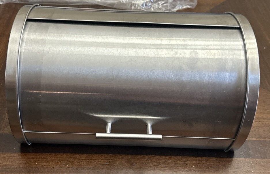 This Threshold Quality And Design Bread Box is a modern silver metal bread box with a free-standing design. It measures 7 1/2 inches in height, 15 inches in length, and 9 inches in width. It features a lid and is branded as Kitchen. This bread box is not antique or vintage. The second image is just an example of what it looks like.