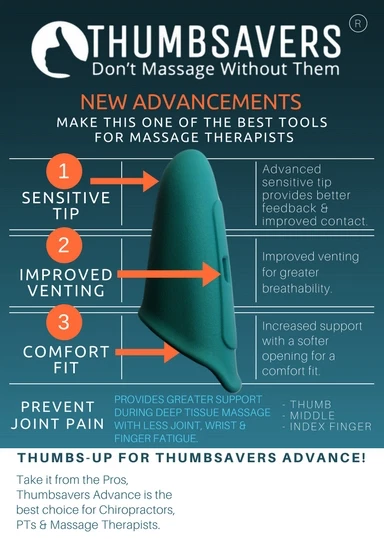 Advanced Sensitive Tip - allows for better a better interaction between your fingers and the client. The tool literally disappears as you use it. A true thumb saver. Improved Venting - allows for a cooler working experience via enhanced breathability. More comfort in all environments, especially warm treatment rooms, on clients who run ‘hot’, athletes who just worked out or played sports. Comfort Fit Opening - soft opening that is flexible and natural feeling. It is much more comfortable to wear, especially for shorter fingers. Allows longer treatment sessions ranging from lighter swedish to deeper and more intense work. Ergonomic Shape - inside of the tool is shaped like a thumb, ensuring a comfortable fit and enhanced usage. Textured material stays on better and provides more grip. Helps reduce finger, joint, hand and wrist pain. Patent #7252645. Made In The USA. Perfect for Physical Therapy, Occupational Therapy, Massage, Chiropractic, Sports, Personal, Athletic Training, Deep Tissue Trigger Point Work, Myofascial Release, Shiatsu, Acupressure. The Thumbsavers Advance takes all of the features of the Thumbsavers Classic to a whole new level. Several engineering enhancements that were not possible when first conceived help make this the most advanced worn therapeutic aid on the market today. What makes this new version so great? Advanced Sensitive Tip, Improved Venting, Comfort Fit Opening. Used By Massage Therapists, Physical Therapists, Occupational Therapists, Chiropractors, Athletic / Personal Trainers All Over The World. They are great for Trigger Point Therapy, Muscle Stripping, All Massage Modalities Including Chair, Acupressure, Shiatsu, Self Care & More. The Thumbsavers Advance is an affordable massage ‘tool’ that assists any health care practitioner who is utilizing their hands by providing much needed support. They also reduce the stress on your joints and wrists while performing deep tissue work. It provides the kind of sensitivity & mobility that separate them from other options that don’t allow you to ‘feel’ your client or have a direct ‘connection’ to them. Many tools on the market also require a great amount of force to be applied when holding them, and cause strain and fatigue over time. Technically, Thumbsavers can not be called a "tool" because your thumbs and fingers are actually inside them. You use your fingers in their natural state, and fatigued thumbs, fingers, and carpal tunnel like wrist pain will be no longer a problem. You can prolong your natural therapy career and protect your most valuable assets. Thumbsavers can be used interchangeably with thumbs, middle and index fingers, and on both hands. Message from Greg Polins, the developer of Thumbsavers Advance massage ‘tool’: ‘This is by far my best tool yet. A couple of years ago, this wasn’t possible. Through advanced mold engineering, you can now have the support you need for your joints while enjoying a much better interaction with your clients through the multi-depth tip. The Thumbsavers Advance is going to take treating clients while extending your career to a whole new level.’ What Size Do I Need? Take A Measurement Across The Area Just Above The Joint In The Middle Of Your Thumb (If That Is The Widest Part). If It Is ~ 1/2” to 7/8”, Order Teal - Small. If It Is Between 7/8” and 1 1/8”, Order Orange - Large. This Is What We Call ‘The Rule Of Thumbs’. Orders & Shipping Returns & Refunds FAQs About Thumbsavers About Us Orders & Shipping Returns & Refunds FAQs About Thumbsavers About Us Fast. Easy. Free. No Minimums. Green Packaging - We strive to minimize waste and lessen our impact on the environment by recycling and repurposing everything possible, including the shipping box when possible. SHIPPING & HANDLING We work very hard to ship out all orders as quickly as possible, and ask that you allow 1-2 business days for this product to leave our warehouse after payment is received. Depending on the delivery service, this item takes between 2 and 5 business days to arrive once shipped - perhaps 1 or 2 days longer if you are in an extremely remote area of the United States. We utilize UPS, FedEx, and USPS for shipping, and can not be held responsible for delays on their part. We will, however, work feverishly to find out what the issue is should the product not arrive on time, or in a damaged state. RETURNS & REFUNDS Products That Arrived With Manufacturers Defect / Damaged If, for some reason, your product arrives with a manufacturers defect or damaged, it will be replaced at no cost to you. Depending on the circumstances, we may ask you to send us a picture of the damaged packaging / product so that a claim can be filed, or to alert the manufacturer of an issue. Return Of Products For Resons Other Than Manufacturer Defect For any reason other than a manufacturers defect or damage during shipping, you can return your item(s) for a merchandise credit, or refund, but only if they are unopened, unused, and in their original / unused condition so they can be resold. In this case, you are responsible for the cost of shipping back to us, and a restocking fee of 20% will be deducted to cover the cost of the original shipping. eBay / Paypal has this built into their system and it will occur automatically at the time of the refund. Please email us for a return address. Once we receive your return, we will send you the replacement product, authorize a credit, or generate a refund based on your indicated choice. Is this product brand new and in its original packaging? Yes, every product we sell is brand new, and sent to you in the original packaging. We are an authorized retailer for all manufacturers that have their products listed in our eBay store. The packaging may include shrink wrapping, tape along the opening of a case, or nothing at all. Please note that some manufacturers do not apply any extra packaging / protection to their products, particularly with regards to book