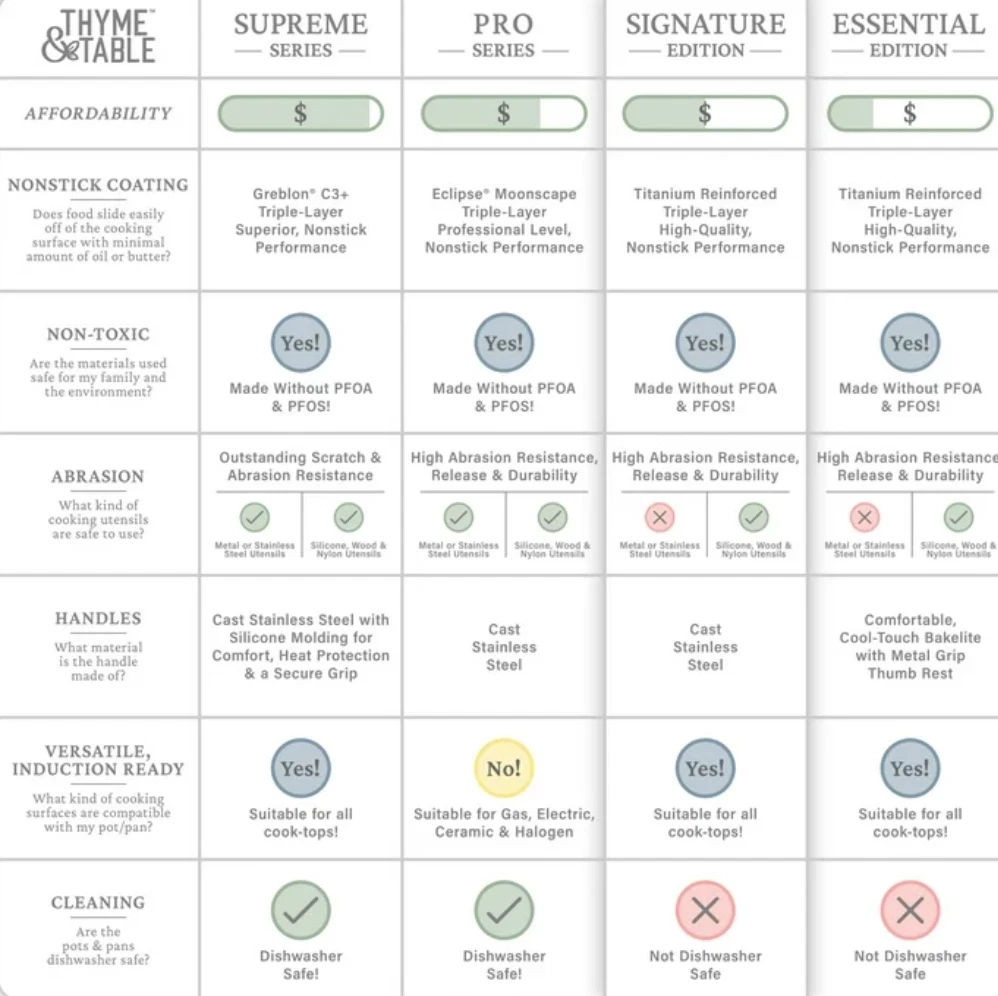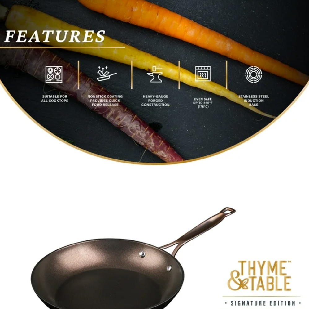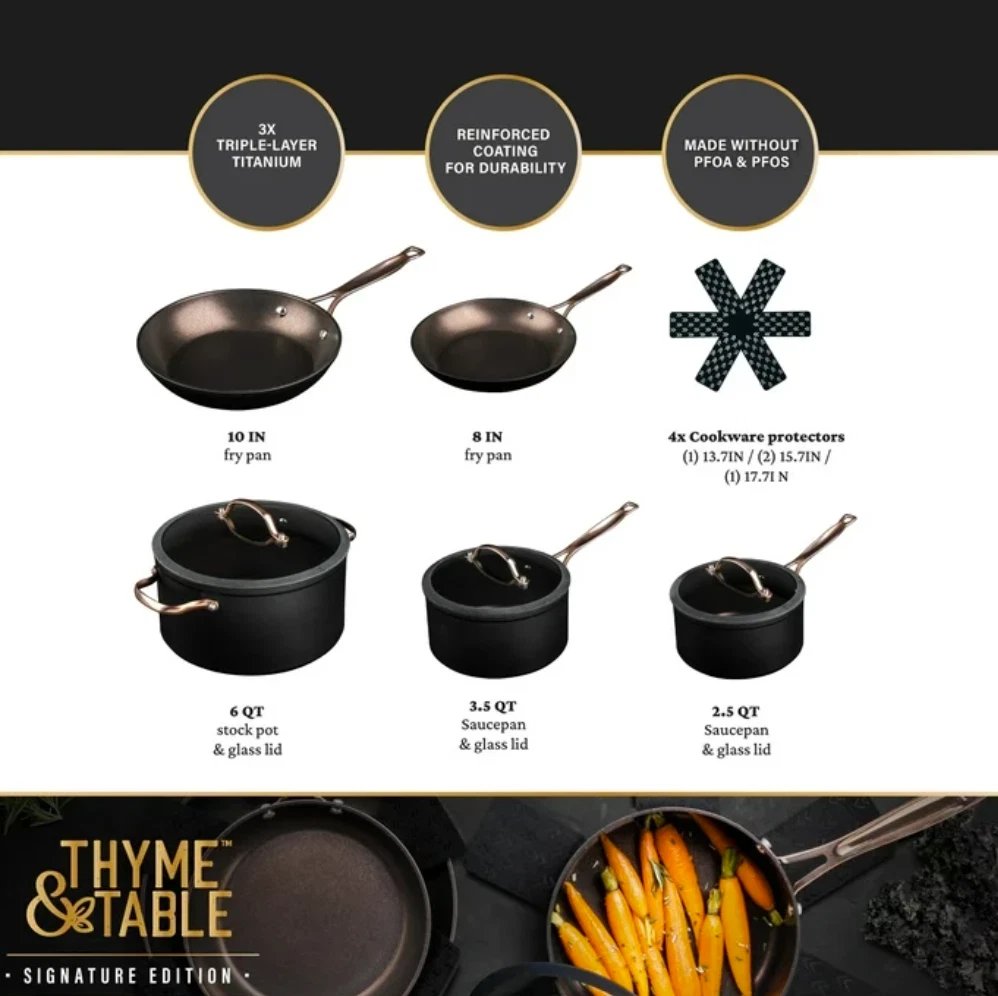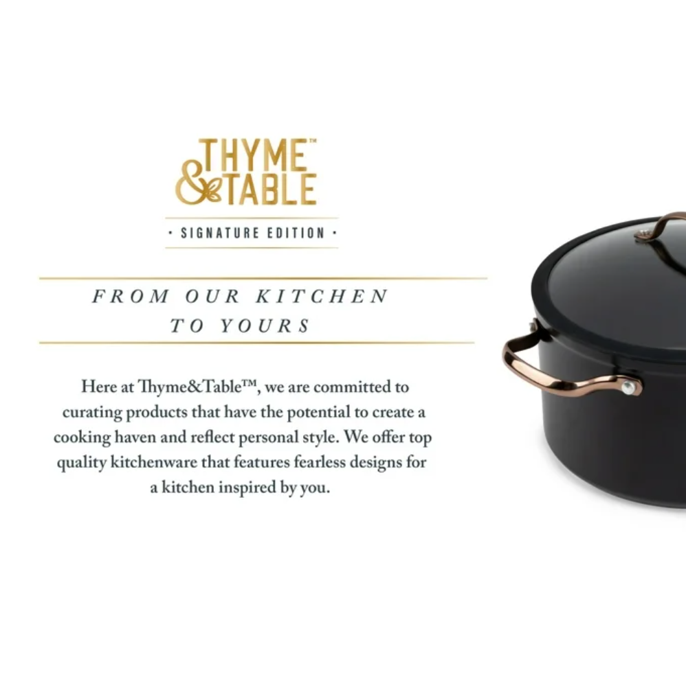 What’s Included: This set includes a generous 6-quart stock pot, a 2.5-quart saucepan, a 2-quart sauté pan, a 10-inch fry pan, and an 8-inch fry pan, equipping you for any culinary challenge. Additionally, it comes with 4 cookware protectors to keep your investment in pristine condition for years to come. Ultimate Engineering: Each piece is crafted to perfection using heavy gauged aluminum , ensuring exceptional results with every dish. Because of its stainless-steel induction base our cookware is engineered for all cooktops, including gas, electric or induction, and oven safe up to 350° Fahrenheit. Healthier Cooking and Non-Stick: The ultimate feature is its non-stick coating, allowing for quick cleanup, and helps to promote healthier cooking with effortless cleanup. Optimal Handling: Designed for ease and precision, our cookware features ergonomic riveted handles that provide superior grip and balance, ensuring safe and effortless maneuvering in the kitchen. Revolutionize your Kitchen: Capable of handling everything from frying and searing to simmering, braising, and boiling, this comprehensive set is designed to revolutionize your cooking experience. Offering versatility and durability in one stylish package, it elevates your kitchen setup. Enhance your culinary creativity with confidence using the Thyme & Table 12-Piece Ceramic Non-Stick Signature Cookware Set, Rose Gold. Use and Care: Dishwasher Safe, Handwash Recommended