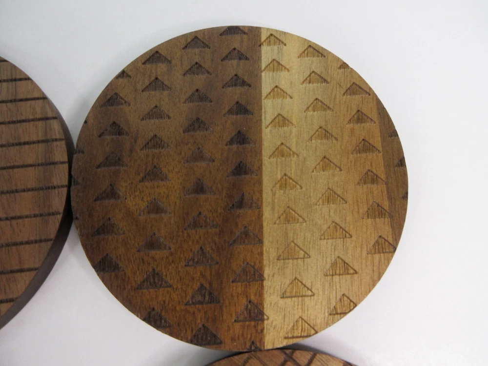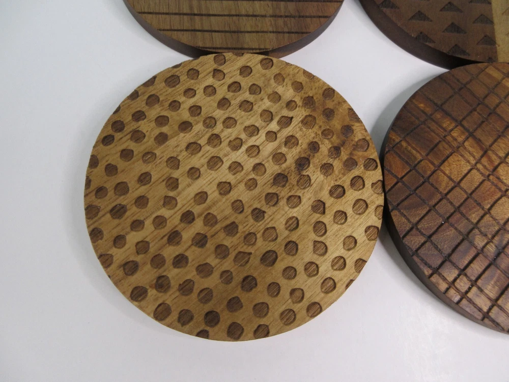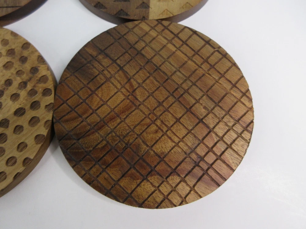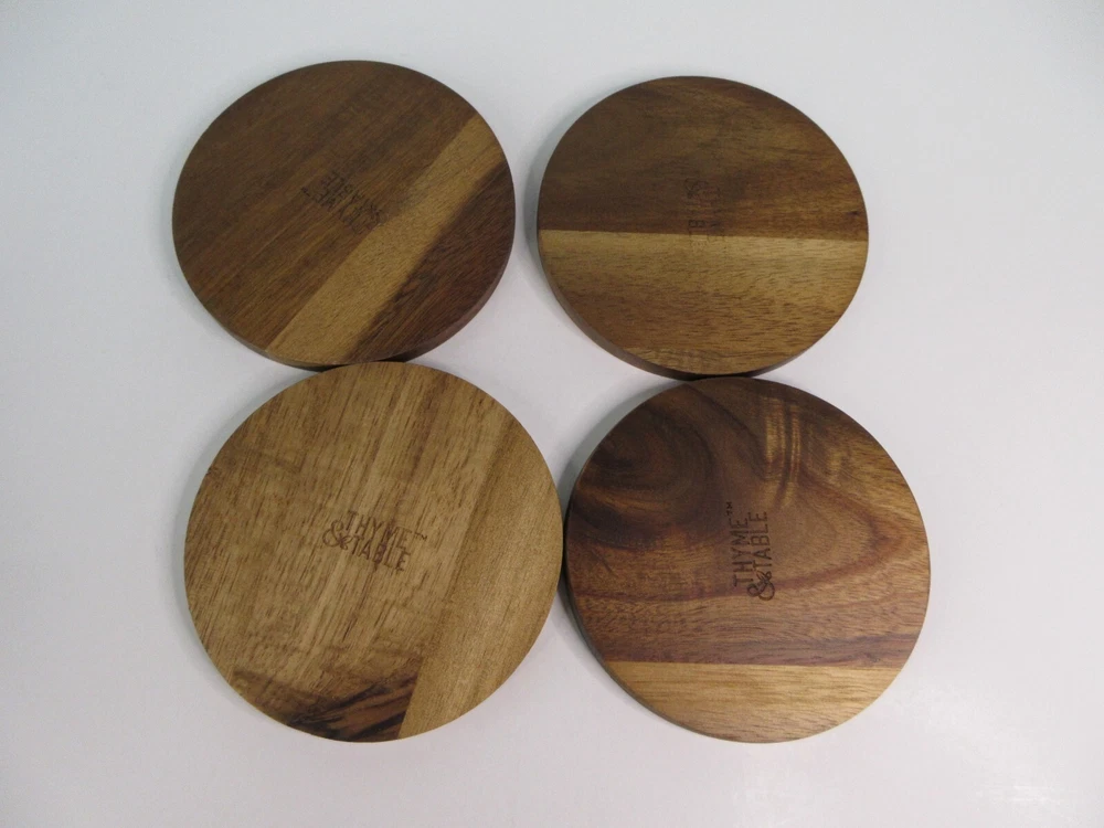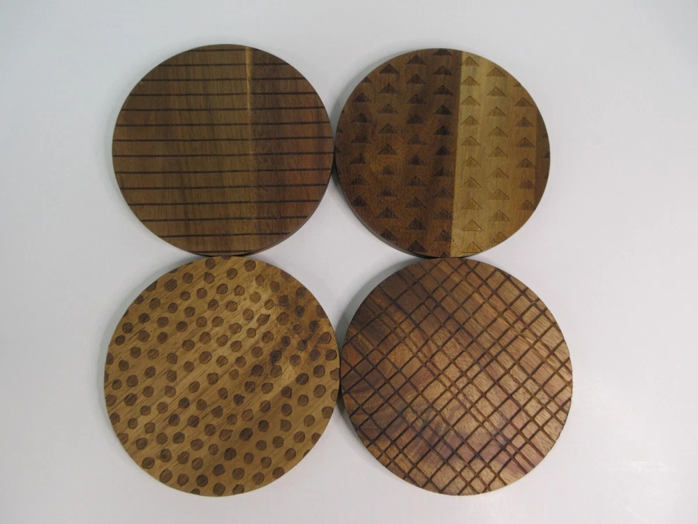Thyme & Table Acacia Wood Coasters, Brown, 4-Piece Set is a part of the Thyme & Table Essential Collection. The acacia wood coasters include four separate laser etched designs on each coaster. Coasters measure 4 inches in diameter, perfect for any size cup. These coasters look great in any kitchen and in any living space. CARE AND USE Wash in warm water. Hand wash before first use. Do not use in dishwasher. Do not soak for extended periods of time. Avoid abrasive cleaners. Made of Acacia Wood 4 Piece Set Laser Etched Design