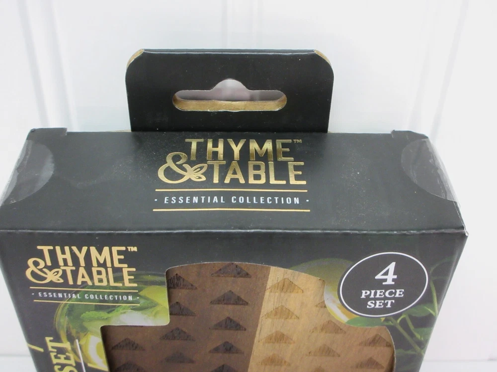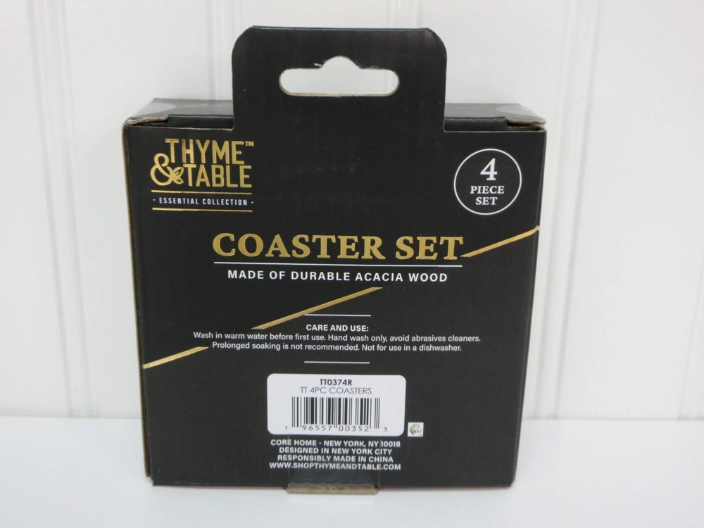 UPC: 196557003523 Features: Lightweight, Stackable Item Diameter: 4 in Brand: Thyme & Table Number of Items in Set: 4 Personalize: No Pattern: Geometric Material: Wood gtin13: 196557003523 Shape: Round Type: Coaster Set Color: Brown MPN: TT0374R Style: Contemporary Seller Notes: “New, but I opened the box to take pictures of the coasters and the different wood shades” Occasion: All Occasions