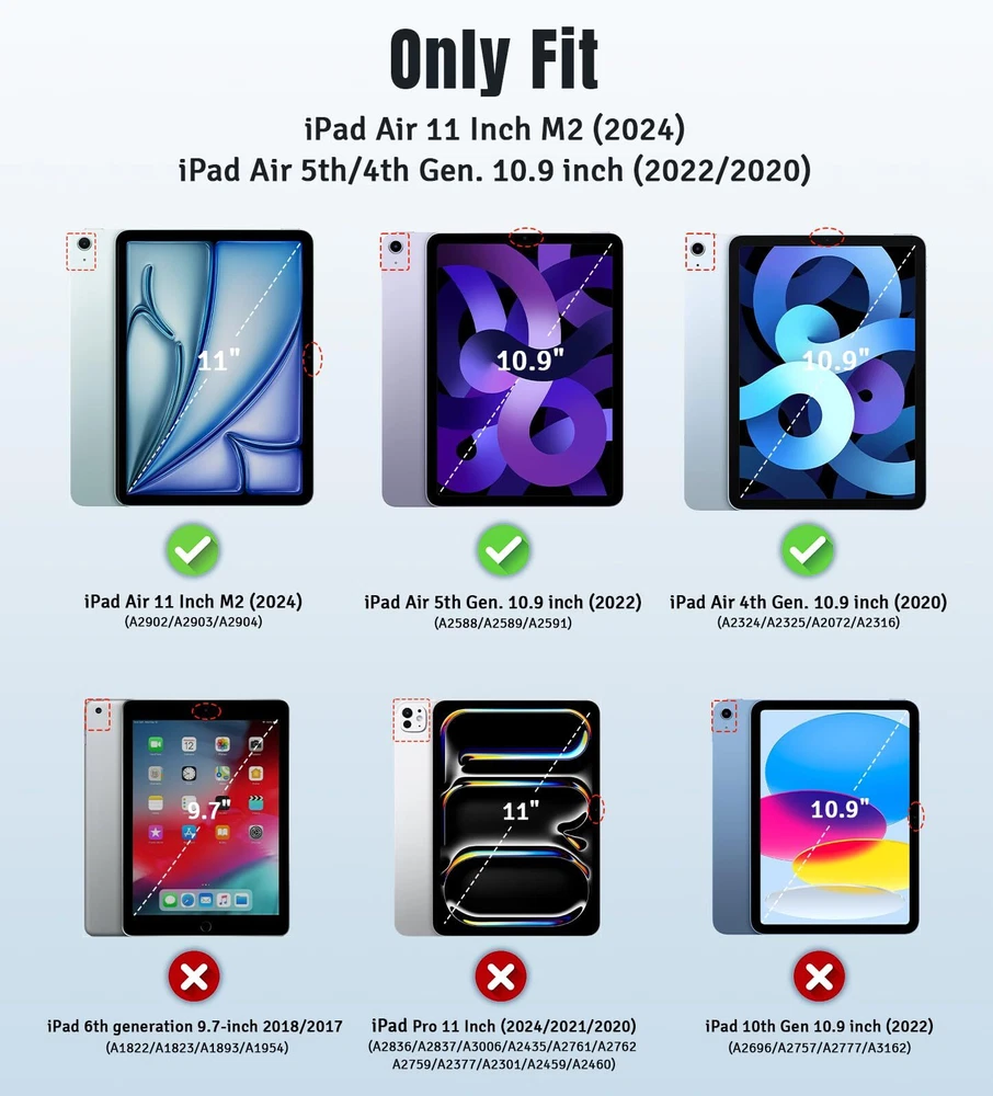 TiMOVO for iPad Air 11 Inch Case M2 2024, iPad Air 5th Generation 2022/iPad Air Features: Compatibility: Preciously designed for iPad Air 11 Inch M2 2024(A2902/A2903/A2904)/iPad Air 5th generation 2022(A2588/A2589/A2591), iPad Air 4th generation 2020 (A2072/A2316/A2324/A2325). Note: It will not be compatible with other iPad Great Protection: This iPad Air 11 inch M2 case with front PU leather and back hard PC provides protection against scratches, shocks, drops, and impacts. It is convenient for you to see the Apple icon with the frosted translucent back Slim and Light-weight: Slim and lightweight design add no bulk to your iPad Air 11-inch/5th/4th generation, you could carry it with your iPad every time and everywhere Auto Wake/Sleep: This iPad Air 11 inch cover Supports auto wake/sleep function, and protects and extends battery life. Precise cutouts, with all buttons and ports accessible, such as Touch ID unlock function and Apple pencil charging Two Viewing Angles: The iPad Air 11-Inch Case with a trifold stand provides 2 convenient stand positions for reading, watching movies, or typing Features: Compatibility: Preciously designed for iPad Air 11 Inch M2 2024(A2902/A2903/A2904)/iPad Air 5th generation 2022(A2588/A2589/A2591), iPad Air 4th generation 2020 (A2072/A2316/A2324/A2325). Note: It will not be compatible with other iPad Great Protection: This iPad Air 11 inch M2 case with front PU leather and back hard PC provides protection against scratches, shocks, drops, and impacts. It is convenient for you to see the Apple icon with the frosted translucent back Slim and Light-weight: Slim and lightweight design add no bulk to your iPad Air 11-inch/5th/4th generation, you could carry it with your iPad every time and everywhere Auto Wake/Sleep: This iPad Air 11 inch cover Supports auto wake/sleep function, and protects and extends battery life. Precise cutouts, with all buttons and ports accessible, such as Touch ID unlock function and Apple pencil charging Two Viewing Angles: The iPad Air 11-Inch Case with a trifold stand provides 2 convenient stand positions for reading, watching movies, or typing eBay integration by