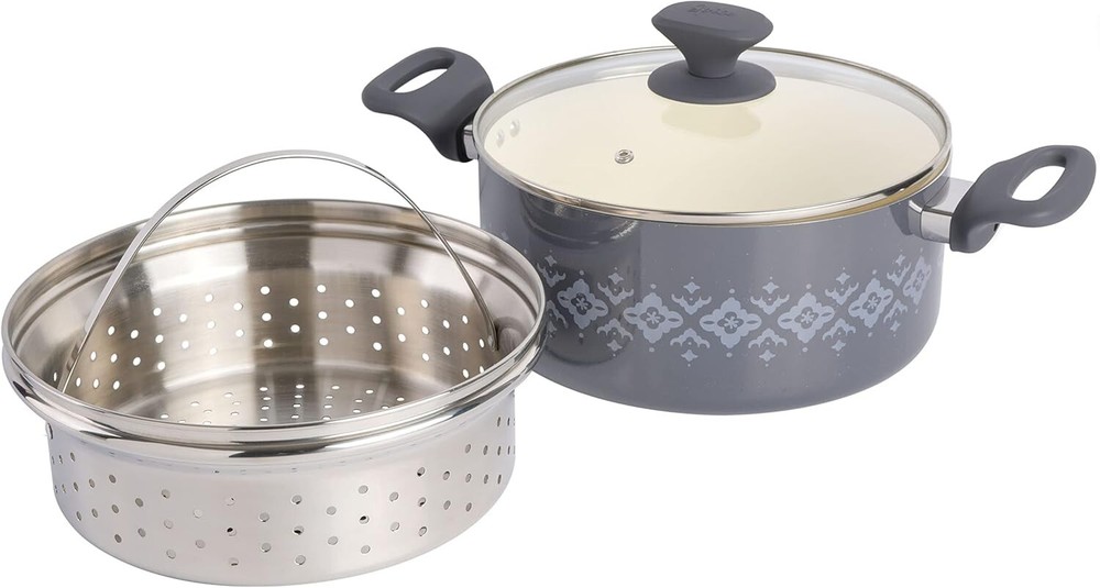 Experience the versatility of the Spice by Tia Mowry Savory Saffron 5 QT Nonstick Ceramic Dutch Oven, a must-have addition to your kitchen cookware collection. Crafted for convenience, this Dutch oven is suitable for both gas and electric stovetops, ensuring you can cook your favorite meals with ease. The round shape and 5-quart capacity make it ideal for a variety of dishes, whether you're braising, roasting, or sautéing. The ceramic construction provides a durable cooking surface that is complemented by a non-stick coating, allowing for easy food release and cleanup. The Dutch oven comes complete with a matching lid, designed to trap heat and flavors, enhancing the cooking process. Its sleek gray color adds a touch of sophistication to your cookware array, making it as stylish as it is functional. HEAVY-GAUGE ALUMINUM CONSTRUCTION: Distributes heat evenly NONSTICK CERAMIC INTERIOR: PFOA-free and BPA-free nonstick surface for healthier, low-oil cooking VIBRANT ENAMEL EXTERIOR: Durable and lively enamel designs that brighten up your kitchen STAY-COOL HANDLES: Soft-touch handles offers safe and secure grips for balance and easy transport VERSATILE: Perfect for sautéing, simmering, steaming, and more. Includes stainless steel steamer insert. CARE INSTRUCTIONS: Handwash recommended, Dishwasher Safe. Oven safe to 300 degrees