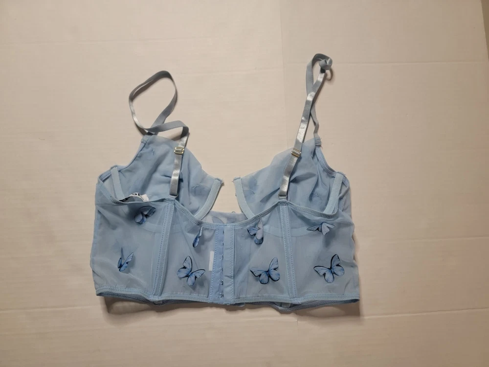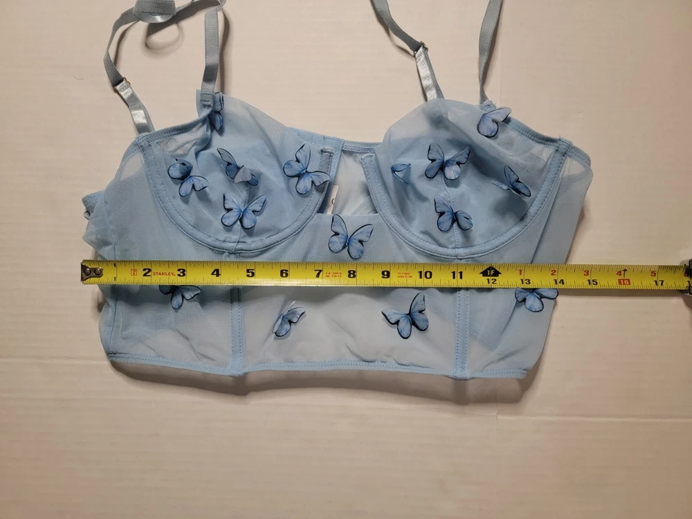 This Tic Toc bralette is a stylish addition to any lingerie collection. The powder blue color and butterfly theme make it a unique piece that is sure to catch the eye. The bralette features a hook and loop closure and adjustable bra straps for a comfortable and secure fit. Made from a combination of nylon and spandex, this bralette is both sheer and comfortable. The strap accents and back closure add an extra touch of elegance to the design. Available in size XL, this bralette is perfect for any woman who wants to feel confident and comfortable in her undergarments.