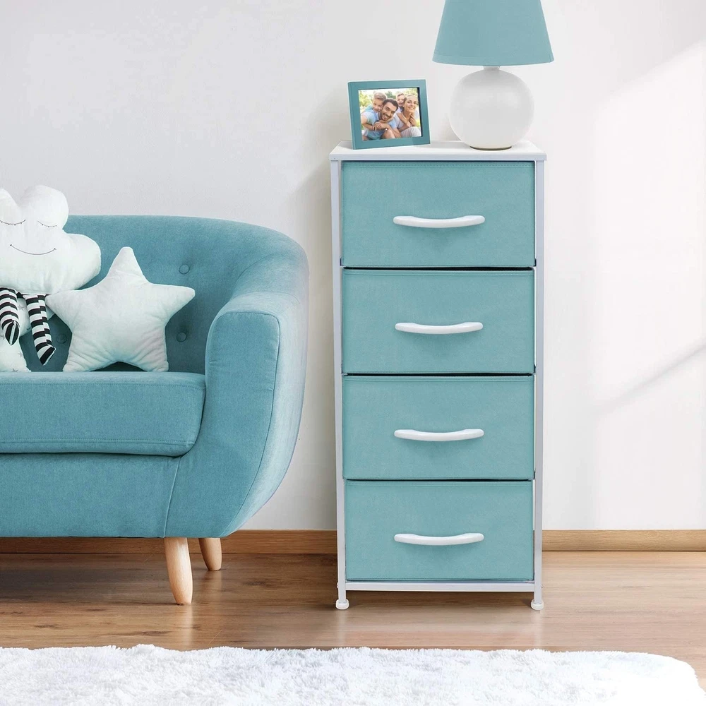 Add a pop of color and functionality to your child's bedroom with the Sorbus 4-Drawer Nightstand! This lightweight nightstand is perfect for storing clothes, toys, and household items. The soft pastel colors make it a great addition to any nursery, playroom, or bedroom. The tabletop surface is ideal for lamps, books, and other display items. The four spacious fabric drawers have built-in carry handles for easy transport and can be folded flat for storage when not in use. The Sorbus Furniture Collection offers a variety of drawer configurations to fit your storage needs.Features: Four spacious fabric drawers for easy storage Soft pastel colors ideal for any nursery, playroom, or bedroom Tabletop surface for display items Lightweight and easy to assemble with included hardware and Free Shipping Over $49.99* Details 4 Drawer Bedside Nightstand Chest Tower Bedroom Dresser, Pastel Colors Product Description: Add a pop of color and functionality to your child's bedroom with the Sorbus 4-Drawer Nightstand! This lightweight nightstand is perfect for storing clothes, toys, and household items. The soft pastel colors make it a great addition to any nursery, playroom, or bedroom. The tabletop surface is ideal for lamps, books, and other display items. The four spacious fabric drawers have built-in carry handles for easy transport and can be folded flat for storage when not in use. The Sorbus Furniture Collection offers a variety of drawer configurations to fit your storage needs. Features: Four spacious fabric drawers for easy storage Soft pastel colors ideal for any nursery, playroom, or bedroom Tabletop surface for display items Lightweight and easy to assemble with included hardware and instructions Built-in carry handles on each drawer for easy transport Sturdy steel frame and durable MDF wood top with smooth finish Drawers approximately 8" deep for ample storage