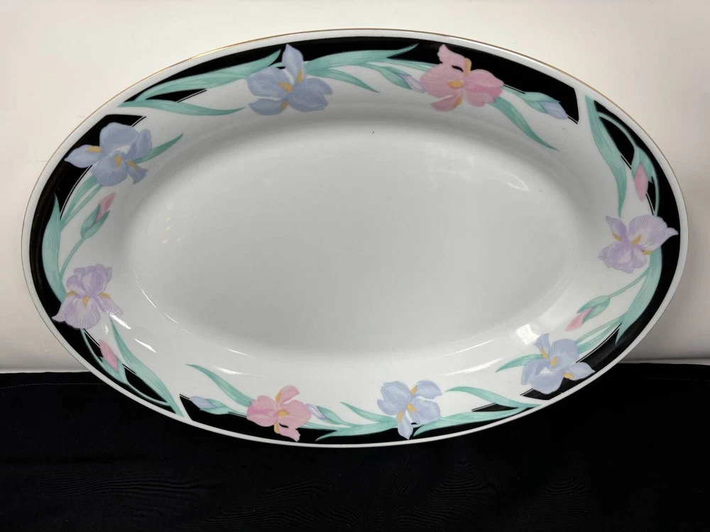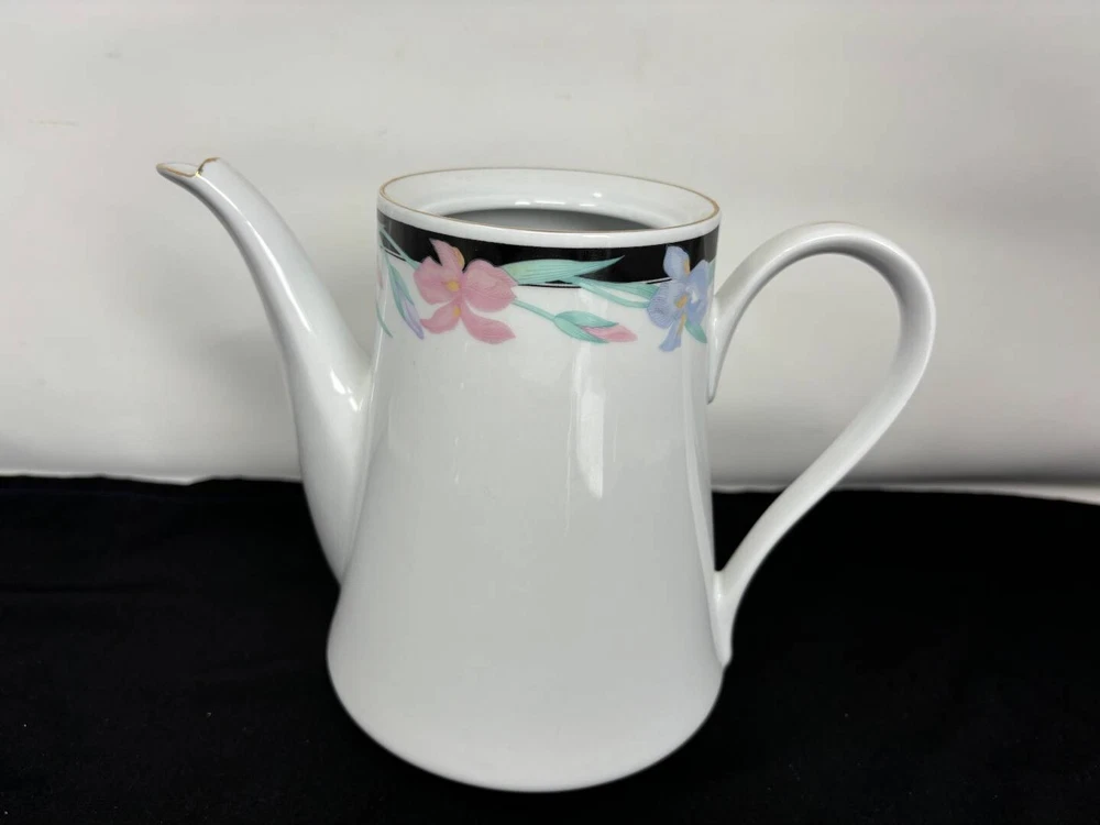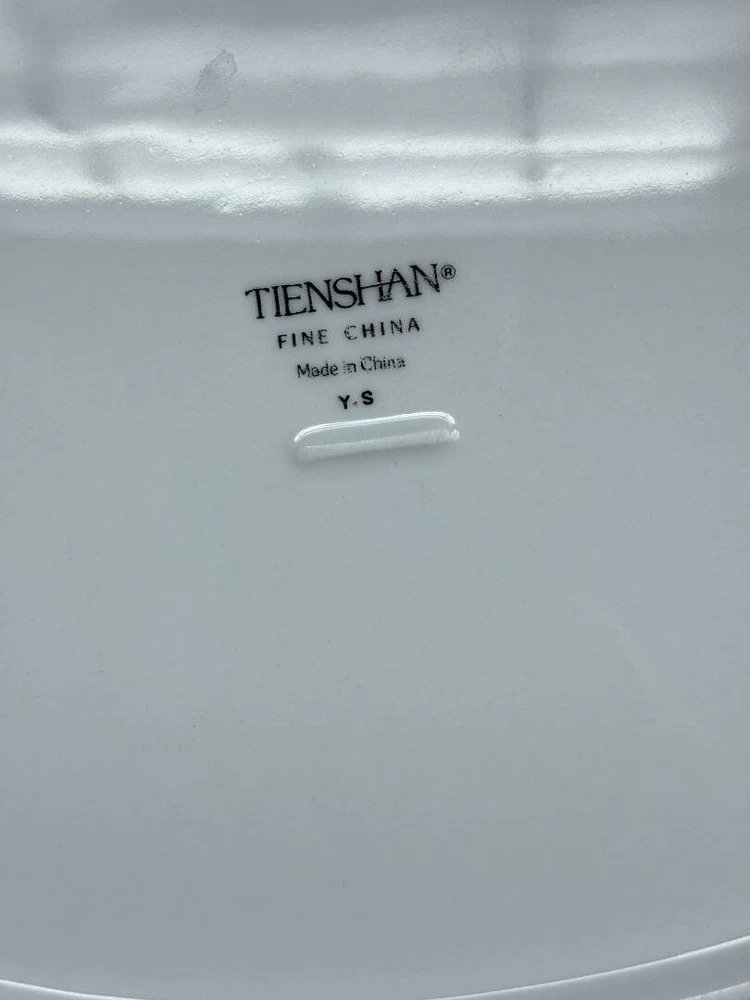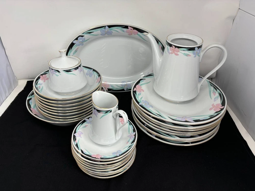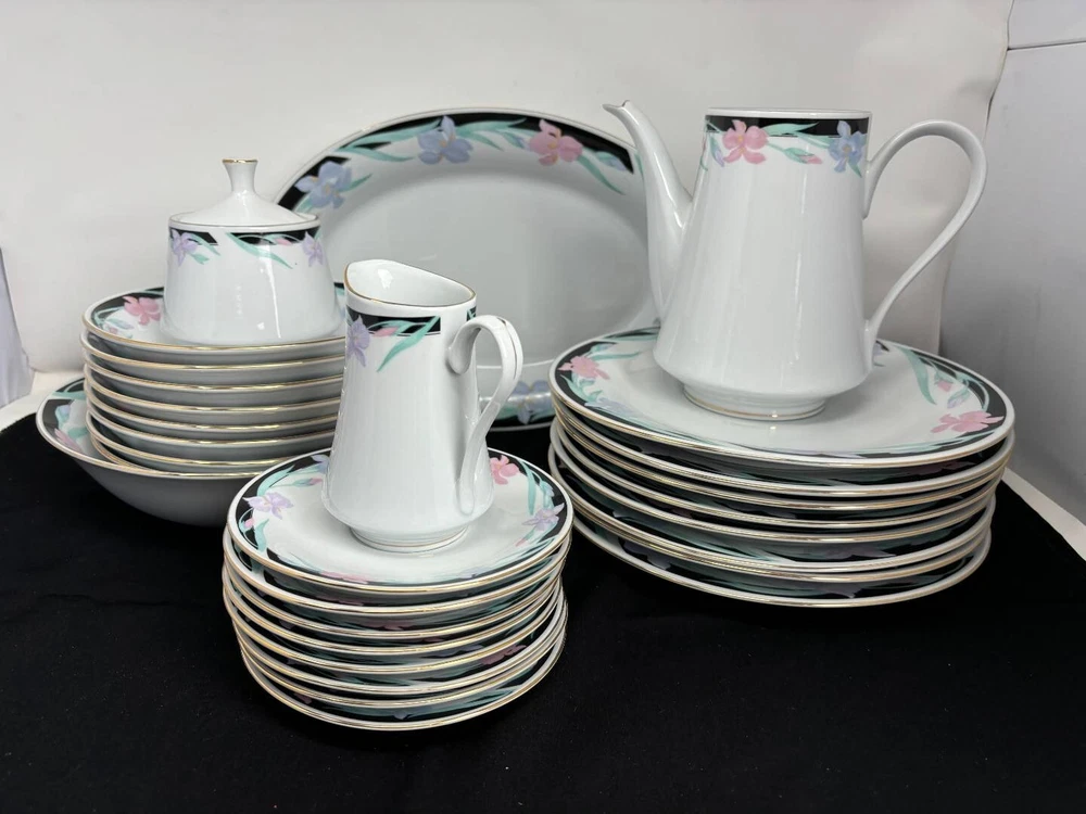 This is an exquisite 8-person Tienshan Fine China Dinner Set. The gorgeous Isabella collection is perfect for any occasion with it's incredible contrasts of white, black and floral. The set includes 30 pieces, with 8 dinner plates, 8 bowls, 8 tea saucers, 1 serving platter, 1 serving bowl, 1 creamer, 1 sugar bowl with lid, and tea pot. The floral pattern adds a touch of elegance to the set, making it an ideal choice for multipurpose or formal occasions. Crafted in China, this original Tienshan set is high polished and features a timeless vintage design. The set is both microwave and dishwasher safe, making it practical for everyday use. Add a touch of sophistication to your dining experience with this beautiful Tienshan Isabella Collection fine china set. This set is in amazing condition, with no cracks or chips noted. There are a couple minor scrapes on the paint of a couple of the pieces, and minor wear of the gold trim, but all as to be expected with a vintage set having hosted many events!