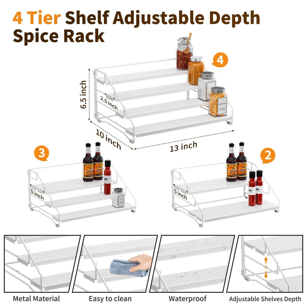 The 4-tier tiered spice rack is a depth adjustable spice rack organizer for cabinets that effectively increases cabinet storage capacity. Its unique ladder design keeps spice bottles neatly arranged and easily accessible. Each spice rack can hold up to 24 spice bottles, with dimensions of 13 inches x 10 inches x 6.5 inches and a depth of 2.5 inches. This design is not only suitable for cabinets but also for storing various items on countertops, in pantries, bedrooms, bathrooms, and more. Made of high-quality metal, the spice rack is strong and sturdy, with a sheet metal base on each tier that ensures stable placement of spice bottles and reduces the risk of tipping over. You can flexibly adjust the depth according to the size of the bottles, making efficient use of cabinet space and providing the perfect storage solution for spice bottles of various sizes. Note that the spice bottles are not included. 4-tier tiered spice rack features a folding design that makes it easy to assemble without screws and comes with simple instructions. You can quickly put together a cabinet countertop spice rack with ease. Cleaning is a breeze; just wipe it with a rag to make it look brand new. In addition to storing spice bottles, this spice rack can also be used to store toiletries, nail polish bottles, cosmetics, medicines, or arts and crafts supplies. You can neatly arrange and display them on the desired countertop, in the cabinet, or in the corner, keeping your kitchen or pantry neat and organized. This spice rack is not just a spice organizer; it is a multi-functional storage solution suitable for various home environments. 4 Tier Spice Rack Increased Cabinet Storage Capacity: 4 tiered spice rack organizer for cabinet with ladder design keeps your spices organised and easy to reach. Holds 24 spice jars capacity, each spice organizer size is: 13 inchx10inchx6.5inch, depth has: 2.5 inches. Suitable for most items storage for cabinets, countertops, pantries, bedrooms, bathrooms and more. Adjustable Depth Design, Rationalisation of Space: The tiered spice rack adjustable depth, 4 shelf can be combined to adjust the depth at will. Adjust the depth according to the size of spices you are storing, making efficient use of cupboard space. The perfect storage solution for multi-size spice jars. NOTE: JARS NOT INCLUDED. Easy to Assemble & Clean: Spice shelf organizer for cabinet with folding design, easy to assemble, no screws required, with simple instructions. Get a cabinet countertop spice rack organizer in a breeze. Simply wipe with a rag and the spice rack is ready, brand new, caring for your spice cabinet organizer has never been easier. Metal Material Strong & Sturdy: Spice shelf is made of high-quality metal, the each tier has a sheet metal base design. making the spice bottles more stable to place and less likely to tip over. With cabinet spice rack, you can nicely organized your spice bottles in your cabinet in leveled tiers. Multiple Item Storage: Countertop spice rack, more than just a spice organizer for your cabinet, it can also be used to store toiletries or nail polish bottles, cosmetics and medicines, or arts and crafts supplies. You can arrange and display them in an orderly manner on the desired countertop, in the cabinet, or in the corner!