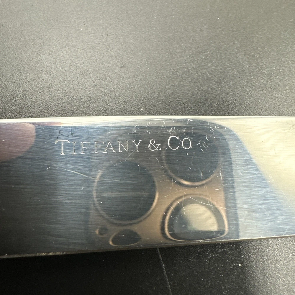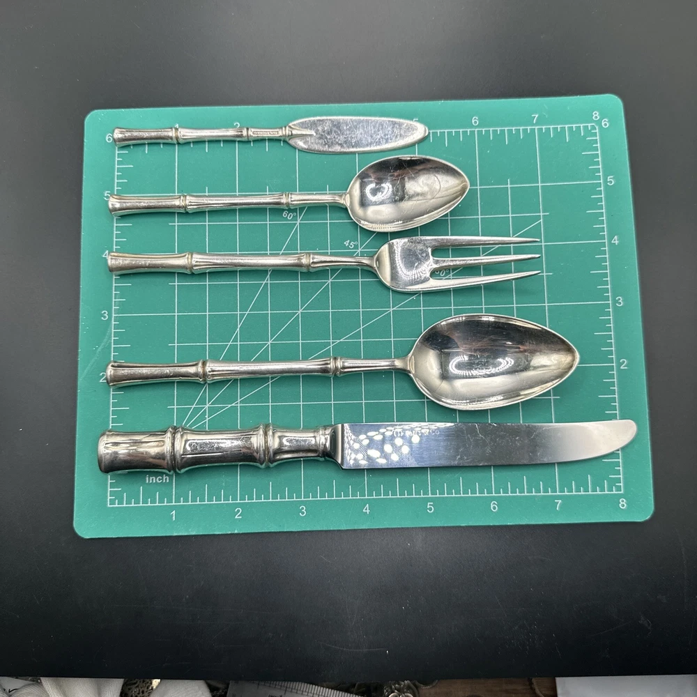 Elevate your dining experience with this exquisite 5-piece flatware set from Tiffany & Co. Crafted from sterling silver, this set features a stunning bamboo pattern that adds a touch of elegance to any table setting. The set includes a knife, butter knife, fork, teaspoon, and dessert spoon, all of which are expertly crafted with the finest materials. The Tiffany & Co. sterling silver flatware set is perfect for any occasion, whether you're hosting a formal dinner party or enjoying a casual meal with family. The set is post-1940 and has been crafted with an aesthetic movement style, making it a timeless addition to any collection. Add this beautiful set to your collection today and enjoy the luxury and elegance of Tiffany & Co.