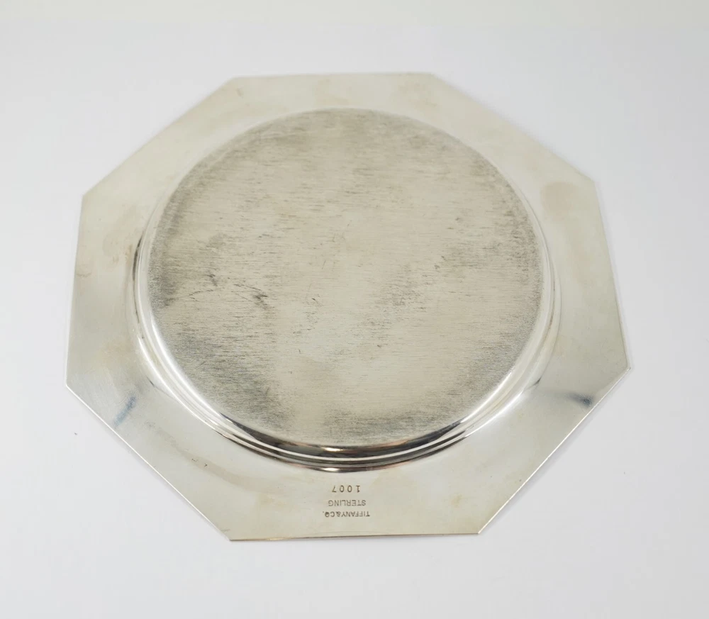 Featured is This Tiffany & Co. Sterling Silver Octagon Trinket Dish #1007 5 1/2" Diameter Metal: Sterling Silver Manufacturer: Tiffany & Co Stamped: Tiffany & Co Sterling - #1007 Total Lot Weight: approx. 121.16 Grams Dimensions: approx. 5 1/2" Ref#: 705-16529 CW Condition: Good Estate condition; Sold as is , with a few minor surface scratches and/or tiny dings/chips consistent with age and/or normal wear. ABOUT US Treasures Recycled is a family owned business that has been a top-rated plus seller on eBay for over 20 years. We are proud of our reputation as a reputable seller who stands behind everything that we sell. We have several graduate gemologists on staff. We have had a 100% positive feedback rating for many years and it is our goal to continue to maintain this standard of excellence for our customers. GENERAL Our office and shipping department are open Monday through Friday from 10:00 am until 5:00 pm Eastern time. We are closed on weekends and holidays. If you send us a message outside of our business hours we will answer you the next business day. Auctions include actual items pictured in listing. Photos are enlarged to show details. Any dark, light and reddish areas are usually camera or photographer reflections. We describe our items as accurately as we can. All items are sold as-is. We are not able to size rings. PAYMENTS Payment is due within 4 days of purchase. If payment is not received order will be subject to immediate cancellation. We accept payments through eBay's Managed Payments program. We do not accept cryptocurrency, Checks, or Money Orders as forms of payment. We do not accept "trading" as a form of payment for any of our items. SHIPPING We offer free shipping, with tracking number and insurance, on all items purchased to addresses within the United States. We ship the next business day after payment has been received so you will receive your item as quickly as possible. Shipping method is usually by USPS First Class Mail but may vary based on the item being shipped. We will request a signature upon delivery for all shipments valued at $200 or higher. This is for your protection as well as ours. All shipments are subject to shipper's delivery schedules and limitations. If an order is returned to us because of customer's failure to pick up or due to incorrect address information, customer will be responsible for providing a new insured label for shipping and redelivery. Please make sure to use the correct shipping address during checkout as we are only able to ship to the address confirmed to us by eBay. RETURNS We offer free returns within 30 days of purchase. We will gladly refund any item returned to us in its original, unaltered condition. Any item that has been sized or modified by the customer in any way is nonreturnable and nonrefundable. If the item's original packaging is removed, damaged, or if seal is broken on items sold in sealed condition, item will be ineligible for return and order will not be refunded . We want you to be100% satisfied with your purchase! If an item arrives damaged for any reason not already specified in the original item listing description, please send us a message with a description of what is wrong with the item and any photos depicting the issue and we will review on a case-by-case basis. INTERNATIONAL SHIPPING We do not offer International Shipping. We only ship domestically within the U.S. If buyer opts to use a 3rd-Party shipper to send item internationally, we cannot be held liable for condition of item upon arrival to final destination and item will not be eligible for return. If buyer uses a 3rd-Party shipper to send item internationally and the item is lost in transit after being shipped by 3rd-Party, Treasures Recycled will not be held liable and order will not be eligible for refund. We add new items daily so please visit our store to see the many items we have for sale!! Thank you for your interest in our auctions! We would appreciate your business!!