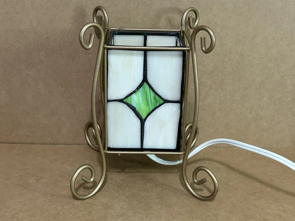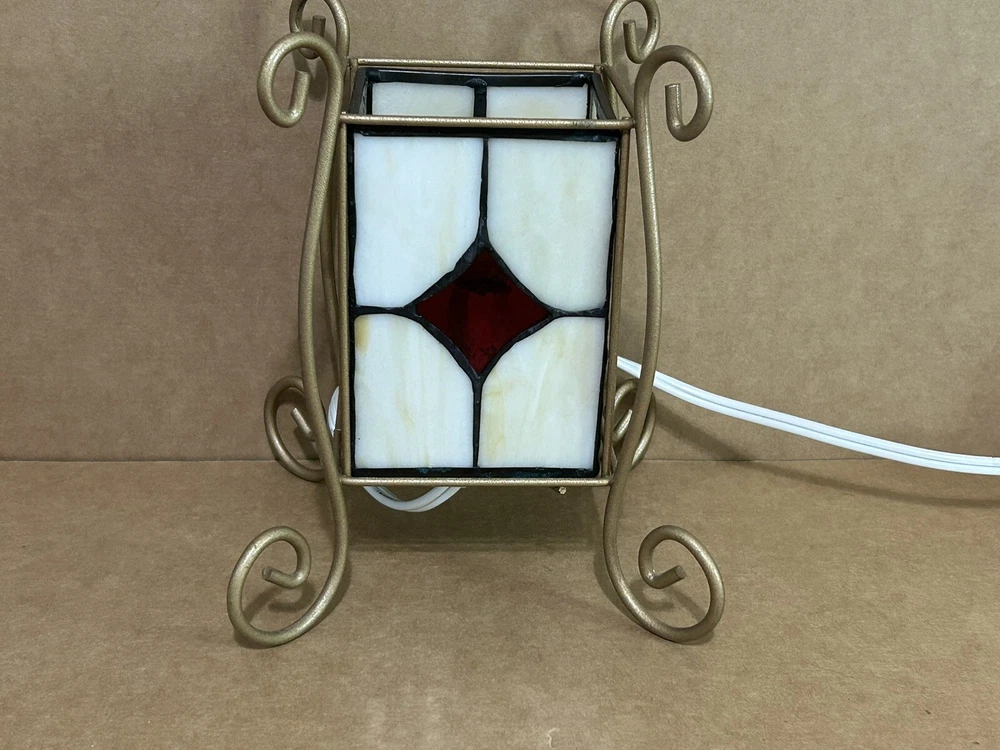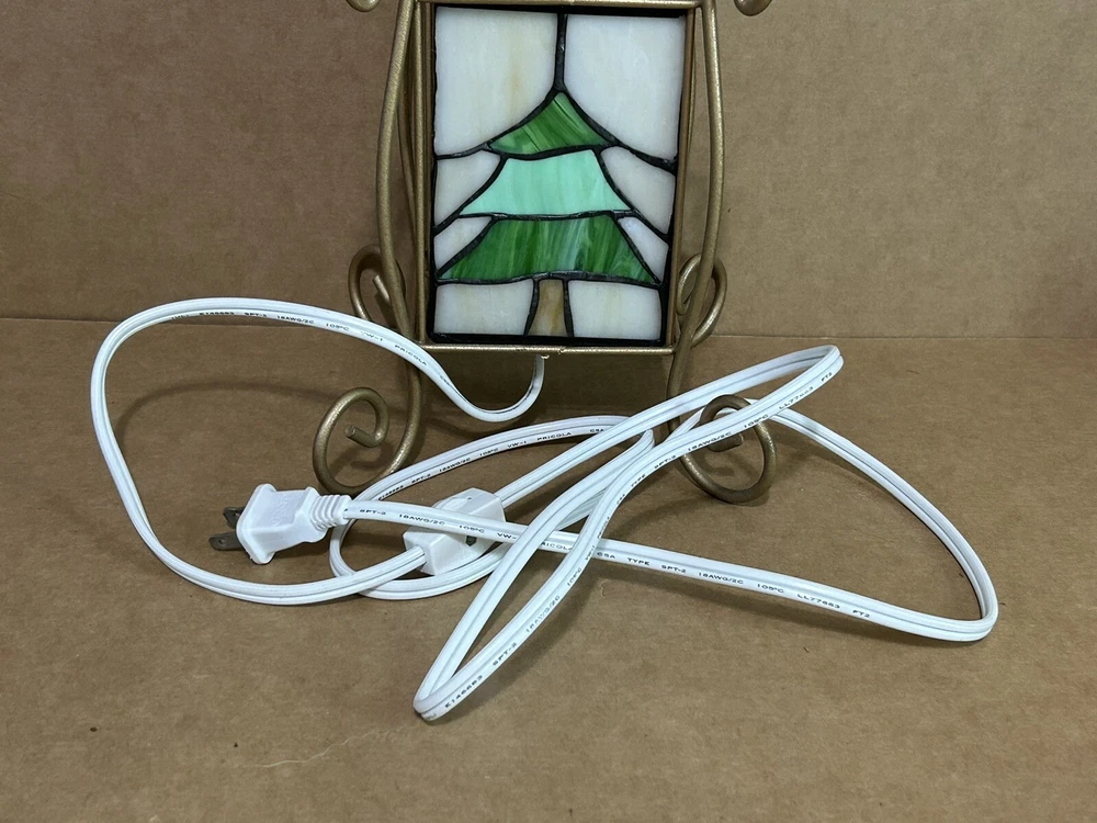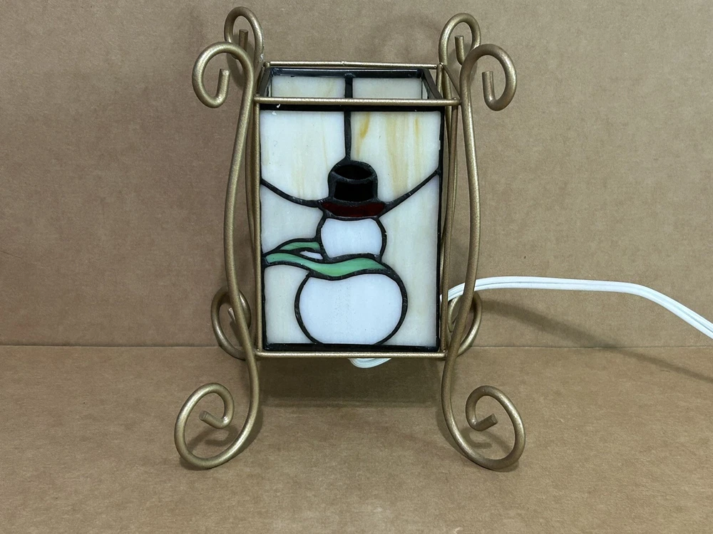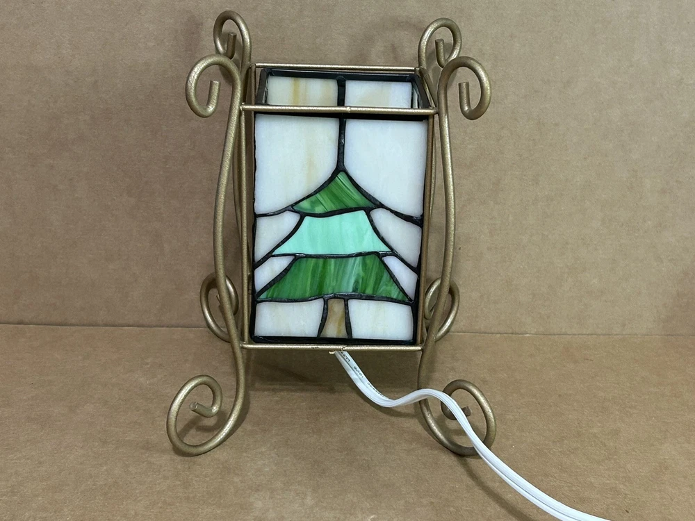 This vintage accent lamp from Tiffany & Co. features a beautiful stained glass design with a Christmas tree and snowmen motif. The lamp is made of high-quality glass and is in perfect working condition. It is a great addition to any collection or as a decorative piece for your home. The brand name is synonymous with quality and style, making this lamp a must-have for any Tiffany & Co. enthusiast. Add a touch of elegance to your space with this stunning stained glass lamp. S21