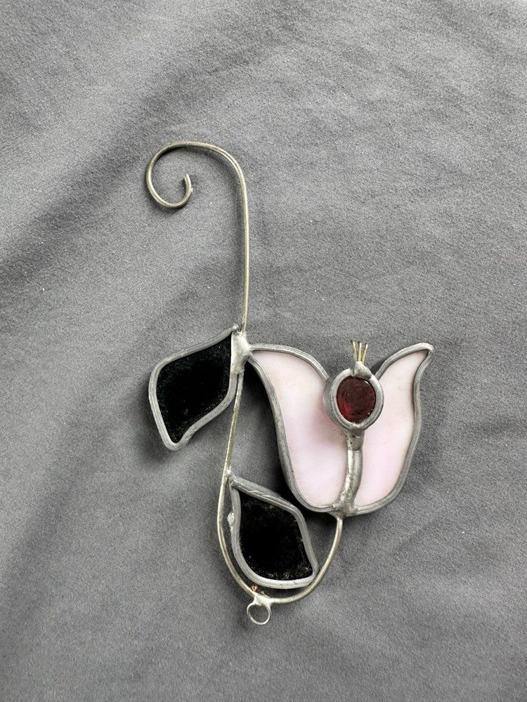 The Tiffany Stained Glass Pink Tulip Sun Catcher is a handmade decorative accessory that adds a vintage touch to any room. Made with hand-blown glass in a pink color, this suncatcher features a beautiful tulip design that captures the light and creates a warm ambiance. With dimensions of 5 inches in width, this unique piece from Tiffany & Co. is a perfect addition for adult collectors or those looking to enhance their home décor with a touch of retro style. Easy to clean with a damp cloth, this sun catcher is a beautiful and unique accent piece for any space.