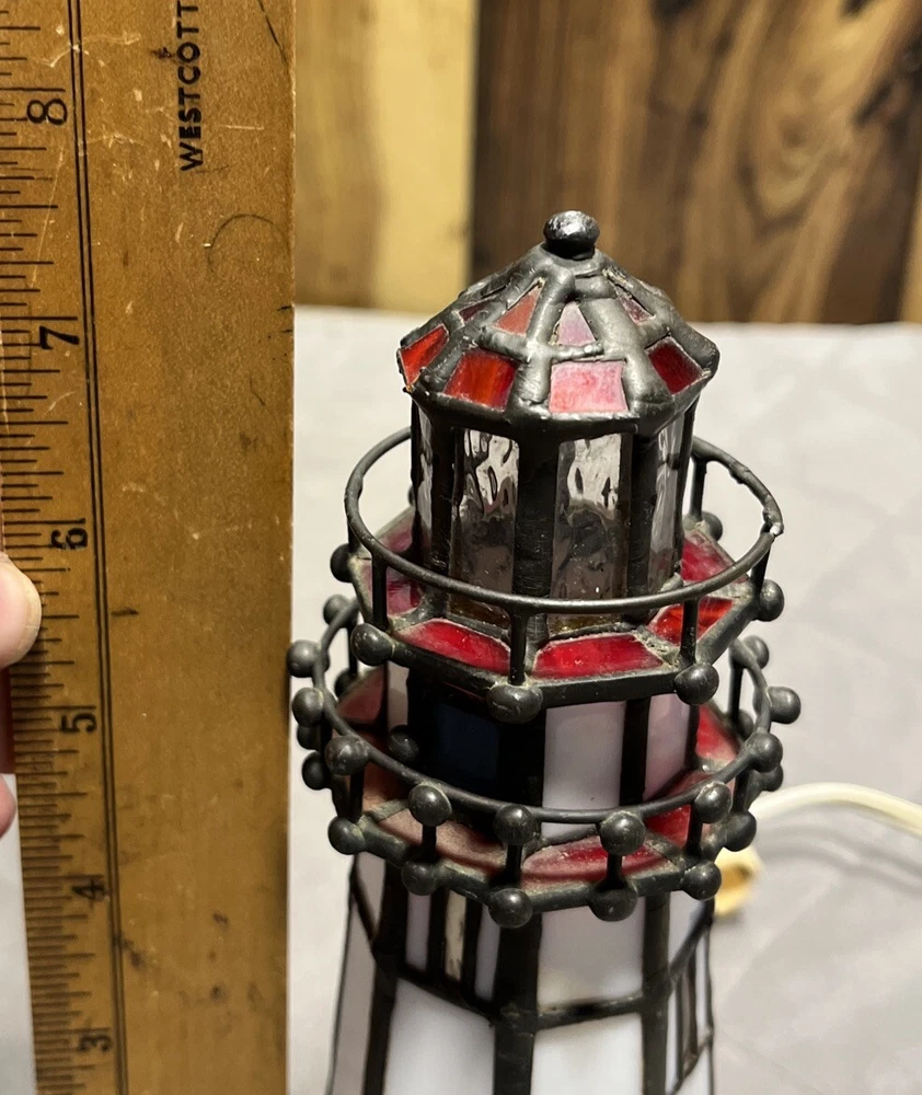 This charming night light will add a touch of coastal elegance to any room in your home. Crafted from high-quality stained glass and modeled after a classic lighthouse design, this piece is a licensed reproduction from the 1990s. The intricate detailing and multicolor hues make it a unique and eye-catching addition to your collection. Powered by corded electricity, it is both functional and beautiful.