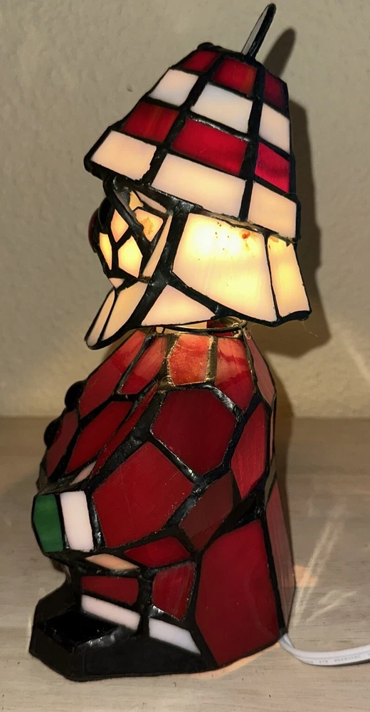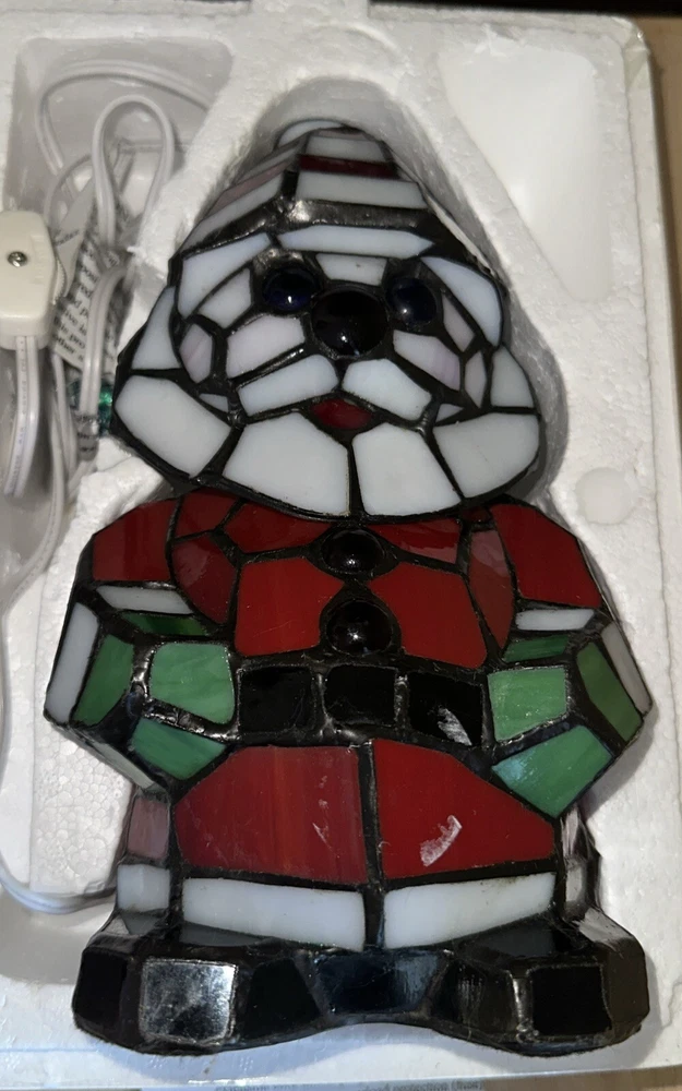 Tiffany Style Stained Glass Bobble Head Santa Table Lamp Working, Christmas Lamp It is in great preowned condition with no chips , cracks or breaks. Comes in original foam package with care instructions the only concern there is no top to foam package on bottom. Please review all of the photos for measurements and details. Kindly send me a message if you have any questions Thank you for looking 🎄 Bin 15