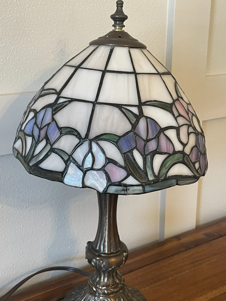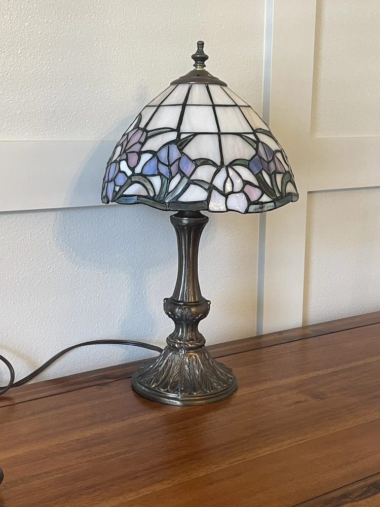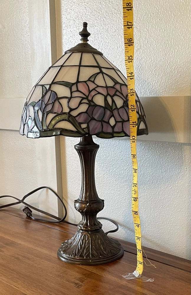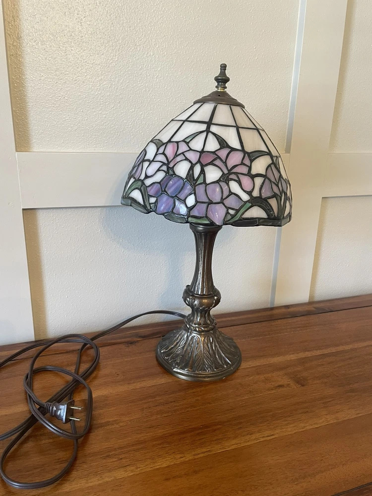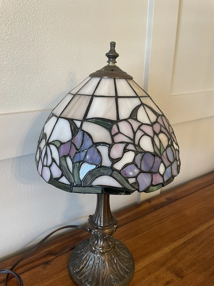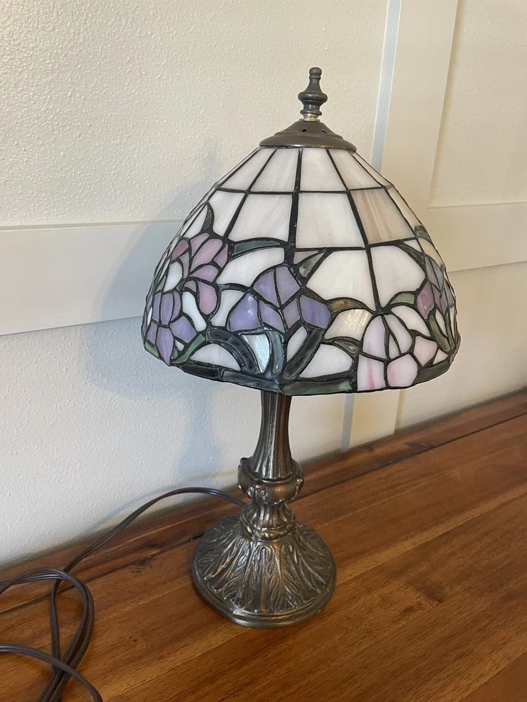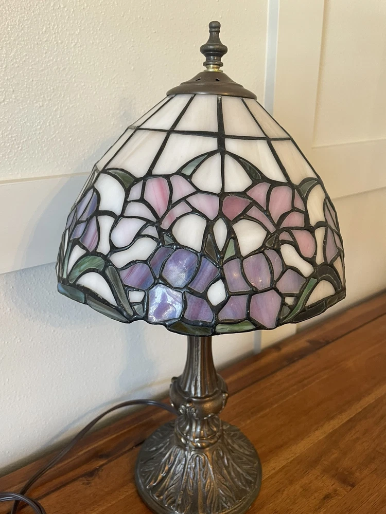 Add a touch of vintage elegance to your home with this beautiful Tiffany style table lamp. The stained glass shade features a stunning bouquet of purple and pink flowers, while the metal base and corded electric power source ensure lasting use. This lamp is the perfect addition to any Victorian style decor, with a round shade shape and multicolor design that will brighten up any room. Measuring 17 1/2-18 inches in height, this Leviton brand lamp is a must-have for any collector or lighting enthusiast. 2 small cracks shown in photos. Preowned works great. Original packaging not included.