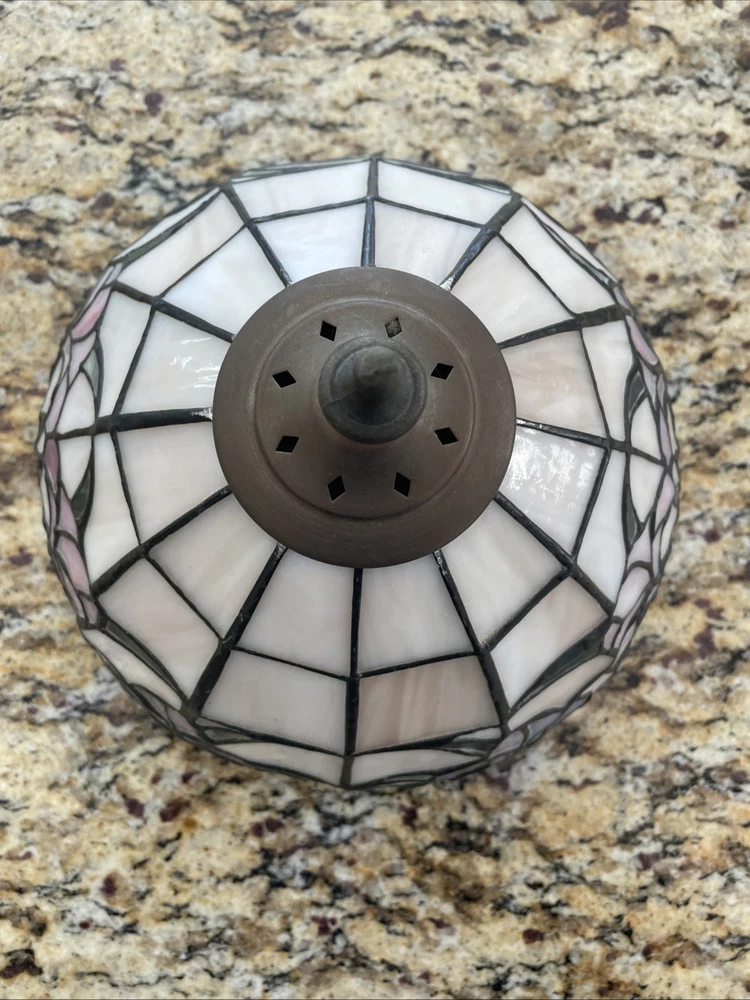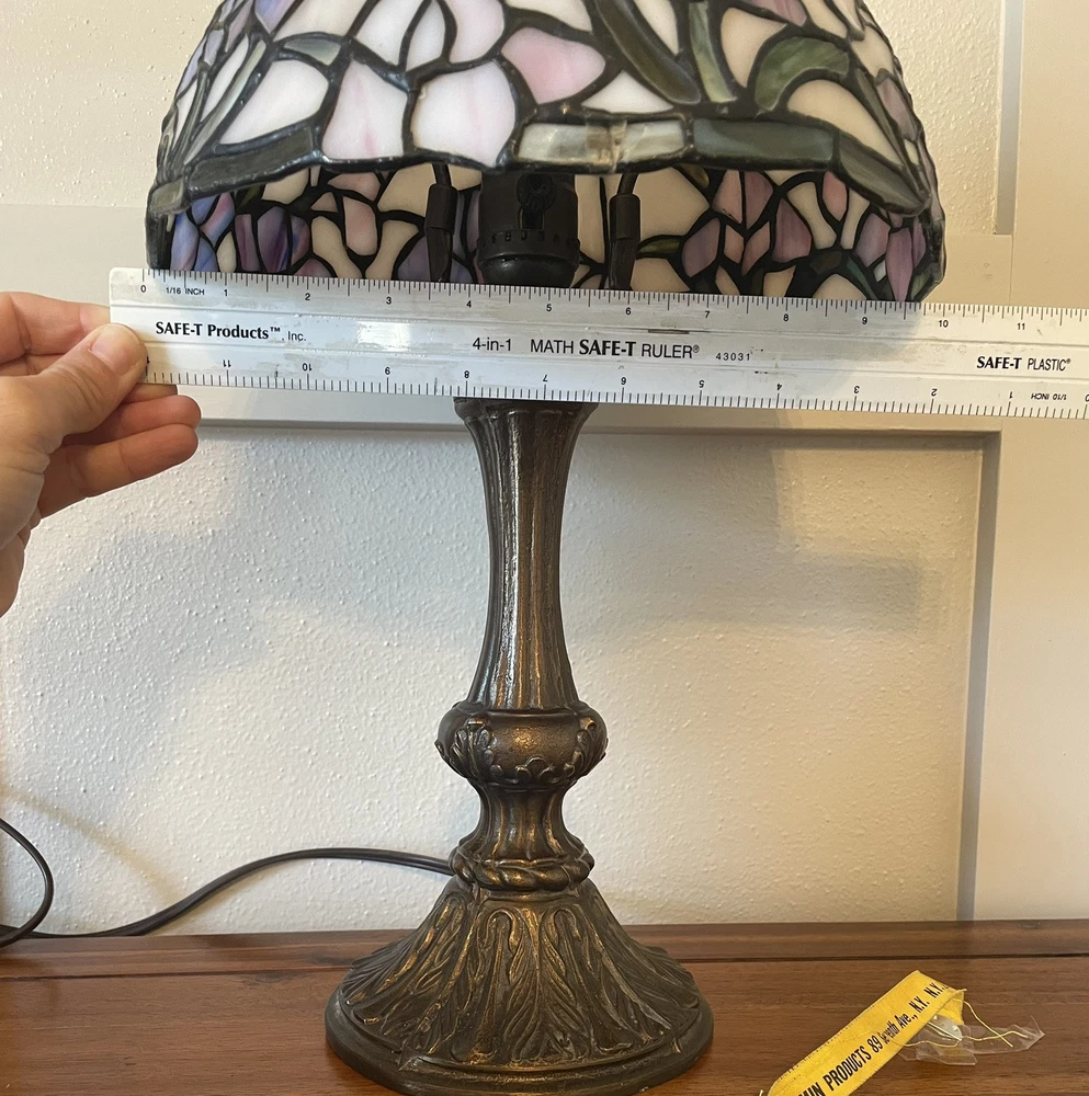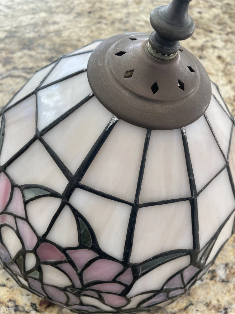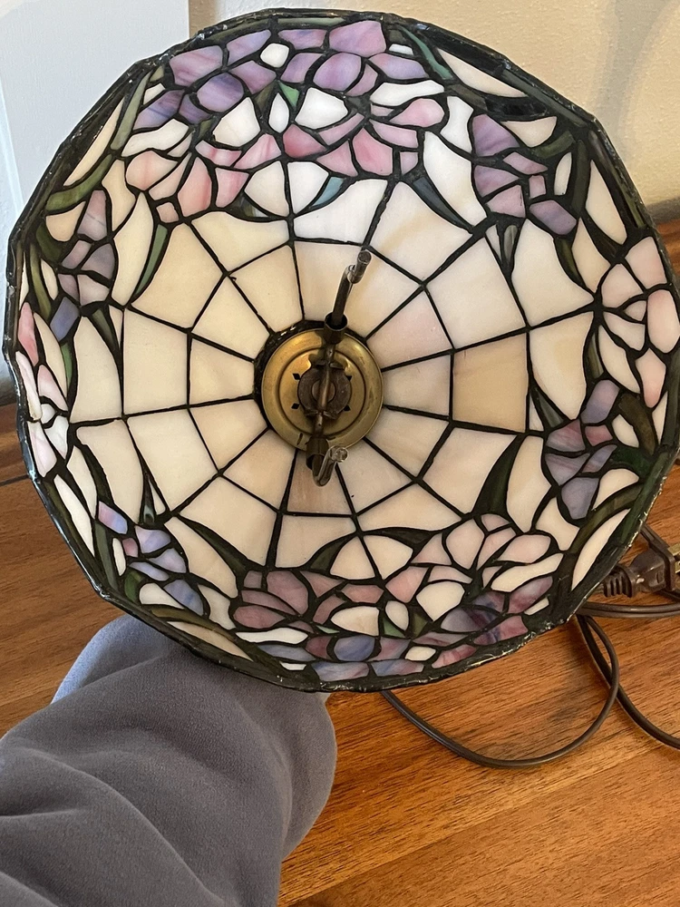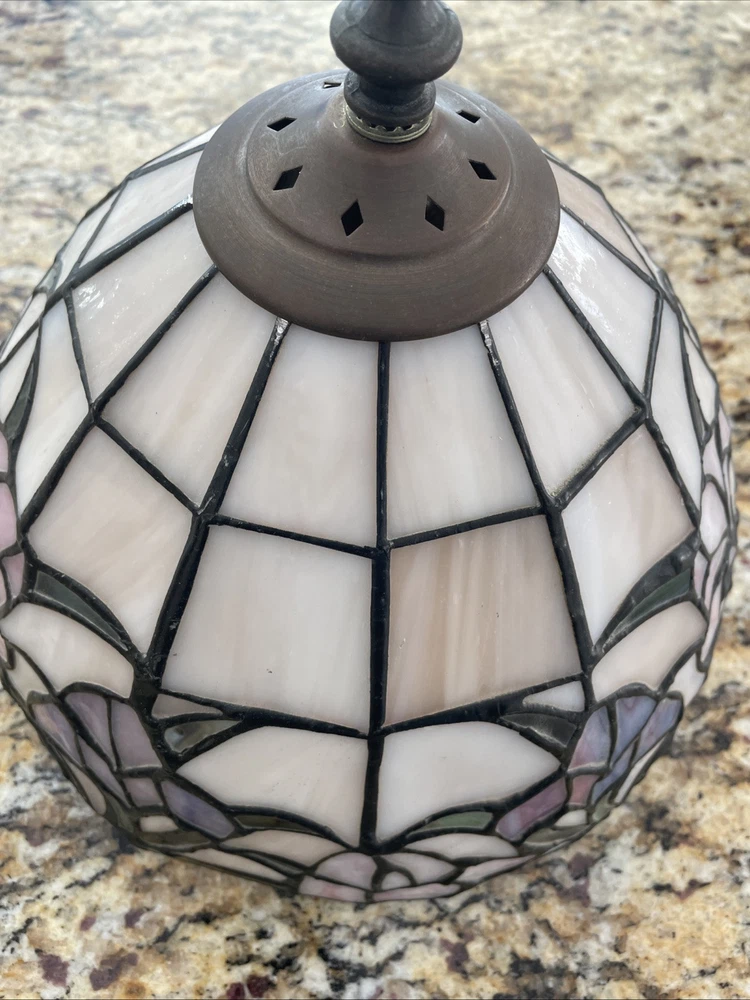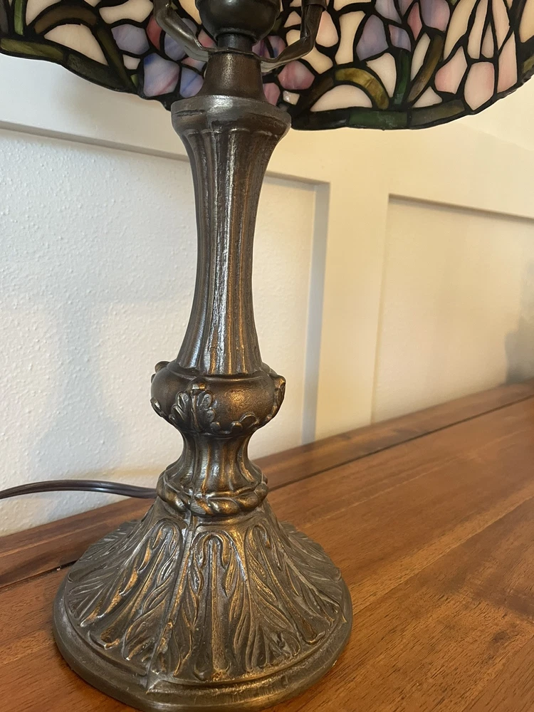Add a touch of vintage elegance to your home with this beautiful Tiffany style table lamp. The stained glass shade features a stunning bouquet of purple and pink flowers, while the metal base and corded electric power source ensure lasting use. This lamp is the perfect addition to any Victorian style decor, with a round shade shape and multicolor design that will brighten up any room. Measuring 17 1/2-18 inches in height, this Leviton brand lamp is a must-have for any collector or lighting enthusiast. 2 small cracks shown in photos. Preowned works great. Original packaging not included.