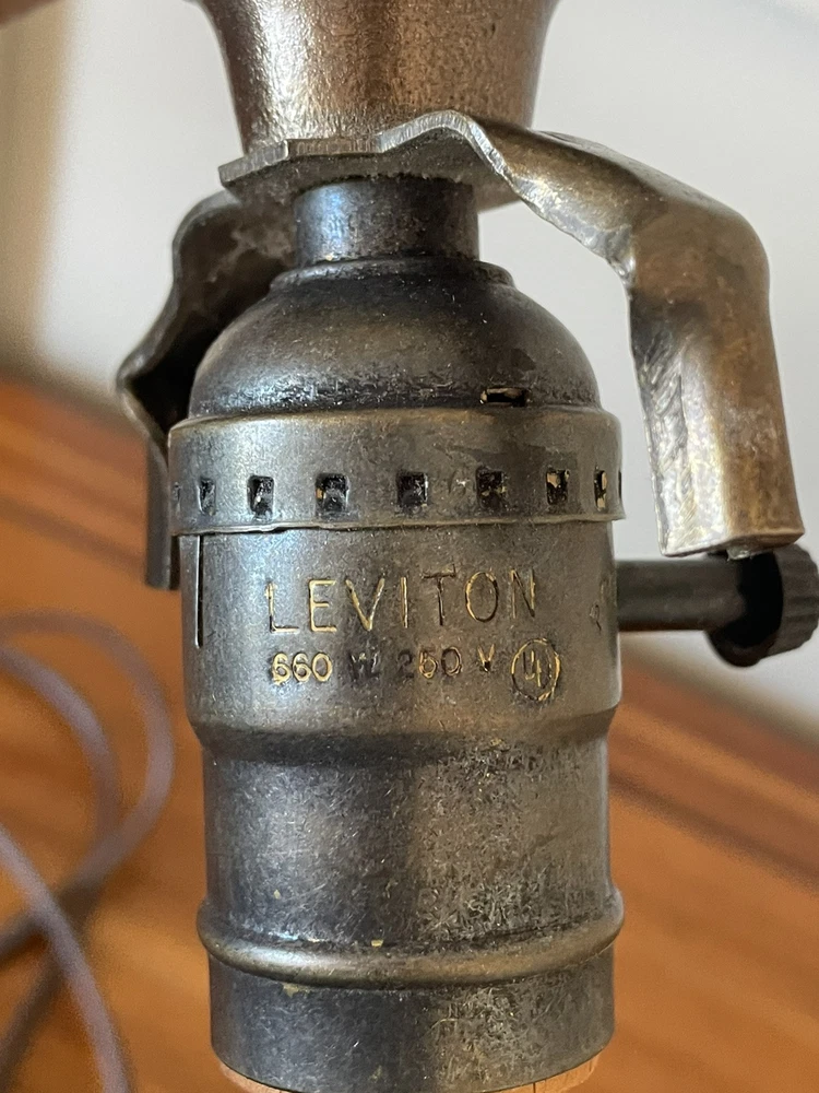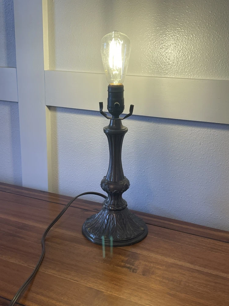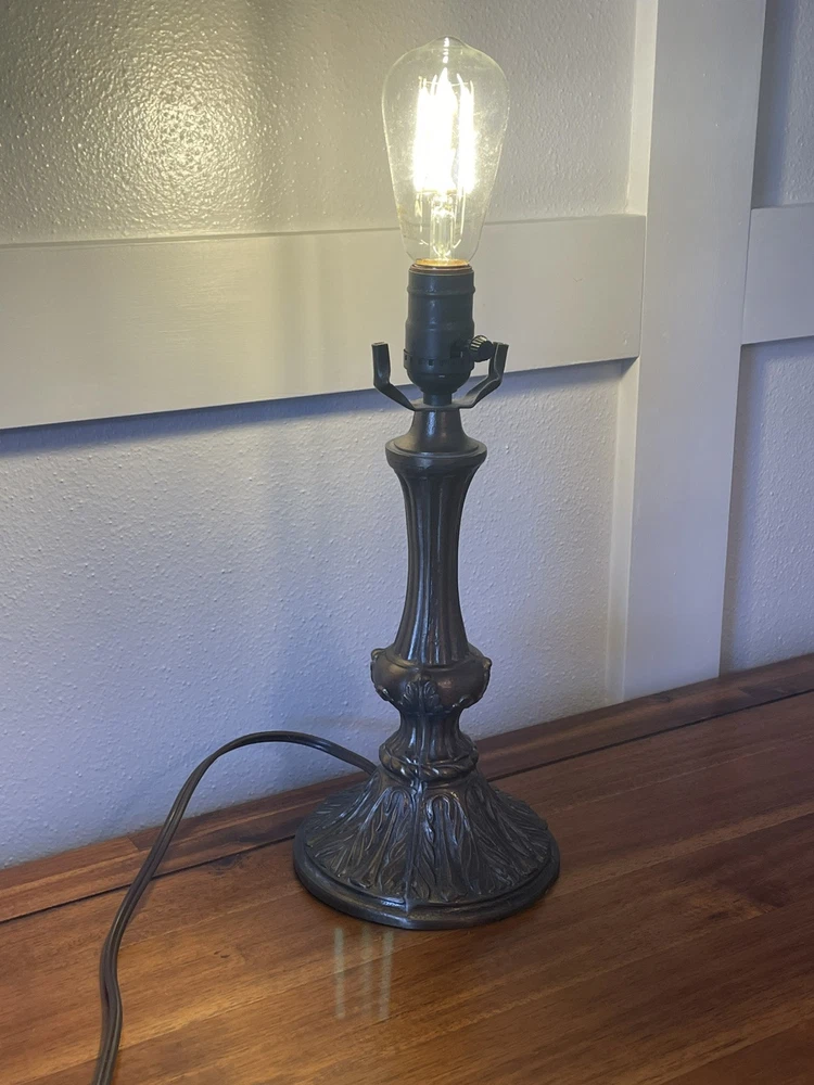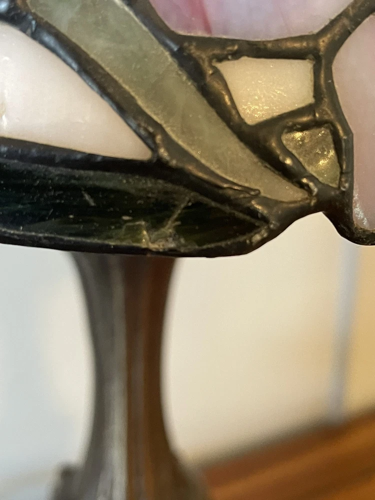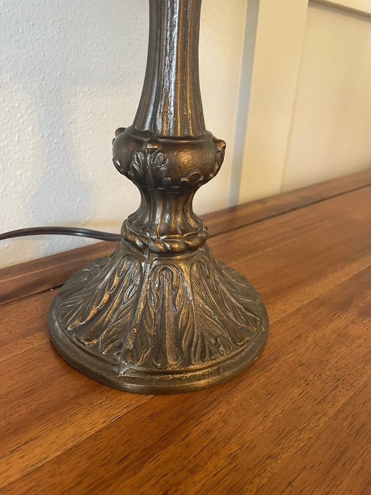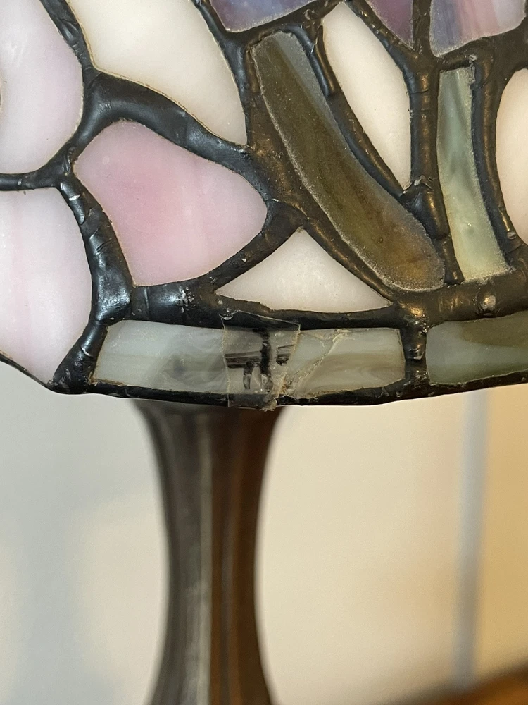 Add a touch of vintage elegance to your home with this beautiful Tiffany style table lamp. The stained glass shade features a stunning bouquet of purple and pink flowers, while the metal base and corded electric power source ensure lasting use. This lamp is the perfect addition to any Victorian style decor, with a round shade shape and multicolor design that will brighten up any room. Measuring 17 1/2-18 inches in height, this Leviton brand lamp is a must-have for any collector or lighting enthusiast. 2 small cracks shown in photos. Preowned works great. Original packaging not included.