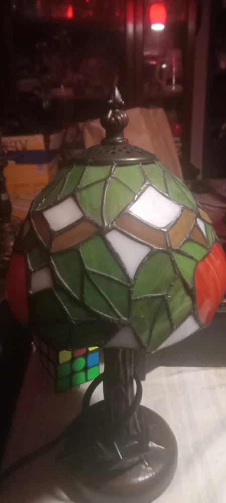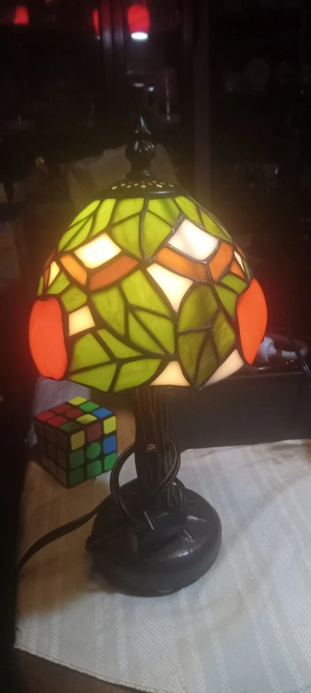 Stained glass table lamp very colorful lamp base recently rewired with extra weight put in it has kind of a tree theme on the base overall a very nice lamp