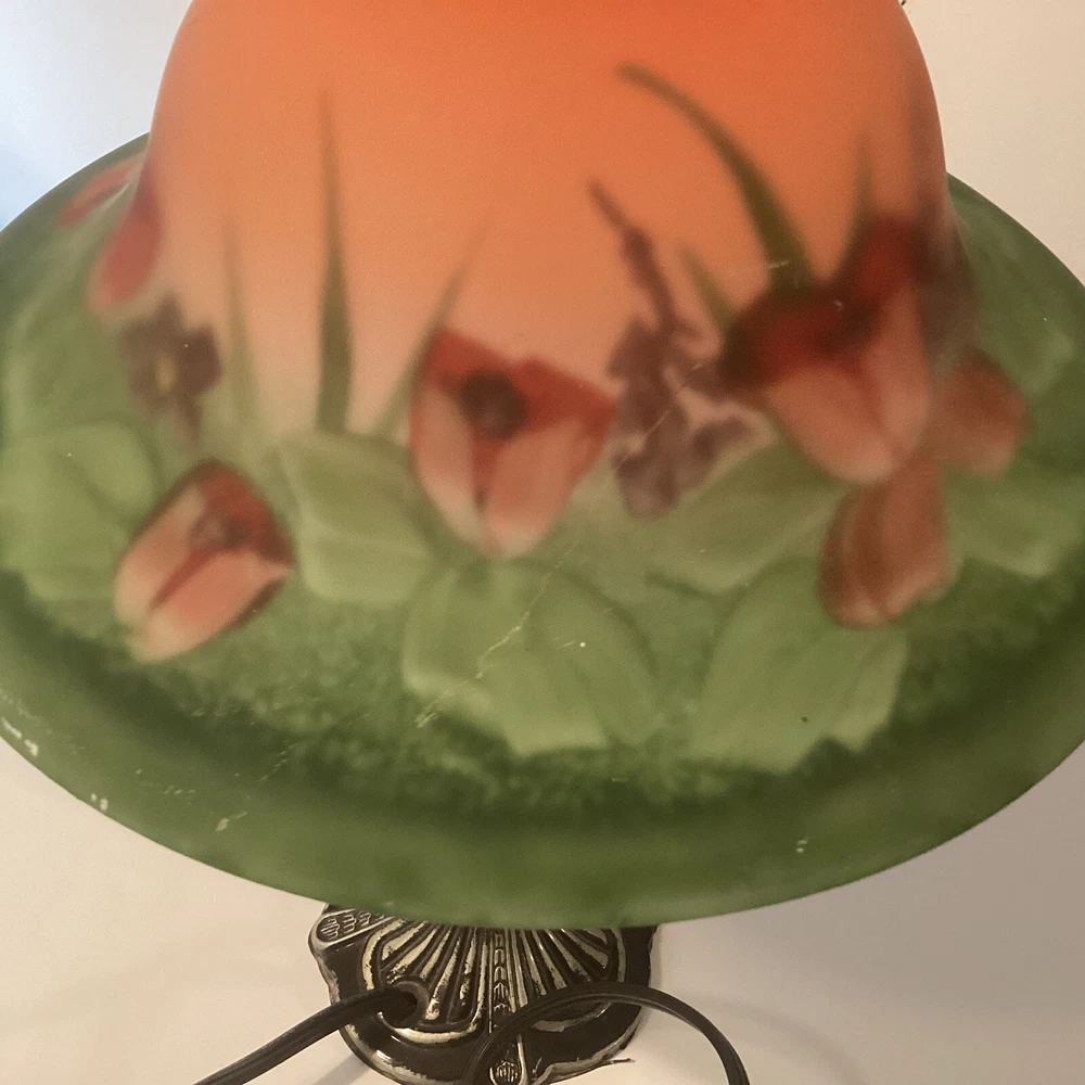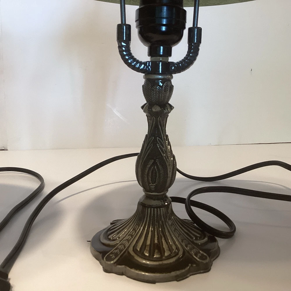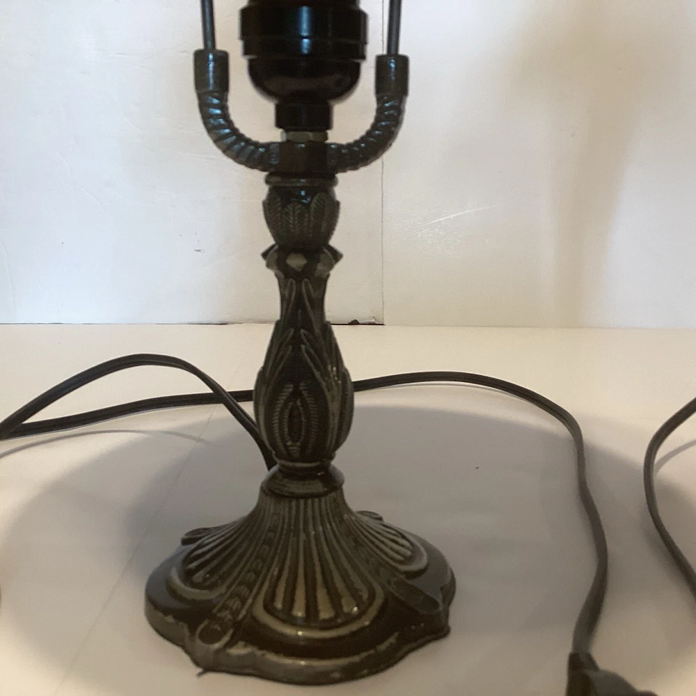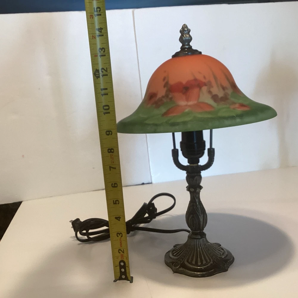 Very good preowned condition Measurements are in pictures Will be packed very carefully Floral glass shade Ornate metal base very detailed Approximately 14” H Please feel free to reach out with any questions