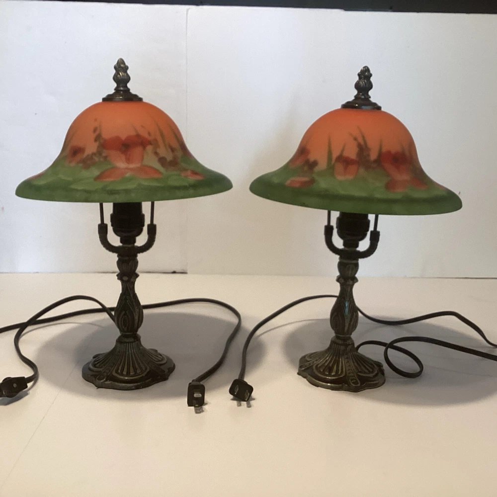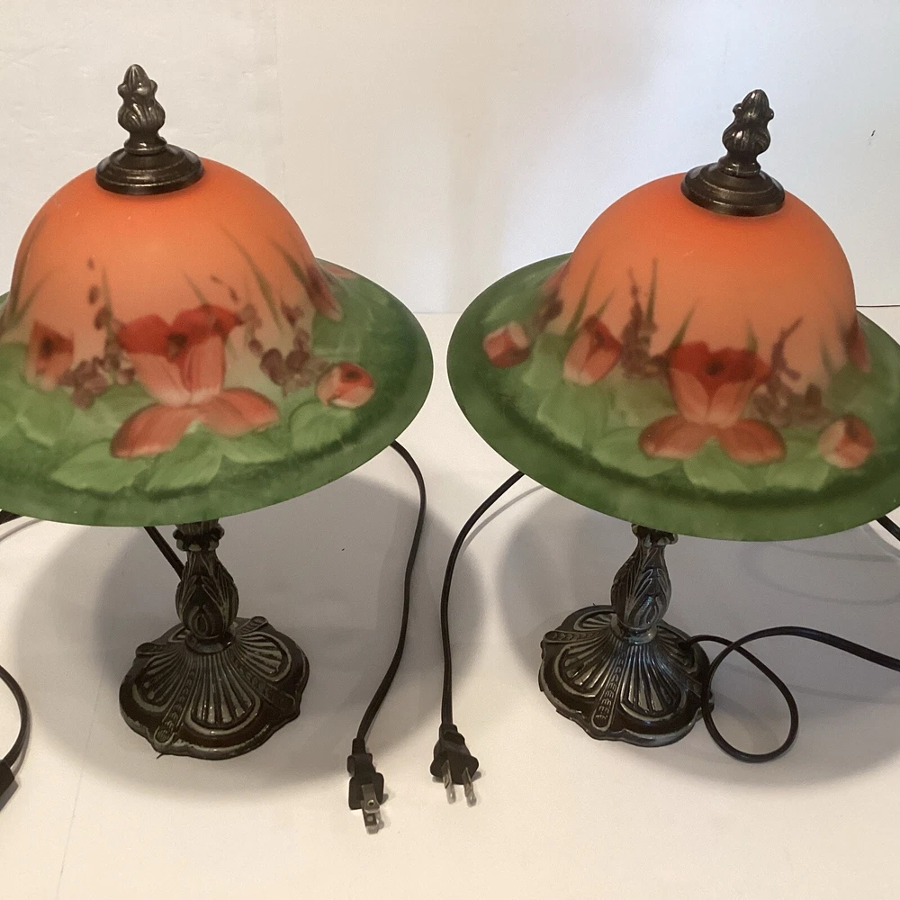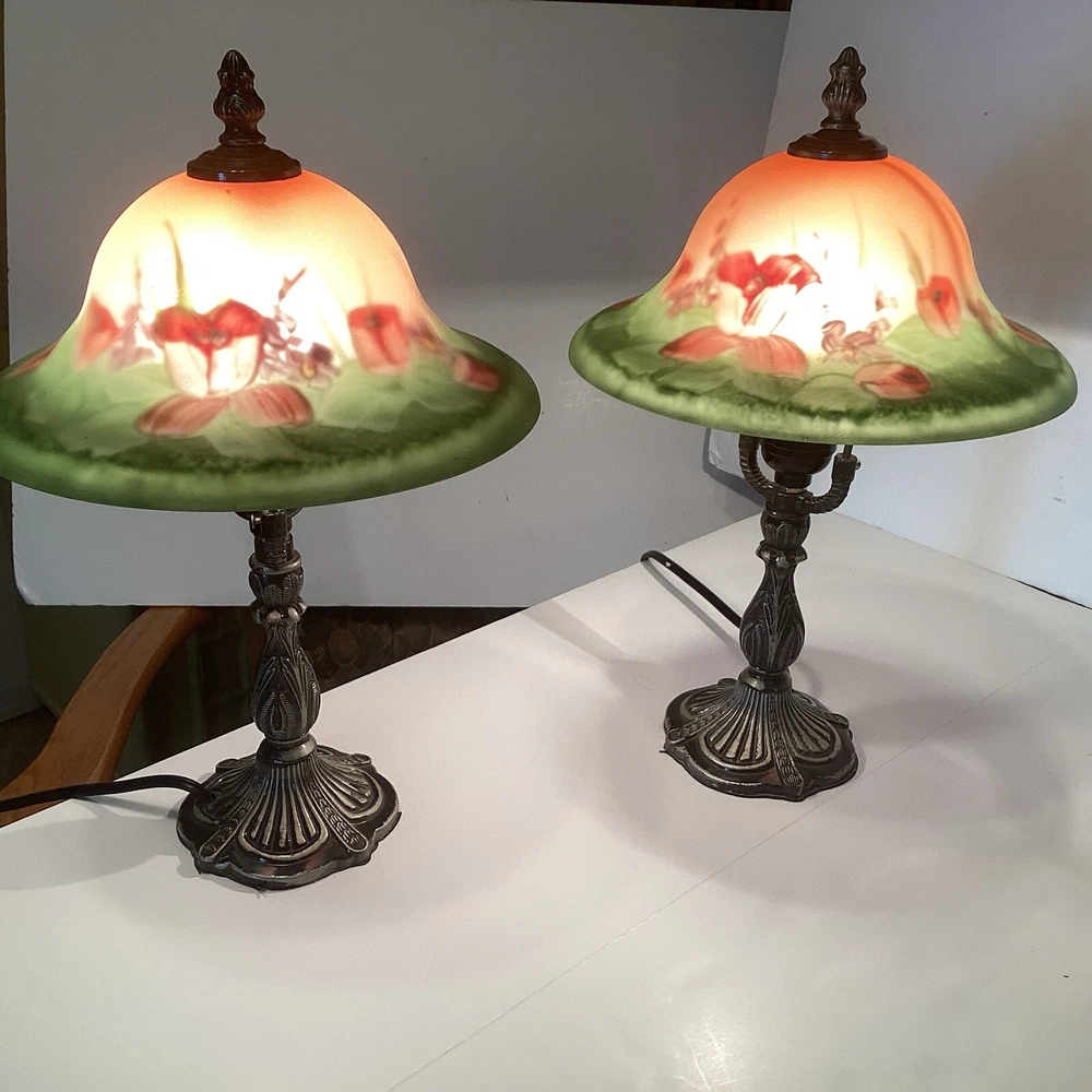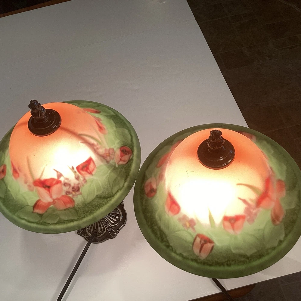 Very good preowned condition Measurements are in pictures Will be packed very carefully Floral glass shade Ornate metal base very detailed Approximately 14” H Please feel free to reach out with any questions