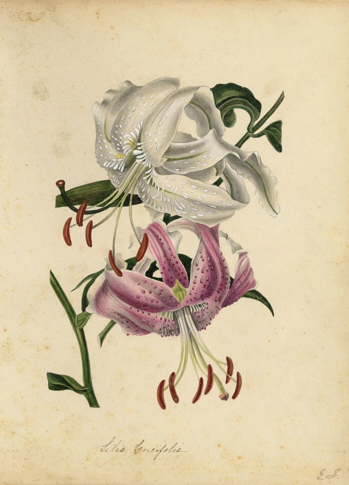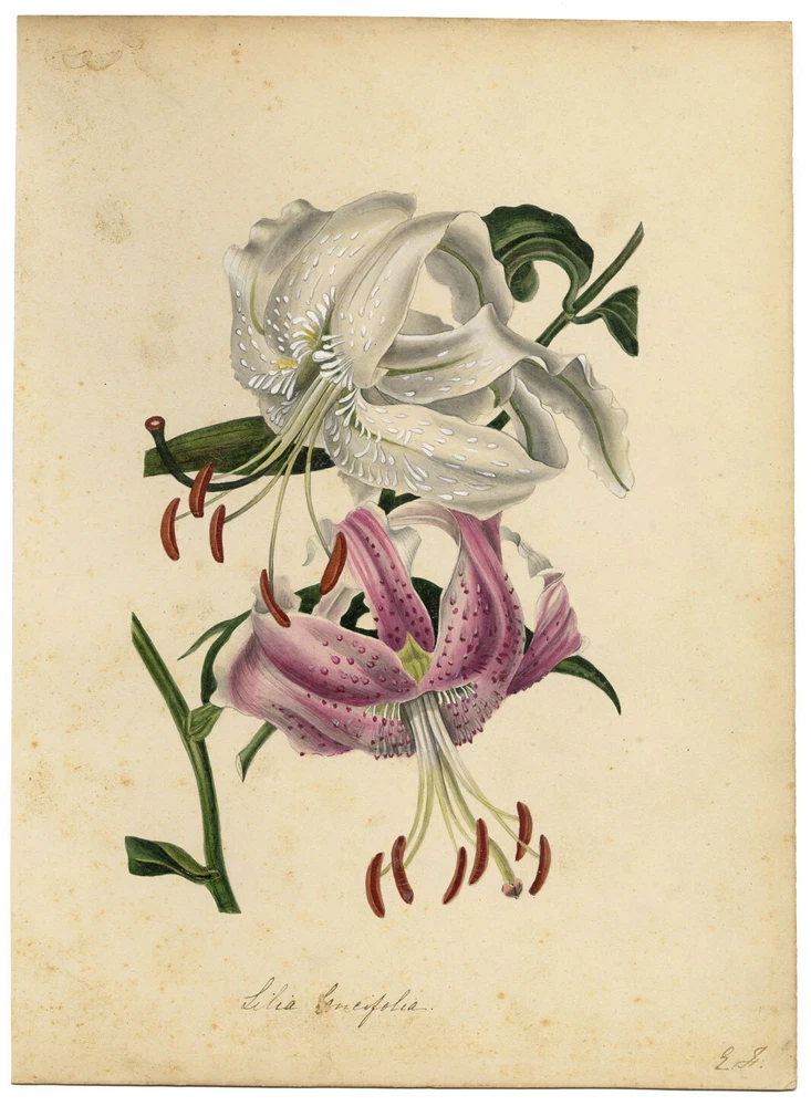 View All Subject Abstract Animals Architectural Botanical Cartoon Children Cityscape | Townscape Decorative Arts Fashion | Costume Floral | Gardens Food | Wine Genre Illustration Landscape Military Music | Instruments Mythical | Fantasy Life Drawing Political Portrait Religious | Inspirational Seascape | Marine Still Life Transport Medium Acrylic Aquatint Chalk Charcoal Engraving Etching Gouache Graphite Linocut Lithograph Mezzotint Mixed Media Oil Pastel Pen & Ink Pith Painting Watercolour Woodblock Woodcut | Wood Engraving Tiger Lily Flower after Augusta Innes Withers – mid-C19th watercolour painting An original mid-19th-century watercolour painting, E.F., Lilium Lancifolium (Tiger Lily) Flower after Augusta Innes Withers. A bold and vibrant original botanical watercolour dating from an era considered the Golden Age of Botany. This painting is after an illustration by the renowned botanical artist Augusta Innes Withers published in Robert Thompson's 'The Gardeners Assistant', 1859. Hand-drawn in pencil then coloured in watercolour, with the addition of gum arabic to intensify the colour. This painting is one of a collection that we have for sale by two Victorian hands, initialled A.F. and E.F, who were likely to be sisters. The paintings in the collection are copies after botanical plates published at the time, principally from Joseph Paxton's 'Magazine of Botany', published in sixteen volumes from 1834 to 1849. Other examples are from Robert Thompson's 'The Gardener's Assistant' and Louis van Houtte's 'Flore des Serres'. Some are after the noted botanical illustrator Augusta Innes Withers. In graphite with watercolour, bodycolour and gum arabic to intensify the colour. On card. Details Signed: Initialled lower right. Inscribed: Inscribed lower centre. Dated: -- Height (cm): 27.6 Width (cm): 19.8 Height (inches): 10.87 Width (inches): 7.8 Condition: Some age toning as shown, particularly around the periphery of the sheet. The picture may have other minor imperfections such as slight marks, foxing, creasing or pinholes, commensurate with age. Please see photos for detail. Presented: Unframed. Stock Number: JZ-671 All artworks come with a Certificate of Authenticity and—if it is a collection artwork—its accompanying collection text or artist biography. Contact What We Offer Our Listings About Us Delivery Returns Contact We welcome all enquiries. If you have a question about a specific artwork, it is helpful if you can please quote the 'stock number' listed towards the top of the product description (e.g. JG-347), in order to help identify the work. Please see our Business Seller Information below for contact details. Our gallery is exclusively online. Should you wish to view an artwork in person, please contact us to arrange an appointment (Monday to Friday, 9.30am–5.00pm). Please provide the 'stock number' (e.g. JG-347) of the artworks that you are interested in so that we can get them out of storage for you. As all artworks are kept in storage, please note that general browsing is not possible. The Somerset & Wood Guarantee It is our absolute priority that your buying experience at Somerset & Wood is of the highest quality. This extends from the accuracy of our listings and depth of research, to the diligence of our communication, and the care taken with our packing. We believe that these principles are as important for a low priced artwork as an expensive piece; we are committed to offering affordable art with high 'added value' and to keeping our prices as low as possible. Included with your order you will receive: Certificate of Authenticity (COA) Supplying a COA when selling an artwork is a long-established convention. It is all the more pertinent in today’s online marketplace, where as a buyer you commit to purchase without the opportunity to view and scrutinise the work. By providing a COA with every artwork, backed by our knowledge and expertise, we are vouching that a work is of the stated age and authorship. Accompanying Text for all Collection Works or Listed Artists A printed copy of the accompanying collection text is provided with all artworks that form part of a larger collection, or for listed artists an artist biography is included. This provides 'the story behind the artwork', which can be kept for future reference and enhances the value of an individual piece. Please note that on the rare occasions that an artwork is not part of a collection and has no known artist biography, no text will be included. Free Delivery Worldwide We are pleased to offer Free Delivery Worldwide on every order, regardless of value or destination. Quality Packaging We have the expertise in handling and packing required to ensure your artwork is received in the condition in which it left us. We use high quality envelopes, board, card, tubes and boxes, to give the best possible protection in transit. We believe that receiving a beautifully presented parcel in the post is still one of life’s small pleasures, and we take pride in delivering this experience for our customers. No Quibble Returns We understand that when buying online you do not have the opportunity to scrutinise an artwork in person. We therefore offer complete assurance that you can return the artwork if it does not meet with expectation for any reason. Colour We take care to ensure that our descriptions and images are as accurate as possible. It is important to us that the artwork you receive meets your expectations from viewing it on screen. We produce our digital images through a colour managed workflow and colour-check the images on a calibrated screen. Please note that colours can appear slightly different depending on the calibration of the screen on which they are viewed. If there is a significant variation in colour between our image and the actual artwork we will state this in the listing. If you have any questions about colour do contact us and we will be happy to help. Condition Depending on paper type, some 